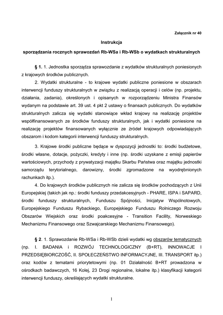 Załącznik nr 40 Instrukcja sporządzania rocznych sprawozdań Rb-WSa i Rb-WSb o wydatkach strukturalnych § 1. 1. Jednostka sporządza sprawozdanie z wydatków strukturalnych poniesionych z krajowych środków publicznych. 2. Wydatki strukturalne - to krajowe wydatki publiczne poniesione w obszarach interwencji funduszy strukturalnych w związku z realizacją operacji i celów (np. projektu, działania, zadania), określonych i opisanych w rozporządzeniu Ministra Finansów wydanym na podstawie art. 39 ust. 4 pkt 2 ustawy o finansach publicznych. Do wydatków strukturalnych zalicza się wydatki stanowiące wkład krajowy na realizację projektów współfinansowanych ze środków funduszy strukturalnych, jak i wydatki poniesione na realizację projektów finansowanych wyłącznie ze źródeł krajowych odpowiadających obszarom i kodom kategorii interwencji funduszy strukturalnych. 3. Krajowe środki publiczne będące w dyspozycji jednostki to: środki budŜetowe, środki własne, dotacje, poŜyczki, kredyty i inne (np. środki uzyskane z emisji papierów wartościowych, przychody z prywatyzacji majątku Skarbu Państwa oraz majątku jednostki samorządu terytorialnego, darowizny, środki zgromadzone na wyodrębnionych rachunkach itp.). 4. Do krajowych środków publicznych nie zalicza się środków pochodzących z Unii Europejskiej (takich jak np.: środki funduszy przedakcesyjnych - PHARE, ISPA i SAPARD, funduszy środki strukturalnych, Funduszu Spójności, Inicjatyw Wspólnotowych, Europejskiego Funduszu Rybackiego, Europejskiego Funduszu Rolniczego Rozwoju Obszarów Wiejskich oraz środki poakcesyjne - Transition Facility, Norweskiego Mechanizmu Finansowego oraz Szwajcarskiego Mechanizmu Finansowego). § 2. 1. Sprawozdanie Rb-WSa i Rb-WSb dzieli wydatki wg obszarów tematycznych (np. I. BADANIA i ROZWÓJ TECHNOLOGICZNY (B+RT), INNOWACJE I PRZEDSIĘBIORCZOŚĆ, II. SPOŁECZEŃSTWO INFORMACYJNE, III. TRANSPORT itp.) oraz kodów z tematami priorytetowymi (np. 01 Działalność B+RT prowadzona w ośrodkach badawczych, 16 Kolej, 23 Drogi regionalne, lokalne itp.) klasyfikacji kategorii interwencji funduszy, określających wydatki strukturalne. 1 2. Do obliczenia wydatków strukturalnych jednostka powinna przyjąć wydatki faktycznie poniesione w okresie sprawozdawczym, udokumentowane opłaconą fakturą lub innym równowaŜnym dokumentem księgowym. Nie uwzględnia się wszelkiego rodzaju kar, grzywien, odsetek od zaległości oraz wydatków, które mogą zostać odzyskane (zwrócone jednostce zgodnie z obowiązującymi uregulowaniami prawnymi), np. podatku od towarów i usług (VAT). 3. W przypadku realizacji zadań finansowanych z udziałem środków UE jednostka nie wykazuje wydatków, które podlegają refundacji ze środków UE, niezaleŜnie od tego, kiedy refundacja nastąpi. Powinna natomiast wykazać wydatki poniesione w części stanowiącej wkład publiczny krajowy (współfinansowanie krajowe). 4. W celu wyeliminowania wielokrotnego liczenia tych samych wydatków przez róŜne jednostki naleŜy sporządzić sprawozdanie skonsolidowane, tj. bez uwzględnienia przepływów środków finansowych: 1) wewnętrznych (w ramach jednostki i podległych jej jednostek organizacyjnych oraz nadzorowanych); 2) wewnątrzsektorowych (pomiędzy jednostkami sektora). Dla przykładu: 1) przekazanie środków finansowych na realizację zadania jednostce organizacyjnej lub nadzorowanej jest przepływem środków finansowych wewnątrz jednostki, a nie wydatkiem związanym z realizacją zadania. Wydatek z tych środków wykaŜe w sprawozdaniu jednostkowym jednostka organizacyjna, która realizuje zadanie; 2) przekazanie środków finansowych na zadanie realizowane przez inną jednostkę sektora jest przepływem środków finansowych pomiędzy jednostkami sektora finansów publicznych. Wydatek ten powinien być wykazany wyłącznie przez jednostkę, która realizowała dane zadanie. 5. W przypadku przekazania środków finansowych przez jednostkę na zadanie realizowane przez jednostkę niezaliczoną do sektora, przepływ środków jest wydatkiem jednostki przekazującej środki, który naleŜy wykazać w sprawozdaniu. 6. Jednostka sporządza sprawozdanie łączne/zbiorcze i skonsolidowane obejmujące wydatki jednostki i wydatki wykazane w sprawozdaniach jednostkowych sporządzanych przez jednostki organizacyjne i nadzorowane. 7. Jednocześnie jednostka podaje na końcu formularza sprawozdania w polu pt. „Liczba sprawozdań jednostkowych objętych sprawozdaniem łącznym/zbiorczym” – liczbę sprawozdań jednostkowych ujętych w sprawozdaniu. 2 § 3. W celu wyodrębnienia wydatków strukturalnych z wydatków poniesionych w danym okresie sprawozdawczym jednostka powinna prowadzić dodatkową ewidencję wydatków strukturalnych, stosownie do przepisów zawartych w rozporządzeniach Ministra Finansów wydanych na postawie art. 17 i 40 ust. 4 pkt 1 lit. a ustawy o finansach publicznych. Prowadzenie tej ewidencji umoŜliwi ustalenie wysokości wydatków poniesionych na cele strukturalne. § 4. 1. Sprawozdanie Rb-WSa sporządzają jednostki wymienione w § 4 pkt 5 rozporządzenia. 2. Jednostki organizacyjne i nadzorowane przez jednostki samorządu terytorialnego przekazują w terminie do dnia 31 marca po upływie okresu sprawozdawczego sprawozdanie jednostkowe właściwej jednostce, która sporządzi sprawozdanie zbiorcze i skonsolidowane. 3. Sprawozdanie formularzu, Rb-WSa zamieszczonym na powinno stronie być sporządzone internetowej na obowiązującym Ministerstwa Finansów (www.mofnet.gov.pl) w zakładce: Finanse publiczne > BudŜet państwa > Klasyfikacja wydatków strukturalnych, którego wzór stanowi załącznik nr 30 do rozporządzenia. 4. Jednostki zobowiązane do sporządzania sprawozdania (zbiorczego) przekazują sprawozdanie do Ministerstwa Finansów – Departamentu Polityki Regionalnej i Rolnictwa w formie dokumentu i formie elektronicznej na adres: [email protected] w terminie do