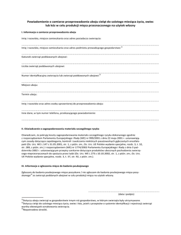 Powiadomienie o zamiarze przeprowadzenia uboju cieląt do szóstego miesiąca życia, owiec lub kóz w celu produkcji mięsa przeznaczonego na użytek własny I. Informacja o zamiarze przeprowadzenia uboju Imię i nazwisko, miejsce zamieszkania oraz adres posiadacza zwierzęcia: ....................................................................................................................................................................................................... 1) Imię i nazwisko, miejsce zamieszkania oraz adres podmiotu prowadzącego gospodarstwo: ....................................................................................................................................................................................................... Gatunek zwierząt poddawanych ubojowi: ....................................................................................................................................................................................................... Liczba zwierząt poddawanych ubojowi: ....................................................................................................................................................................................................... 2) Numer identyfikacyjny zwierzęcia lub zwierząt poddawanych ubojowi: ....................................................................................................................................................................................................... Miejsce uboju: ....................................................................................................................................................................................................... Termin uboju: ....................................................................................................................................................................................................... Imię i nazwisko oraz adres osoby uprawnionej do przeprowadzenia uboju: ....................................................................................................................................................................................................... Inne dane, w tym numer telefonu, przekazującego powiadomienie: ....................................................................................................................................................................................................... II. Oświadczenie o zagospodarowaniu materiału szczególnego ryzyka Oświadczam, że pokryję koszty zagospodarowania materiału szczególnego ryzyka dokonanego zgodnie z rozporządzeniem Parlamentu Europejskiego i Rady (WE) nr 999/2001 z dnia 22 maja 2001 r. ustanawiającym zasady dotyczące zapobiegania, kontroli i zwalczania niektórych pasażowalnych gąbczastych encefalopatii (Dz. Urz. WE L 147 z 31.05.2001, str. 1, z późn. zm.; Dz. Urz. UE Polskie wydanie specjalne, rozdz. 3, t. 32, str. 289, z późn. zm.) i rozporządzeniem (WE) nr 1774/2002 Parlamentu Europejskiego i Rady z dnia 3 października 2002 r. ustanawiającym przepisy sanitarne dotyczące produktów ubocznych pochodzenia zwierzęcego nieprzeznaczonych do spożycia przez ludzi (Dz. Urz. WE L 273 z 10.10.2002, str. 1, z późn. zm.; Dz. Urz. UE Polskie wydanie specjalne, rozdz. 3, t. 37, str. 92, z późn. zm.). III. Informacja o zgłoszeniu mięsa do badania poubojowego Zgłaszam do badania poubojowego mięso pozyskane / nie zgłaszam do badania poubojowego mięsa pozy3) skanego ze zwierząt poddanych ubojowi w celu produkcji mięsa na użytek własny. ....................................................................................................... (data i podpis) 1) Dotyczy uboju zwierząt w gospodarstwie innym niż gospodarstwo, w którym zwierzęta były utrzymywane. Dotyczy cieląt do szóstego miesiąca życia, owiec i kóz, jeżeli z przepisów o systemie identyfikacji i rejestracji zwierząt wynika obowiązek oznakowania zwierzęcia. 3) Niepotrzebne skreślid. 2)