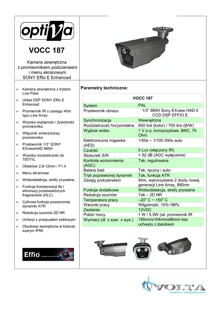 VOCC 187 Kamera zewnętrzna z promiennikiem podczerwieni i menu ekranowym SONY Effio E Enhanced • Kamera zewnętrzna z trybem Low Pass • Układ DSP SONY Effio E Enhanced • Promiennik IR o zasięgu 40m typu Line Array • Wysoka wydajność i żywotność promiennika • Włącznik zmierzchowy promiennika • Przetwornik 1/3” SONY EXviewHAD 960H • Wysoka rozdzielczość do 700TVL • Obiektyw 2,8-12mm / F1.4 • Menu ekranowe • Wideodetekcja, strefy prywatne, • Funkcja kompensacji tła i eliminacji prześwietlonych fragmentów (HLC) • Cyfrowa funkcja poszerzonej dynamiki ATR • Redukcja szumów 2D NR • Uchwyt z przepustem kablowym • Obudowa zewnętrzna w kolorze szarym IP66 Parametry techniczne: VOCC 187 System Przetwornik obrazu Synchronizacja Rozdzielczość horyzontalna Wyjście wideo Elektroniczna migawka (AES) Czułość Stosunek S/N Kontrola wzmocnienia (AGC) Balans bieli Tryb poprawionej dynamiki Zasięg podczerwieni Funkcja dodatkowe Redukcja szumów Temperatura pracy Warunki pracy Zasilanie Pobór mocy Wymiary (dł. x szer. x wys.) PAL 1/3” 960H Sony EXview HAD II CCD DSP EFFIO E Wewnętrzna 650 linii (kolor) / 700 linii (B/W) 1 V p-p, kompozytowe, BNC, 75 Ohm 1/50s ~ 1/100 000s auto 0 Lux (włączony IR) > 52 dB (AGC wyłączone) Tak, regulowana Tak, ręczny i auto Tak, funkcja ATR 40m, wykorzystane 2 diody nowej generacji Line Array, 880nm Wideodetekcja, strefy prywatne Tak – 2D NR –20o C ~ +50o C Wilgotność: 10%~98% 12VDC 1 W / 5,5W (wł. promiennik IR 195mmx104mmx86mm bez uchwytu z daszkiem
