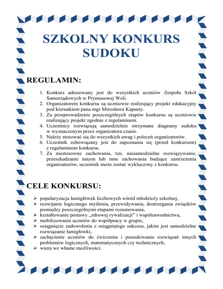 SZKOLNY KONKURS SUDOKU REGULAMIN: 1. Konkurs adresowany jest do wszystkich uczniów Zespołu Szkół Samorządowych w Prymusowej Woli. 2. Organizatorem konkursu są uczniowie realizujący projekt edukacyjny pod kierunkiem pana mgr Mirosława Kapusty. 3. Za przeprowadzenie poszczególnych etapów konkursu są uczniowie realizujący projekt zgodnie z regulaminem. 4. Uczestnicy rozwiązują samodzielnie otrzymane diagramy sudoku w wyznaczonym przez organizatora czasie. 5. Należy stosować się do wszystkich uwag i poleceń organizatorów. 6. Uczestnik zobowiązany jest do zapoznania się (przed konkursem) z regulaminem konkursu. 7. Za niestosowne zachowania, tzn. niesamodzielne rozwiązywanie, przeszkadzanie innym lub inne zachowania budzące zastrzeżenia organizatorów, uczestnik może zostać wykluczony z konkursu. CELE KONKURSU: popularyzacja łamigłówek liczbowych wśród młodzieży szkolnej, rozwijanie logicznego myślenia, przewidywania, dostrzegania związków pomiędzy poszczególnymi etapami rozumowania, kształtowanie postawy „zdrowej rywalizacji” i współzawodnictwa, mobilizowanie uczniów do współpracy w grupie, osiągnięcie zadowolenia z osiągniętego sukcesu, jakim jest samodzielne rozwiązanie łamigłówki, zachęcienie uczniów do ćwiczenia i poszukiwania rozwiązań innych problemów logicznych, matematycznych czy technicznych, wiera we własne możliwości. STRUKTURA I PRZEBIEG KONKURSU: 1. Uczniowie zgłaszają się indywidualnie do konkursu poprzez wysłanie wiadomości e-mail zawierającej: Temat – Konkurs SUDOKU; w treści: Imię i nazwisko oraz klasę na adres: [email protected] 2. Konkurs składa się z trzech etapów; 3. Na każdym etapie konkursu uczestnik otrzyma do rozwiązania zadania o różnym stopniu trudności – łatwe, średnio trudne, trudne; 4. Uczestnik otrzyma kolejno: na etapie pierwszym (pisemny w szkole): 2 diagramy łatwe oraz jeden średnio trudny, na etapie drugim (pisemny w szkole) 3 diagramy łatwe oraz 2 średnio trudny, etap trzeci będzie odbywał się drogą elektroniczną, w którym do rozwiązania będzie 10 diagramów sudoku. 5. Czas przeznaczony na poszczególne części: etap I – 35 minut (po 10 minut na każdy diagram łatwy, po 15 minut na każdy diagram o średnim stopniu trudności); etap II – 60 minut; etap III – 2,5 godz (5 diagramów łatwych, 3 – średnio trudne oraz 2 trudne) 6. Po upływie czasu przeznaczonego na wykonanie zadań prace zostają zebrane od uczestnika; 7. Każdy z diagramów jest oceniany według algorytmu: „81 punktów – liczba błędów – liczba pustych pól”; 8. Za wcześniejsze poprawne rozwiązanie diagramów (na każdym etapie) uczestnik otrzymuje dodatkowe 2 punkty za każdą minutę, która pozostała do regulaminowego zakończenia etapu; 9. Diagramy w I i II etapie wypełniane są ołówkiem; 10.Na ławce mogą znajdować się tylko ołówek i gumka do ścierania; 11.Nie można korzystać z żadnych dodatkowych urządzeń; 12.Jury wyłoni 3 zwycięzców; 13.Uczniowie wypełniają diagram sudoku ołówkiem, w przypadku błędu używają gumki, pola nieczytelnie wypełnione będą uznane jako błąd. PRZEBIEG KONKURSU: I ETAP – „ELIMINACJE” 16.01.2015r. (piątek) – ogłoszenie konkursu i przykładowe diagramy sudoku – do treningu, 16.01.2015 – 25.01.2015r. przyjmowanie zgłoszeń do konkursu, 27.01.2015r. (wtorek, 4-ta godzina lekcyjna w sali matematycznej) uczniowie rozwiązują 3 diagramy I etapu, 29.01.2015r. (czwartek) – ogłoszenie wyników I etapu i listy zakwalifikowanych osób do etapu II. II ETAP – „PÓŁFINAŁY” 17.02.2015r. (wtorek, 4-ta godzina lekcyjna w sali matematycznej) – każdy uczeń otrzyma do wypełnienia 5 diagramów sudoku, 19.02.2015r. – ogłoszenie listy uczniów zakwalifikowanych do finału konkursu. III ETAP – „FINAŁ” 27.02.2015r. (piątek, godzina 16.30) – finaliści drogą mailową otrzymają diagramy sudoku ze szczegółową instrukcją ich rozwiązania i przesłania rozwiązań do organizatora. Przy ocenie będą brane pod uwagę: poprawność rozwiązania, czas przesłania rozwiązań. PRZEWIDZIANE NAGRODY: Zwycięzca otrzyma tytuł „Szkolnego Mistrza Sudoku”, nagrodę rzeczową, dyplom oraz ocenę celującą z matematyki, Uczniowie, którzy zdobędą II i III miejsce otrzymają dyplom, nagrodę rzeczową oraz ocenę celującą z matematyki, Pozostali finaliści otrzymają ocenę bardzo dobrą z matematyki, Wszyscy uczestnicy otrzymają dyplomy za udział w konkursie; PODSUMOWANIE KONKURSU I WRĘCZENIE NAGRÓD: MARZEC 2015 ROKU