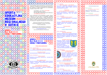 Lekcje muzealne, zajęcia warsztatowe, wycieczki prosimy zamawiać z tygodniowym wyprzedzeniem telefonicznie lub osobiście w Dziale Oświatowym od poniedziałku do piątku w godz. 10:00 – 15:00 tel. (24) 254 - 79 - 64 tel. 505 019 890 Muzeum Regionalne w Kutnie Plac Marszałka J. Piłsudskiego 20, 99-300 Kutno [email protected] "Wokół koła czyli jak człowiek nauczył się jeździć ?” Historia wynalezienia i zastosowania koła. Opowiadanie, prezentacja, filmy oraz zajęcia praktyczne. Lekcje odbywają się od poniedziałku do piątku. Zajęcia trwają od 45 do 60 minut. W przypadku rezygnacji z umówionych zajęć prosimy o szybką informację. Nie łączymy klas, zajęcia prowadzimy z grupami do 25 osób. Opłata za udział w lekcjach muzealnych wynosi 2,50 zł od osoby, zaś w zajęciach warsztatowych 5 zł od osoby. DZIAŁ PRZYRODY "Drapieżniki lasów polskich” Życie i zachowanie drapieżników w przyrodzie i w niewoli. Serdecznie zapraszamy do odwiedzania Muzeum Regionalnego w Kutnie i korzystania z oferty edukacyjnej. OFERTA DLA KLAS O-III DZIAŁ HISTORII "Niezwykły żołnierz - kapral Wojtek" Opowieść o najbardziej niezwykłym żołnierzu armii gen. Andersa - kapralu "Wojtku", który był niedźwiedziem brunatnym. Zachęcamy do zapoznawania się z bieżącymi wydarzeniami na stronie internetowej Muzeum www.muzeumkutno.com oraz na profilu Muzeum na Facebook'u. „Pierzaści mieszkańcy kraju” Określenie ornitologii jako przedmiotu i rozpoznawanie ptaków po wymiarach, ubarwieniu i odgłosach. "Zwierzęta leśne” Ssaki i ich zwyczaje. ZAJĘCIA WARSZTATOWE DZIAŁ ARCHEOLOGII "Nie święci garnki lepią” Okazja by zaznajomić się ze sztuką prawdziwego garncarstwa i poznać jego najdawniejsze dzieje. Zajęcia prowadzone na dziedzińcu Muzeum /od wiosny do jesieni, uzależnione od warunków pogodowych/. OFERTA DLA KLAS O-III TYTUŁY LEKCJI MUZEALNYCH DZIAŁ ARCHEOLOGII "Kutno – moje miasto w dawnych czasach" Historia Kutna od średniowiecza po czasy nowożytne. "Od jaskini do bloku" Jak mieszkali ludzie w dawnych czasach, a jak dzisiaj. DZIAŁ ETNOGRAFII "Ginące zawody" Bednarstwo, druciarstwo, folusznictwo - zawody, które przestały istnieć. "Przy wigilijnym stole" Pierwsza gwiazdka. Opłatek. Wigilia. Choinka. Pasterka. Tradycje i zwyczaje bożonarodzeniowe połączone z pracą plastyczną. "Czas świąteczny, wielkanocny. Od Niedzieli Palmowej po Lany Poniedziałek” Opowieści o zwyczajach i tradycjach wielkanocnych połączone z pracą plastyczną. „Poznajemy herby Kutna” Wykonanie herbów techniką wydzieranki. Lekcja ta wyjaśnia co to jest herb, jakie są jego elementy, przedstawia historię herbów kutnowskich. Za pomocą wydzieranki uczniowie utrwalają w pamięci wizerunek i kolorystykę herbów naszego miasta. DZIAŁ ETNOGRAFII „Cudeńka z kolorowego papieru wycinanka ludowa” Omówienie wzorów wycinanek ludowych charakterystycznych dla niektórych regionów Polski. Dzieci wykonują własnoręcznie wycinankę z kolorowego papieru. "Jak powstaje rzeźba?" "Jak powstaje haft ?" Spotkania z twórcami kutnowskimi. "Warsztaty ludowej plastyki papierowej i obrzędowej" Kartki wielkanocne i bożonarodzeniowe. Palemki, kwiaty z bibuły (do wyboru, zależnie od pory roku). DZIAŁ PRZYRODY "Domowe Z O O ” Origami - tworzenie zwierząt z kartki papieru. WYCIECZKI EDUKACYJNE DZIAŁ HISTORII „Poznajemy nasze miasto” Spacer po starym mieście. Pogadanka - Jak powstało miasto? DZIAŁ ETNOGRAFII „Z wizytą u rzeźbiarza” Wyjście do pracowni twórcy.