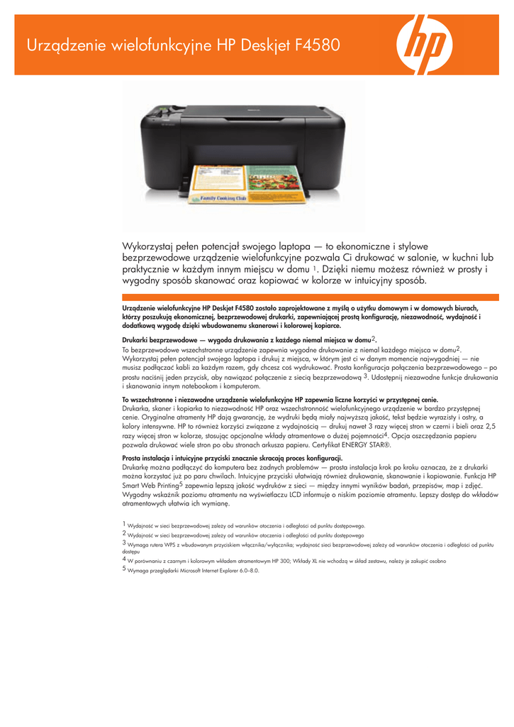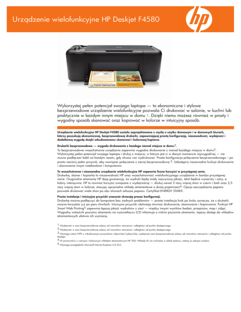 Urządzenie wielofunkcyjne HP Deskjet F4580 Wykorzystaj pełen potencjał swojego laptopa — to ekonomiczne i stylowe bezprzewodowe urządzenie wielofunkcyjne pozwala Ci drukować w salonie, w kuchni lub praktycznie w każdym innym miejscu w domu 1. Dzięki niemu możesz również w prosty i wygodny sposób skanować oraz kopiować w kolorze w intuicyjny sposób. Urządzenie wielofunkcyjne HP Deskjet F4580 zostało zaprojektowane z myślą o użytku domowym i w domowych biurach, którzy poszukują ekonomicznej, bezprzewodowej drukarki, zapewniającej prostą konfigurację, niezawodność, wydajność i dodatkową wygodę dzięki wbudowanemu skanerowi i kolorowej kopiarce. Drukarki bezprzewodowe — wygoda drukowania z każdego niemal miejsca w domu2. To bezprzewodowe wszechstronne urządzenie zapewnia wygodne drukowanie z niemal każdego miejsca w domu2. Wykorzystaj pełen potencjał swojego laptopa i drukuj z miejsca, w którym jest ci w danym momencie najwygodniej — nie musisz podłączać kabli za każdym razem, gdy chcesz coś wydrukować. Prosta konfiguracja połączenia bezprzewodowego – po prostu naciśnij jeden przycisk, aby nawiązać połączenie z siecią bezprzewodową 3. Udostępnij niezawodne funkcje drukowania i skanowania innym notebookom i komputerom. To wszechstronne i niezawodne urządzenie wielofunkcyjne HP zapewnia liczne korzyści w przystępnej cenie. Drukarka, skaner i kopiarka to niezawodność HP oraz wszechstronność wielofunkcyjnego urządzenie w bardzo przystępnej cenie. Oryginalne atramenty HP dają gwarancję, że wydruki będą miały najwyższą jakość, tekst będzie wyrazisty i ostry, a kolory intensywne. HP to również korzyści związane z wydajnością — drukuj nawet 3 razy więcej stron w czerni i bieli oraz 2,5 razy więcej stron w kolorze, stosując opcjonalne wkłady atramentowe o dużej pojemności4. Opcja oszczędzania papieru pozwala drukować wiele stron po obu stronach arkusza papieru. Certyfikat ENERGY STAR®. Prosta instalacja i intuicyjne przyciski znacznie skracają proces konfiguracji. Drukarkę można podłączyć do komputera bez żadnych problemów — prosta instalacja krok po kroku oznacza, że z drukarki można korzystać już po paru chwilach. Intuicyjne przyciski ułatwiają również drukowanie, skanowanie i kopiowanie. Funkcja HP Smart Web Printing5 zapewnia lepszą jakość wydruków z sieci — między innymi wyników badań, przepisów, map i zdjęć. Wygodny wskaźnik poziomu atramentu na wyświetlaczu LCD informuje o niskim poziomie atramentu. Lepszy dostęp do wkładów atramentowych ułatwia ich wymianę. 1 Wydajność w sieci bezprzewodowej zależy od warunków otoczenia i odległości od punktu dostępowego. 2 Wydajność w sieci bezprzewodowej zależy od warunków otoczenia i odległości od punktu dostępowego 3 Wymaga rutera WPS z wbudowanym przyciskiem włącznika/wyłącznika; wydajność sieci bezprzewodowej zależy od warunków otoczenia i odległości od punktu dostępu 4 W porównaniu z czarnym i kolorowym wkładem atramentowym HP 300; Wkłady XL nie wchodzą w skład zestawu, należy je zakupić osobno 5 Wymaga przeglądarki Microsoft Internet Explorer 6.0–8.0. Informacje o zamawianiu Dane techniczne Drukowanie Technologia druku Prędkość druku Jakość druku Druk bez marginesów Języki drukowania Skanowanie Kopiowanie Prędkość kopiowania Normatywny cykl pracy (miesięcznie, format A4) Nośniki Automatyczny czujnik rozpoznający typ papieru Formaty nośników Maksymalny zakres rozmiarów nośnika Obsługa papieru Obsługa nośników/wejście Drukowanie dwustronne Zasilanie Zużycie energii Moc dźwięku Ciśnienie akustyczne Interfejsy Pamięć Dołączone oprogramowanie Wymiary (sz. x gł. x wys.) Waga Kraj pochodzenia Możliwości sieciowe Obsługiwane systemy operacyjne ENERGY STAR Wydajność materiałów eksploatacyjnych Gwarancja Technologia termiczna HP Inkjet Typ dokumentu Tryb draft Tryb normal Najlepszy Czarny tekst, A4: Do 28 str./min Do 9,5 str./min. Do 5,5 str./min Mieszany tekst i kolorowa grafika, A4: Do 22 str./min Do 6,5 str./min Do 2,5 str./min 10 x 15 cm fotografia kolorowa (papier W ciągu zaledwie 26 W ciągu zaledwie 59 W ciągu zaledwie 70 fotograficzny): sekund sekund sekund Zależnie od rodzaju wydruku, trybu drukowania i podobnych wielkości. Prędkość druku zależy od konfiguracji systemu, używanego oprogramowania i stopnia złożoności dokumentów. W czerni: Do 600 dpi, Kolor: Rozdzielczość optymalizowana do 4800x1200 dpi przy druku w kolorze z komputera na wybranych papierach fotograficznych HP, rozdzielczość wejściowa 1200 dpi Tak (aż do panoramy, A4 i wiele więcej) HP PCL 3 GUI Rozdzielczość: Optyczny: Do 1200 dpi; Urządzenie: Do 1200 x 2400 dpi; Optymalizowana: Do 19200 dpi Maksymalny rozmiar dokumentu: 216 x 297 mm Typ: Płaski; Kodowanie koloru: 48-bitowa; Wersja sterownika Twain: Wersja 1.9; Technologia skanowania: Czujnik Contact Image Sensor (CIS); Skala szarości: 65536 Typ dokumentu Tryb draft Tryb normal Czarny tekst, A4: Do 28 kopii/min Do 5,5 kopii/min Mieszany tekst i kolorowa grafika, A4: Do 22 kopii/min Do 6 kopii/min Rozdzielczość: W czerni: Zoptymalizowana rozdzielczość do 600 dpi, rozdzielczość wejściowa 300 dpi; Wiele kopii: Do 9; Powiększenie/zmniejszenie: Od 25 do 200% w krokach co 1% Do 3000 stron Papier (zwykły, do drukarek atramentowych, fotograficzny), koperty, folia, etykiety, karty, nośniki HP Advanced Media, nośniki do nadruków na koszulki, do wydruków bez marginesów Nie Standardowo: A4 (210x297 mm), A5 (148x210 mm), A6 (105x148 mm), B5 (176x250 mm), DL (110x220 mm), C6 (114x162 mm), 300x100 mm, 130x180 mm, 100x150 mm, nietypowe: Od 77 x 127 do 216 x 356 mm A4, legal, koperty: od 75 do 90 g/m²; karty: do 200 g/m²; zdjęcie 10x15 cm: do 280 g/m² Standardowo: Podajnik na 80 arkuszy Liczba arkuszy: Do 80, Koperty: Do 10, Karty: Do 40, Folie przezroczyste: Do 30, zdjęcie 10 x 15 cm: Do 30 Ręczny (z obsł