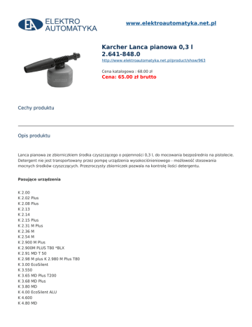 www.elektroautomatyka.net.pl Karcher Lanca pianowa 0,3 l 2.641-848.0 http://www.elektroautomatyka.net.pl/product/show/963 Cena katalogowa : 68.00 zł Cena: 65.00 zł brutto Cechy produktu Opis produktu Lanca pianowa ze zbiorniczkiem środka czyszczącego o pojemności 0,3 l, do mocowania bezpośrednio na pistolecie. Detergent nie jest transportowany przez pompę urządzenia wysokociśnieniowego - możlowość stosowania mocnych środków czyszczących. Przezroczysty zbiorniczek pozwala na kontrolę ilości detergentu. Pasujące urządzenia K 2.00 K 2.02 Plus K 2.08 Plus K 2.13 K 2.14 K 2.15 Plus K 2.31 M Plus K 2.36 M K 2.54 M K 2.900 M Plus K 2.900M PLUS T80 *BLX K 2.91 MD T 50 K 2.98 M plus K 2.980 M Plus T80 K 3.00 EcoSilent K 3.550 K 3.65 MD Plus T200 K 3.68 MD Plus K 3.80 MD K 4.00 EcoSilent ALU K 4.600 K 4.80 MD K 4.80 MD Alu K 5.55 Jubilee K 5.55 Jubilee T400 K 5.600 K 5.600 T 200 K 5.70 MD Plus K 5.70 MD T200 K 5.700 K 6.250 K 6.75 Jubilee K 6.75 Jubilee Plus T400 K 7.21 MX Plus K 7.250 T400 K 7.350 K 7.400 K 7.450 K 7.91 MD K HC 10 ELEKTRO-AUTOMATYKA Sprzedaż elektronarzędzi, urządzeń spawalniczych, maszyn budowlanych, pneumatyki, narzędzi warsztatowych, firmowych ubrań roboczych oraz maszyn ogrodowo leśnych. Sklep Bochnia ul. Brzeska 50 32-700 Bochnia Sklep Brzesko ul. Szarych Szeregów 23 32-800 Brzesko Serwis, Magazyn ul. Św. Brata Alberta 4 32-800 Brzesko tel. 691 572 333 e-mail: [email protected] tel. 609 523 230 e-mail: [email protected] tel. 609 523 645 e-mail: [email protected]