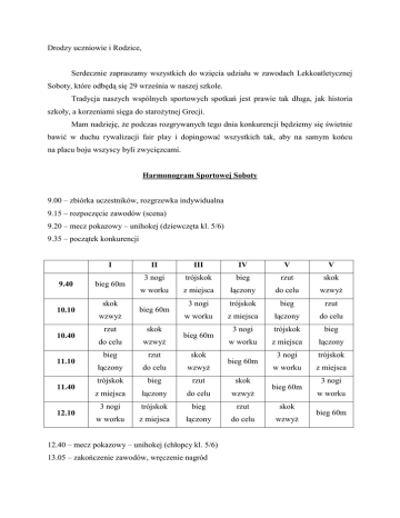 Drodzy uczniowie i Rodzice, Serdecznie zapraszamy wszystkich do wzięcia udziału w zawodach Lekkoatletycznej Soboty, które odbędą się 29 września w naszej szkole. Tradycja naszych wspólnych sportowych spotkań jest prawie tak długa, jak historia szkoły, a korzeniami sięga do starożytnej Grecji. Mam nadzieję, że podczas rozgrywanych tego dnia konkurencji będziemy się świetnie bawić w duchu rywalizacji fair play i dopingować wszystkich tak, aby na samym końcu na placu boju wszyscy byli zwycięzcami. Harmonogram Sportowej Soboty 9.00 – zbiórka uczestników, rozgrzewka indywidualna 9.15 – rozpoczęcie zawodów (scena) 9.20 – mecz pokazowy – unihokej (dziewczęta kl. 5/6) 9.35 – początek konkurencji I 9.40 10.10 10.40 11.10 11.40 12.10 bieg 60m skok wzwyż II III IV V V 3 nogi trójskok bieg rzut skok w worku z miejsca łączony do celu wzwyż 3 nogi trójskok bieg rzut w worku z miejsca łączony do celu 3 nogi trójskok bieg w worku z miejsca łączony 3 nogi trójskok w worku z miejsca bieg 60m rzut skok do celu wzwyż bieg rzut skok łączony do celu wzwyż trójskok bieg rzut skok z miejsca łączony do celu wzwyż 3 nogi trójskok bieg rzut skok w worku z miejsca łączony do celu wzwyż bieg 60m 12.40 – mecz pokazowy – unihokej (chłopcy kl. 5/6) 13.05 – zakończenie zawodów, wręczenie nagród bieg 60m bieg 60m 3 nogi w worku bieg 60m