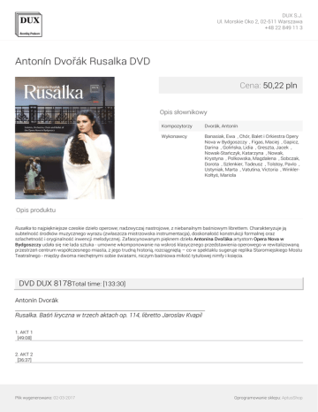 DUX S.J. Ul. Morskie Oko 2, 02-511 Warszawa +48 22 849 11 3 Antonín Dvořák Rusalka DVD Cena: 50,22 pln Opis słownikowy Kompozytorzy Dvorák, Antonín ∎ Wykonawcy Banasiak, Ewa ∎, Chór, Balet i Orkiestra Opery Nova w Bydgoszczy ∎, Figas, Maciej ∎, Gapicz, Darina ∎, Golińska, Lidia ∎, Greszta, Jacek ∎, Nowak-Stańczyk, Katarzyna ∎, Nowak, Krystyna ∎, Polkowska, Magdalena ∎, Sobczak, Dorota ∎, Szlenkier, Tadeusz ∎, Tolstoy, Pavlo ∎, Ustyniak, Marta ∎, Vatutina, Victoria ∎, WinklerKołtyś, Mariola ∎ Opis produktu Rusałka to najpiękniejsze czeskie dzieło operowe; nadzwyczaj nastrojowe, z niebanalnym baśniowym librettem. Charakteryzuje ją subtelność środków muzycznego wyrazu (zwłaszcza mistrzowska instrumentacja), doskonałość konstrukcji formalnej oraz szlachetność i oryginalność inwencji melodycznej. Zafascynowanym pięknem dzieła Antonína Dvořáka artystom Opera Nova w Bydgoszczy udała się nie lada sztuka - umowne wkomponowanie na wskroś klasycznego przedstawienia operowego w rewitalizowaną przestrzeń centrum współczesnego miasta, z jego trudną historią, rozciągniętą – co w spektaklu sugeruje replika Staromiejskiego Mostu Teatralnego - między dwoma niechętnymi sobie światami, niczym baśniowa miłość tytułowej nimfy i księcia. DVD DUX 8178Total time: [133:30] Antonín Dvorák Rusalka. Baśń liryczna w trzech aktach op. 114, libretto Jaroslav Kvapil 1. AKT 1 [49:08] 2. AKT 2 [36:37] Plik wygenerowano: 02-03-2017 Oprogramowanie sklepu: AptusShop DUX S.J. Ul. Morskie Oko 2, 02-511 Warszawa +48 22 849 11 3 3. AKT 3 [47:45] Wykonawcy: Chór, Balet i Orkiestra Opery Nova w Bydgoszczy Darina Gapicz /mezzosopran/ Dorota Sobczak /mezzosopran/ Ewa Banasiak /sopran/ Jacek Greszta /bas/ Katarzyna Nowak-Stańczyk /sopran/ Krystyna Nowak /sopran/ Lidia Golińska /alt/ Maciej Figas /dyrygent/ Magdalena Polkowska /sopran/ Mariola Winkler-Kołtyś /sopran/ Marta Ustyniak /sopran/ Pavlo Tolstoy /tenor/ Tadeusz Szlenkier /tenor/ Victoria Vatutina /sopran/ Plik wygenerowano: 02-03-2017 Powered by TCPDF (www.tcpdf.org) Oprogramowanie sklepu: AptusShop