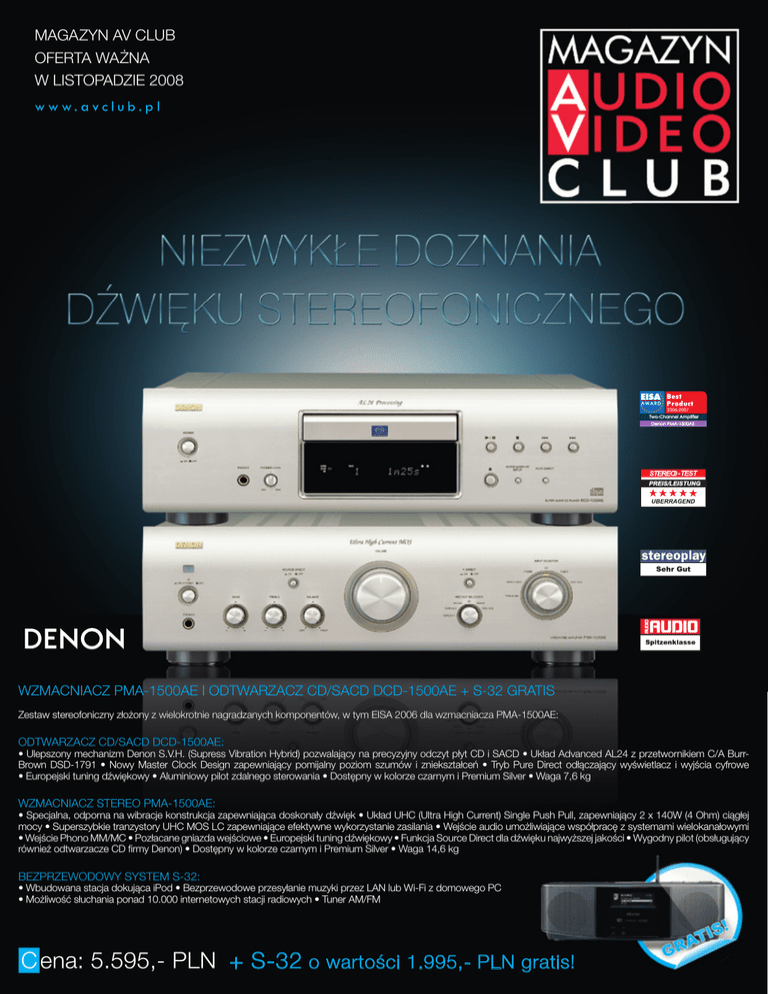 MAGAZYN AV CLUB OFERTA WAŻNA W LISTOPADZIE 2008 WZMACNIACZ PMA-1500AE I ODTWARZACZ CD/SACD DCD-1500AE + S-32 GRATIS Zestaw stereofoniczny złożony z wielokrotnie nagradzanych komponentów, w tym EISA 2006 dla wzmacniacza PMA-1500AE: ODTWARZACZ CD/SACD DCD-1500AE: • Ulepszony mechanizm Denon S.V.H. (Supress Vibration Hybrid) pozwalający na precyzyjny odczyt płyt CD i SACD • Układ Advanced AL24 z przetwornikiem C/A BurrBrown DSD-1791 • Nowy Master Clock Design zapewniający pomijalny poziom szumów i zniekształceń • Tryb Pure Direct odłączający wyświetlacz i wyjścia cyfrowe • Europejski tuning dźwiękowy • Aluminiowy pilot zdalnego sterowania • Dostępny w kolorze czarnym i Premium Silver • Waga 7,6 kg WZMACNIACZ STEREO PMA-1500AE: • Specjalna, odporna na wibracje konstrukcja zapewniająca doskonały dźwięk • Układ UHC (Ultra High Current) Single Push Pull, zapewniający 2 x 140W (4 Ohm) ciągłej mocy • Superszybkie tranzystory UHC MOS LC zapewniające efektywne wykorzystanie zasilania • Wejście audio umożliwiające współpracę z systemami wielokanałowymi • Wejście Phono MM/MC • Pozłacane gniazda wejściowe • Europejski tuning dźwiękowy • Funkcja Source Direct dla dźwięku najwyższej jakości • Wygodny pilot (obsługujący również odtwarzacze CD firmy Denon) • Dostępny w kolorze czarnym i Premium Silver • Waga 14,6 kg BEZPRZEWODOWY SYSTEM S-32: • Wbudowana stacja dokująca iPod • Bezprzewodowe przesyłanie muzyki przez LAN lub Wi-Fi z domowego PC • Możliwość słuchania ponad 10.000 internetowych stacji radiowych • Tuner AM/FM C ena: 5.595,- PLN + S-32 o wartości 1.995,- PLN gratis! S YSTEMY STEREO W zestawie iPod Nano 8 GB! BEZPRZEWODOWY SIECIOWY SYSTEM MUZYCZNY S-52 Głównym atutem systemu S-52 jest możliwość odtwarzania szerokiego wachlarza mediów i formatów. Wystarczy wymienić wbudowaną stację dokującą iPod, bezprzewodowe przesyłanie muzyki przez LAN lub Wi-Fi z domowego PC, możliwość słuchania ponad 10.000 internetowych stacji radiowych, odtwarzacz CD z możliwością odczytu plików MP3 i WMA, tuner AM/FM czy złącze USB na przedzie urządzenia. Dodatkowo będąc podłączonym do sieci można bezpłatnie ściągać, bezpośrednio przez urządzenie, najnowsze wersje oprogramowania. Doskonała jakość dźwięku dzięki wysokiej klasy głośnikom i technologii Audyssey Dynamic EQ i Bass-XT. Funkcje radiobudzika. Gniazdo jack dla przenośnych odtwarzaczy. Tuner FM z RDS. Duży wyświetlacz graficzny o wysokim kontraście. Dostępny w kolorze białym lub czarnym. C ena: 2.595,- PLN Przy zakupie STEREO LEKTOR przewód QED Performance gratis! ZESTAW STEREO LEKTOR Zestaw składa się z wielokrotnie nagradzanych komponentów stereo: DENON DRA/DCD z serii 700AE cechujących się wysoką jakością dźwięku i nowoczesną konstrukcją nawiązującą do najdroższych sprzętów stereo DENON przy zachowaniu przystępnej ceny. W najnowszych głośnikach DALI LEKTOR 6 wszystkie kluczowe komponenty są nowo zaprojektowane. Dali wprowadziło tutaj zaawansowane technologie i materiały, pierwotnie sprawdzone w droższej serii IKON, która zdobyła szereg nagród na całym świecie. Odtwarzacz DENON DCD-700AE + Amplituner DENON DRA-700AE (kolor czarny lub Premium Silver) Głośniki wolnostojące DALI LEKTOR 6 (kolor czarny lub orzechowy) C ena: 4.495,- PLN K INO DOMOWE Przy zakupie KINO 1 Q ACOUSTICS cyfrowy QED Performance gratis! ZESTAW KINA DOMOWEGO KINO 1 Q ACOUSTICS Zestaw na bazie najnowszego AVR-1509 to kino domowe wyposażone w niespotykane wcześniej funkcje: Audyssey Dynamic Volume (rozwiązuje problem nagłych skoków głośności w zależności od odtwarzanego materiału np. podczas reklam) i Audyssey Dynamic EQ (poprawia dynamikę przy niskich poziomach głośności i jednocześnie dba o minimalizację zniekształceń przy wysokich). Amplituner DENON AVR-1509 + Odtwarzacz DENON DVD-1740 (kolor Premium Silver lub czarny) Zestaw głośników Q Acoustics 1050i, 1010i, 1000Ci i 1000Si* (kolor wiśniowy lub grafitowy) *Cena zestawu z subwooferem 1000Si C ena: 3.595,-/4.295*,- PLN WIRTUALNY SYSTEM KINA DOMOWEGO X-SPACE DHT-FS3 Nie zobaczysz tutaj żadnego typowego sprzętu AV. Niemniej jednak, zapierający dech w piersiach przestrzenny dźwięk sprawia, że zwykły obraz wyświetlany na ekranie telewizora staje się wyjątkowym przeżyciem. Wizualnie niepozorny, wielogłośnikowy Denon X-SPACE DHT-FS3 ucieleśnia marzenia o imponującym dźwięku przestrzennym stworzonym w sposób niezwykle pomysłowy i nietypowy. Inteligentny dźwięk potrafi dostosować się do wymagań niemal każdego wnętrza. Gratisowym uzupełnieniem tego systemu jest odtwarzacz DVD-1740 w kolorze czarnym. Oryginalny i autentyczny dźwięk przestrzenny z jednego źródła, dodatkowe głośniki są zbędne. By uzyskać pożądany dźwięk przestrzenny nie wymaga odbijania dźwięku od ścian. W komplecie znajduje się kompaktowych rozmiarów subwoofer – dla uzupełnienia głębokiego basu. „Dolby headphone” zapewnia dźwięk przestrzenny przy odsłuchu za pomocą każdych słuchawek. C ena: 2.995,- PLN Przy zakupie DHT-FS3 odtwarzacz DVD-1740 o wartości 795,- PLN gratis! KOMPONENTY AUDIO VIDEO TELEWIZOR FULL HD LCD L42VP HI-GLOSS Panoramiczny telewizor LCD o przekątnej ekranu 106 cm (42”) oferuje rozdzielczość obrazu FullHD 1920 x 1080 punktów. Telewizor może przyjąć wszystkie sygnały wideo łącznie z najnowszym, filmowym 1.080p/24 przesyłanym z odtwarzaczy Blu-ray przez łącze HDMI. Ważną cechą jest również 15 pinowe gniazdo D-sub, dzięki któremu możemy mieć w domu 42 calowy monitor do komputera. Dzięki rozdzielczości FullHD i kontrastowi dynamicznemu 10.000:1 obraz prezentowany przez L42VP spełnia oczekiwania najbardziej wymagających. Dane techniczne: rozdzielczość FullHD 1920x1080 pikseli, tuner IDTV, 2 gniazda SCART, 2 gniazda HDMI, 15 pinowe złącze D-Sub do komputera (złącze VGA), jas