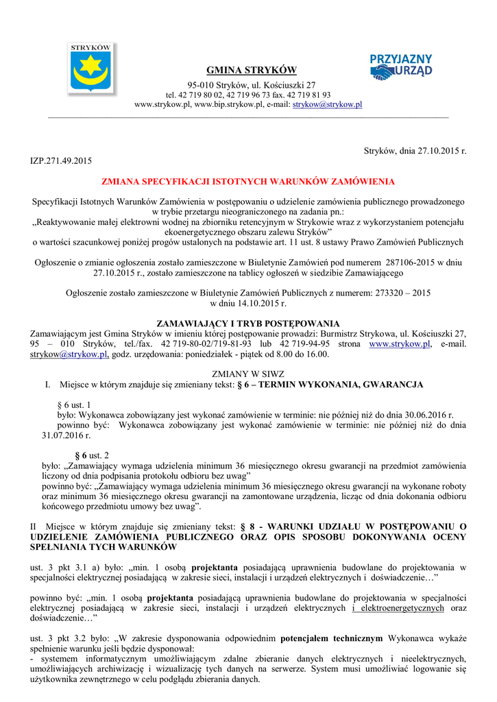 GMINA STRYKÓW 95-010 Stryków, ul. Kościuszki 27 tel. 42 719 80 02, 42 719 96 73 fax. 42 719 81 93 www.strykow.pl, www.bip.strykow.pl, e-mail: [email protected] ________________________________________________________________________________________________ Stryków, dnia 27.10.2015 r. IZP.271.49.2015 ZMIANA SPECYFIKACJI ISTOTNYCH WARUNKÓW ZAMÓWIENIA Specyfikacji Istotnych Warunków Zamówienia w postępowaniu o udzielenie zamówienia publicznego prowadzonego w trybie przetargu nieograniczonego na zadania pn.: „Reaktywowanie małej elektrowni wodnej na zbiorniku retencyjnym w Strykowie wraz z wykorzystaniem potencjału ekoenergetycznego obszaru zalewu Stryków” o wartości szacunkowej poniżej progów ustalonych na podstawie art. 11 ust. 8 ustawy Prawo Zamówień Publicznych Ogłoszenie o zmianie ogłoszenia zostało zamieszczone w Biuletynie Zamówień pod numerem 287106-2015 w dniu 27.10.2015 r., zostało zamieszczone na tablicy ogłoszeń w siedzibie Zamawiającego Ogłoszenie zostało zamieszczone w Biuletynie Zamówień Publicznych z numerem: 273320 – 2015 w dniu 14.10.2015 r. ZAMAWIAJĄCY I TRYB POSTĘPOWANIA Zamawiającym jest Gmina Stryków w imieniu której postępowanie prowadzi: Burmistrz Strykowa, ul. Kościuszki 27, 95 – 010 Stryków, tel./fax. 42 719-80-02/719-81-93 lub 42 719-94-95 strona www.strykow.pl, e-mail. [email protected], godz. urzędowania: poniedziałek - piątek od 8.00 do 16.00. I. ZMIANY W SIWZ Miejsce w którym znajduje się zmieniany tekst: § 6 – TERMIN WYKONANIA, GWARANCJA § 6 ust. 1 było: Wykonawca zobowiązany jest wykonać zamówienie w terminie: nie później niż do dnia 30.06.2016 r. powinno być: Wykonawca zobowiązany jest wykonać zamówienie w terminie: nie później niż do dnia 31.07.2016 r. § 6 ust. 2 było: „Zamawiający wymaga udzielenia minimum 36 miesięcznego okresu gwarancji na przedmiot zamówienia liczony od dnia podpisania protokołu odbioru bez uwag” powinno być: „Zamawiający wymaga udzielenia minimum 36 miesięcznego okresu gwarancji na wykonane roboty oraz minimum 36 miesięcznego okresu gwarancji na zamontowane urządzenia, licząc od dnia dokonania odbioru końcowego przedmiotu umowy bez uwag”. II Miejsce w którym znajduje się zmieniany tekst: § 8 - WARUNKI UDZIAŁU W POSTĘPOWANIU O UDZIELENIE ZAMÓWIENIA PUBLICZNEGO ORAZ OPIS SPOSOBU DOKONYWANIA OCENY SPEŁNIANIA TYCH WARUNKÓW ust. 3 pkt 3.1 a) było: „min. 1 osobą projektanta posiadającą uprawnienia budowlane do projektowania w specjalności elektrycznej posiadającą w zakresie sieci, instalacji i urządzeń elektrycznych i doświadczenie…” powinno być: „min. 1 osobą projektanta posiadającą uprawnienia budowlane do projektowania w specjalności elektrycznej posiadającą w zakresie sieci, instalacji i urządzeń elektrycznych i elektroenergetycznych oraz doświadczenie…” ust. 3 pkt 3.2 było: „W zakresie dysponowania odpowiednim potencjałem technicznym Wykonawca wykaże spełnienie warunku jeśli będzie dysponował: - systemem informatycznym umożliwiającym zdalne zbieranie danych elektrycznych i nieelektrycznych, umożliwiających archiwizację i wizualizację tych danych na serwerze. System musi umożliwiać logowanie się użytkownika zewnętrznego w celu podglądu zbierania danych. Należy złożyć wykaz wykonanych lub będących w trakcie wykonywania usług zdalnego zbierania danych elektrycznych i nieelektrycznych, umożliwiających archiwizacje i wizualizacje danych na serwerze – zał. nr 9 do SIWZ powinno być: „W zakresie dysponowania odpowiednim potencjałem technicznym Wykonawca wykaże spełnienie warunku jeśli będzie dysponował: - systemem informatycznym umożliwiającym zdalne zbieranie danych elektrycznych i nieelektrycznych, umożliwiających archiwizację i wizualizację tych danych na serwerze. System musi umożliwiać logowanie się użytkownika zewnętrznego w celu podglądu zbierania danych. Należy przedstawić informację na temat posiadanego potencjału technicznego – zał. nr 9 do SIWZ”. III Miejsce w którym znajduje się zmieniany tekst: § 9 - DOKUMENTY I OŚWIADCZENIA WYMAGANE OD WYKONAWCÓW ust. 1 pkt. 1.13 było: „dokumenty przedstawiające dane gwarantowane dla oferowanych urządzeń instalacji fotowoltaicznej i elektrowni wiatrowej, potwierdzone przez niezależną jednostkę certyfikującą w celu potwierdzenia oferowanych sprawności tych urządzeń” powinno być: „ atesty, certyfikaty, karty techniczne, karty produktu w celu potwierdzenia sprawności oferowanych urządzeń instalacji fotowoltaicznej i elektrowni wiatrowej” ust. 1 pkt. 1.14 o treści: „stosowne oświadczenie na potwierdzenie zaoferowanej hydrozespołu turbina – generator „ zostaje usunięty. sprawności elektrycznej W związku z powyższym zmienia się numeracja punktów 1.15 i 1.16 na 1.14 i 1.15. IV Miejsce w którym znajduje się zmieniany tekst: § 16 - SKŁADANIE I OTWARCIE OFERT: było: 1. Ofertę należy złożyć w nieprzejrzystym opakowaniu/zamkniętej kopercie w: Urzędzie Miejskim w Strykowie, ul. Kościuszki 27, 95 – 010 Stryków, pokój nr 2 (Sekretariat), do dnia 30.10.2015 r. do godz. 1000 2. Koperta z ofertą powinna być oznakowane następująco: „Reaktywowanie małej elektrowni wodnej na zbiorniku retencyjnym w Strykowie wraz z wykorzystaniem potencjału ekoenergetycznego obszaru zalewu Stryków” „Nie otwierać przed dniem 30.10.2015 r., godz. 1015.” 3. Oferty złożone po terminie będą zwrócone Wykonawcom zgodnie z art. 84 ust. 2 ustawy. 4. Otwarcie ofert nastąpi w siedzibie Zamawiającego w pok. 22, w dniu 30.10.2015 r., godz. 1015 powinno być: 1. Ofertę należy złożyć w nieprzejrzystym opakowaniu/zamkniętej kopercie w: Urzędzie Miejskim w Strykowie, ul. Kościuszki 27, 95 – 010 Stryków, pokój nr 2 (Sekretariat), do dnia 04.11.2015 r. do godz. 1000 2. Koperta z ofertą powinna być oznakowane następująco: „Reaktywowanie małej elektrowni wodnej na