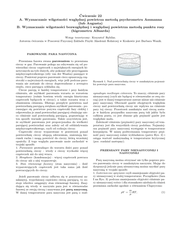 Ćwiczenie 22 A. Wyznaczanie wilgotności względnej powietrza metodą psychrometru Assmanna (lub Augusta) B. Wyznaczanie wilgotności bezwzględnej i względnej powietrza metodą punktu rosy (higrometru Alluarda) Wstęp teoretyczny: Krzysztof Rębilas. Autorem ćwiczenia w Pracowni Fizycznej Zakładu Fizyki Akademii Rolniczej w Krakowie jest Barbara Wanik. PAROWANIE. PARA NASYCONA Przemiana fazowa zwana parowaniem to przemiana cieczy w gaz. Parowanie polega na odrywaniu się od powierzchni cieczy cząsteczek o największych energiach kinetycznych na tyle dużych, aby pokonać siły przyciągania międzycząsteczkowego (siły van der Waalsa) panujące w cieczy. Ponieważ poprzez parowanie ciecz opuszczają cząsteczki o najwyższych energiach, więc jeśli podczas parowania nie zostanie do cieczy doprowadzone z zewnątrz ciepło, ciecz parująca ochładza się. Ciecze parują w każdej temperaturze i przy każdym ciśnieniu, ale szybkość parowania wzrasta ze wzrostem temperatury (rośnie bowiem wtedy energia kinetyczna cząsteczek będących w cieczy), a także wzrasta wraz z obniżeniem ciśnienia. Dlatego przepływ powietrza nad powierzchnią parującą zwiększa szybkość parowania - poruszające się powietrze porywa cząsteczki fazy ciekłej i odprowadza je znad powierzchni parującej obniżając nieco ciśnienie nad powierzchnią parującą, poprawiając w ten sposób warunki parowania. Także oczywistym jest, że szybkość parowania jest proporcjonalna do wielkości parującej powierzchni oraz zależy od sił oddziaływania międzycząsteczkowego, czyli od rodzaju cieczy. Cząsteczki cieczy wyparowane w przestrzeń ponad powierzchnię cieczy ulegają zderzeniom, zmieniają kierunek ruchu i mogą powrócić do cieczy, którą wcześniej opuściły. Z tego względu parowanie może zachodzić w trojaki sposób: 1. Parowanie prowadzące do wzrostu ilości pary ponad powierzchnią cieczy - wtedy z cieczy wychodzi więcej cząsteczek niż do niej wraca. 2. Skraplanie (kondensacja) - więcej cząsteczek powraca do cieczy niż z niej wyparowuje. 3. Stan równowagi fazowej (stan nasycenia) - ilość wyparowujących cząsteczek jest taka sama jak ilość powracających do cieczy. Jeżeli parowanie cieczy odbywa się w przestrzeni zamkniętej, wypełnionej częściowo cieczą parującą, to zostaje wkrótce osiągnięty stan równowagi fazowej. Znajdująca się wtedy w naczyniu para jest w równowadze fazowej ze swoją cieczą i nazywana jest parą nasyconą. W danej temperaturze para nasycona jest parą o mak- Rysunek 1. Nad powierzchnią cieczy w zamkniętym pojemniku powstaje para nasycona. symalnym możliwym ciśnieniu. To znaczy, ciśnienie pary nienasyconej (czyli nie będącej w równowadze ze swą cieczą) jest w danej temperaturze zawsze niższe niż ciśnienie pary nasyconej. Obecność gazów obojętnych względem cieczy nad powierzchnią cieczy nie wpływa na ciśnienie pary tej cieczy. Przestrzeń zamknięta nad cieczą zostaje w każdym przypadku nasycona parą tak jakby była całkiem pusta, co jest słuszne gdy prężność gazów jest względnie mała. Zależność ciśnienia (prężności) pary nasyconej od temperatury jest dla wszystkich cieczy podobna. Najmniejsza prężność pary nasyconej występuje w temperaturze krzepnięcia. W miarę podwyższania temperatury prężność pary nasyconej rośnie wykładniczo (patrz Rys. 2) i osiąga wartość maksymalną w temperaturze krytycznej (por. rozdział nastepny). PRZEMIANY PARY NIENASYCONEJ I NASYCONEJ Parę nasyconą można otrzymać nie tylko poprzez proces parowania cieczy w zamkniętym naczyniu. Mając do dyspozycji jedynie parę nienasyconą można uzyskać parę nasyconą w trojaki sposób: 1. Izotermiczne sprężanie czyli zmniejszanie objętości pary nienasyconej w stałej temperaturze. Początkowo (faza I na Rys. 3) podczas zmniejszania objętości ciśnienie pary nienasyconej rośnie i dla stosunkowo niedużych ciśnień przemiana zachodzi zgodnie z równaniem Clapeyrona: pV = m RT, µ (1) 2 Ciœnienie pary nasyconej (mm Hg) heksan 1500 kwas octowy propionian etyly 1000 benzen woda 500 0 50 150 100 t (o C) Rysunek 2. Ciśnienie pary nasyconej kilku cieczy w funkcji temperatury. skutkuje tym, że część masy pary zostaje skroplona na ściankach naczynia. Dzieje się tak aż do momentu całkowitego skroplenia pary. Gdy w zbiorniku zostanie jedynie ciecz, dalsze zmniejszanie objętości polega już na sprężaniu cieczy, co wiąże się z gwałtownym wzrostem ciśnienia (faza III na Rys. 3). Gdybyśmy podczas fazy II odwrócili proces i zaczęli zwiększać objętość pary nasyconej, wówczas spowoduje to wyparowanie pewnej masy cieczy bez obniżenia ciśnienia pary nasyconej. Przedstawiona na Rys. 3 zależność p(V ) sporządzona dla T = const nosi nazwę izotermy pary. Na Rys. 4 pokazano izotermy pary obrazujące opisany powyżej proces izotermicznego sprężania przeprowadzony w coraz wyższych temperaturach (T3 > T2 > T1 ). Im wyższa jest p p III II p nas I Tk V2 V1 V IV T3 III I T4 II T1 T2 I II V Rysunek 4. Izotermy pary dla różnych temperatur. III Rysunek 3. Zależność ciśnienia od objętości przy izotermicznym sprężaniu: (I) pary nienasyconej, (II) pary nasyconej, (III) cieczy. gdzie: p - ciśnienie (prężność) pary, V - objętość, m masa pary zawartej w objętości V , µ - masa molowa pary (dla wody µ = 18 g/mol), R - stała gazowa, T - temperatura wyrażona w skali Kelvina. Wzrost ciśnienia pary nienasyconej kończy się w momencie, gdy uzyskane ciśnienie jest równe ciśnieniu pary nasyconej w danej temperaturze. Para nienasycona staje się więc parą nasyconą. Dalsze zmniejszanie objętości (wciąż w stałej temperaturze) nie prowadzi już do wzrostu ciśnienia pary (faza II na Rys. 3), bowiem mamy już do czynienia z parą nasyconą, czyli parą o maksymalnym możliwym ciśnieniu w danej temperaturze. Zmniejszanie objętości pary nasyconej temperatura tym wyżej położona