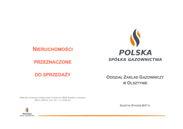 NIERUCHOMOŚCI PRZEZNACZONE DO SPRZEDAŻY ODDZIAŁ ZAKŁAD GAZOWNICZY W OLSZTYNIE NINIEJSZY FOLDER NIE STANOWI OFERTY W MYŚL ART. 66 §1 KODEKSU CYWILNEGO (DZ.U. Z 2014 R., POZ. 121 – TJ. Z PÓŹN.ZM.) OLSZTYN, STYCZEŃ 2017 R. Lista nieruchomości przeznaczonych do sprzedaży w Zakładzie w Olsztynie: woj. warmińsko-mazurskie Dobre Miasto........................................................3 woj. warmińsko-mazurskie Górowo Iławeckie................................................4 woj. warmińsko-mazurskie Olsztyn ..................................................................5 woj. warmińsko-mazurskie Olsztynek ..............................................................6 woj. warmińsko-mazurskie Morąg ...................................................................7 woj. warmińsko - mazurskie Elbląg ..................................................................8 woj. warmińsko - mazurskie Reszel ..................................................................9 woj. warmińsko-mazurskie Węgorzewo ........................................................10 woj. warmińsko-mazurskie Ryn......................................................................11 woj. warmińsko-mazurskie Olecko.................................................................12 woj. warmińsko-mazurskie Mikołajki .............................................................13 woj. warmińsko-mazurskie Pisz......................................................................14 woj. warmińsko-mazurskie Dobre Miasto LOKALIZACJA Oddział Zakład Gazowniczy w Olsztynie http://maps.google.com GALERIA OBIEKTU . OPIS Zabudowana nieruchomość oddana w użytkowanie wieczyste oraz prawo własności budynków i budowli na niej położonych. Nieruchomość położona w Dobrym Mieście przy ul. Kościuszki 2C. Na nieruchomości znajduje się budynek biurowy (pow. użyt. 243,08m2), budynek warsztatowo – magazynowy (pow. użyt. 180,59m2), budynek garażowy (pow. użyt. 29,71 m2). Teren nieruchomości utwardzony, oświetlony, ogrodzony. Dojazd do nieruchomości ulicą Kościuszki dobry-drogą asfaltową (dz. 332) a następnie wewnętrzną utwardzoną asfaltem działkę Straży Pożarnej dz. nr 333/2. Nieruchomość w pełni uzbrojona w podstawowe media. Powierzchnia nieruchomości: dz. nr 337/2 – 0,1395 ha Księga wieczysta: OL1O/00059072/6 . DANE KONTAKTOWE (89) 538-30-81 [email protected] . woj. warmińsko-mazurskie Oddział Zakład Gazowniczy w Olsztynie Górowo Iławeckie LOKALIZACJA OPIS Zabudowana nieruchomość oddana w użytkowanie wieczyste oraz prawo własności budynków i budowli na niej położonych. Nieruchomość położona w Górowie Iławeckim przy ul. Kardynała Stefana Wyszyńskiego 18. Na nieruchomości znajduje się budynek administracyjno-biurowy o powierzchni użytk. 463,17m2 oraz budynek Muzeum Techniki i Gazownictwa o powierzchni użytk. 231,30m2. Powierzchnia nieruchomości: dz. nr 255 – 0,1357 ha dz. nr 254 - 0,2674 ha dz. nr 54/1 – 0,0509 ha Księga wieczysta: OL1Y/00017497/2 OL1Y/00018174/9 http://maps.google.com DANE KONTAKTOWE (89) 538-30-81 [email protected] Oddział Zakład Gazowniczy w Olsztynie woj. warmińsko-mazurskie LOKALIZACJA OPIS Zabudowana nieruchomość oddana w użytkowanie wieczyste oraz prawo własności budynków i budowli na niej położonych. Nieruchomość położona w Olsztynie przy ul. Lubelskiej. Łączna powierzchnia gruntu wynosi 26.891,00 m.kw. Łączna powierzchnia zabudowań wynosi 578,94 m.kw. Powierzchnia nieruchomości: dz. nr 1/1 – 0,0048 ha dz. nr 1/2 – 2,5793 ha dz. nr 3/2 – 0,0195 ha dz. nr 1/5 – 0,0074 ha dz. nr 1/11 – 0,0698 ha dz. nr 3/1 – 0,0083 ha Księga wieczysta: OL1O/00095838/8 OL1O/00093811/9 http://maps.google.com http://mapy.geoportal.gov.pl/imap/ DANE KONTAKTOWE (89) 538-30-81 [email protected] Olsztyn woj. warmińsko-mazurskie LOKALIZACJA Oddział Zakład Gazowniczy w Olsztynie http://maps.google.com DANE KONTAKTOWE OPIS Zabudowana nieruchomość oddana w użytkowanie wieczyste oraz prawo własności budynków i budowli na niej położonych. Nieruchomość położona w Olsztynku przy ul. Mrongowiusza 34. Powierzchnia nieruchomości: dz. nr 1/1 – 0,3842 ha Księga wieczysta: OL1O/00066292/6 (89) 538-30-81 [email protected] Olsztynek Oddział Zakład Gazowniczy w Olsztynie woj. warmińsko-mazurskie LOKALIZACJA http://maps.google.com DANE KONTAKTOWE OPIS Zabudowana nieruchomość oddana w użytkowanie wieczyste oraz prawo własności budynków i budowli na niej położonych. Nieruchomość położona w Morągu przy ul. Dąbrowskiego 22. Na nieruchomości znajduje się budynek biurowy (pow. użyt. 298,45 m2), budynek garażowy (pow. użyt. 48,87 m2) oraz budynek magazynowy (pow. użyt. 5,91 m2). Powierzchnia nieruchomości: dz. nr 5/19 – 0,2775 ha Księga wieczysta: EL2O/00018734/3 (89) 538-30-81 [email protected] Morąg woj. warmińsko - mazurskie LOKALIZACJA Oddział Zakład Gazowniczy w Olsztynie http://maps.google.com DANE KONTAKTOWE . (89) 538-30-81 OPIS Nieruchomość położona w Elblągu Powierzchnia nieruchomości: część dz. nr 33 – 0,2193 ha Księga wieczysta: EL1E/00033838/6 przy ul. Orzeszkowej. [email protected] Elbląg Oddział Zakład Gazowniczy w Olsztynie woj. warmińsko - mazurskie LOKALIZACJA . OPIS Zabudowana nieruchomość oddana w użytkowanie wieczyste oraz prawo własności budynków i budowli na niej położonych. Nieruchomość położona w Reszlu przy ul. 1-go Maja. Na nieruchomości znajduje się były budynek trafostacji (dz. nr 259/5) oraz zbiornik gazu wraz z budynkiem kotłowni (dz. nr 259/2) Powierzchnia nieruchomości: dz. nr 259/5 – 0,0125 ha dz. nr 259/2 – 0,0935 ha Księga wieczysta: OL1K/00030938/2 OL1K/00031411/9 http://maps.google.com DANE KONTAKTOWE (89) 538-30-81 [email protected] Reszel Oddział Zakład Gazowniczy w Olsztynie woj. warmińsko-mazurskie Węgorzewo LOKALIZACJA http://maps.google.com GALERIA OBIEKTU OPIS Zabudowana nieruchomość o