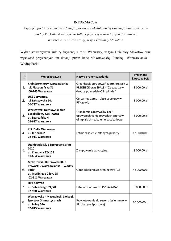 INFORMACJA dotycząca podziału środków z dotacji sportowych Mokotowskiej Fundacji Warszawianka – Wodny Park dla stowarzyszeń kultury fizycznej prowadzących działalność na terenie m.st. Warszawy, w tym Dzielnicy Mokotów Wykaz stowarzyszeń kultury fizycznej z m.st. Warszawy, w tym Dzielnicy Mokotów oraz wysokość przyznanych im dotacji przez Radę Mokotowskiej Fundacji Warszawianka – Lp. Wodny Park: Wnioskodawca Nazwa projektu/zadania Przyznana kwota w PLN 1. Klub Szermierzy Warszawianka ul. Piaseczyńska 71 00-765 Warszawa Organizacja zgrupowań szermierczych w PRZESIECE oraz SPALE - "Ze szpadą w drodze po medale Olimpijskie" 8 000,00 zł 2. UKS Cervantes, ul Zakrzewska 24, 00-737 Warszawa Cervantes Camp - obóz sportowy w Pińczowie 8 000,00 zł Warszawski Uczniowski Klub Baseballowy CENTAURY 3. ul. Spartańska 4 02-637 Warszawa "Akademia zdobywców baz" upowszechnianie przyszłych sportów olimpijskich - szkolenie baseballowe 8 000,00 zł K.S. Delta Warszawa 4. ul. Jeziorna 2 02-911 Warszawa Letnie szkolenie młodych piłkarzy 12 000,00 zł Uczniowski Klub Sportowy Sprint 2020 5. ul. Klaudyny 32/108 01-684 Warszawa Zgrupowanie wakacyjne. 8 000,00 zł Mokotowski Uczniowski Klub Pływacki „Warszawianka – Wodny 6. Park” ul. Merliniego 2 lok. 25 02-511 Warszawa Obóz szkoleniowo treningowy […] 42 000,00 zł UKS SADYBA 7. ul. Sobieskiego 74/78 02-930 Warszawa Lato w Gdańsku z UKS "SADYBA" 8 000,00 zł Warszawsko - Mazowiecki Związek Sportów Gimnastycznych Przygotowanie do sezonu jesiennego w 8. ul. Żołny 56A Akrobatyce Sportowej 02-815 Warszawa 10 000,00 zł UKS "LA BASKET" 9. ul. Turmoncka 2 03-254 Warszawa Organizacja zgrupowań szkoleniowych przygotowujących do OOM i do mistrzostw Makroregionu Młodzików 8 000,00 zł Klub Sportowy HAND to HAND 1 10. ul. Jana Sebastiana Bacha 26/1003 Letni Obóz Szkoleniowy Iwonicz 2016 02-743 Warszawa 15 000,00 zł Miejski Klub Sportowy "Polonia" 11. ul. Konwiktorska 6 00-206 Warszawa 8 000,00 zł Organizacja zgrupowania szkoleniowego w Spale dla młodych adeptów w Lekkiej Atletyce Upowszechnianie kultury fizycznej Warszawsko-Mazowiecki poprzez współzawodnictwo sportowe Okręgowy Związek Lekkiej Atletyki dzieci i młodzieży w formie organizacji 12. ul. Piaseczyńska 71 zawodów kontrolnych w cyklu 00-765 Warszawa szkoleniowym. […] 30 000,00 zł Warszawskie Towarzystwo Łyżwiarskie "STEGNY" 13. ul. Inspektowa 1 02-711 Warszawa Zgrupowanie szkoleniowe w Szklarskiej Porębie 12 000,00 zł Uczniowski Klub Sportowy IRINA 14. ul. Ludwika Narbutta 14 02-541 Warszawa "Wakacje z gimnastyką" 20 000,00 zł Uczniowski Klub Sportowy "Nad Jeziorkiem" 15. ul. Jeziorna 5/9 02-911 Warszawa "OBÓZ ŻEGLARSKI - OPTYMISTYCZNE ZEGRZE 2016" 5 000,00 zł Mokotowski Klub Łuczniczy "Strzała" 16. ul. Kochanowskiego 10A m. 59 01-864 Warszawa Obóz przygotowawczy przed Mistrzostwami Polski 8 000,00 zł Wypłaty przyznanych dotacji nastąpią na mocy zawartych umów pomiędzy Fundacją, a poszczególnymi stowarzyszeniami. Terminy zawierania umów z poszczególnymi stowarzyszeniami będą wyznaczane indywidualnie przez Zarząd Fundacji. Warszawa, lipiec 2016 r.