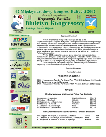 Jak to się robi wśród seniorów... Nie jest łatwo zdobyć z dwusesyjnego turnieju 65%, tak jak to zrobili świeżo (o ile można tak powiedzieć o seniorach) upieczeni mistrzowie Polski, Olek Jezioro i Karol Mykietyn. Na pewno trzeba mieć trochę fartu. Ale szczęściu trzeba umieć pomagać. Oto rozdanie z drugiej sesji: Rozdanie 26. Mykietyn rozgrywał 6BA z ręki E: ♠ AKW87 ♥ K62 ♦ AD75 ♣6 ♠ 93 ♥AD10 ♦ KW8 ♣ AKW42 S zaatakował w kiery. Wydaje się, że największe szanse daje zagranie przez piki. Ale stara zasada brzmi: „najpierw przeciągałka...”, więc po karach! S dołożył do kar kiera, a do czwartego (Karol z ręki wyrzucił trefla) - trefla. Teraz udany impas trefl, a potem kiery z utrzymaniem się w ręce i 13 lew na przymusie pikowo – treflowym za 82%, gdyż całość rozdania wyglądała jak niżej: ♠ AKW87 ♥ K62 ♦ AD75 ♣6 ♠ D1054 ♥W ♦ 9643 ♣ D1085 ♠ 93 ♥AD10 ♦ KW8 ♣ AKW42 ♠ 62 ♥ 987543 ♦ 102 ♣ 973 Aż dziw, że S uznał, że ma tylko jednego zbędnego kiera. Ale w kierach była przynajmniej szansa na forty, a treflach... W ostatniej rundzie turnieju teamów w walce o brązowy medal spotkały się teamy naszpikowane reprezentantami Polski i Szwecji. Oto rozdanie, które przesądziło o tym, że brązowy medal został w kraju: ♠ 543 ♥ 92 ♦ 832 ♣ K10954 ♠ DW2 ♠ A7 ♥ KDW105 ♥A873 ♦ W974 ♦ K6 ♣2 ♣ DW863 ♠ K10986 ♥ 64 ♦ AD105 ♣ A7 Biuletyn Nr 1 str.2 13.07.2002 W pokoju otwartym, po licytacji (WE po partii, rozdawał N): W 3♥3) N Krogulska pas pas E 1BA1) 4♥ S Wilkosz 2♠2) pas... 1) 13-15 PC 5+♠ i 4+ w kolorze młodszym 3) inwitujące Krogulska zaatakowała w piki. Rozgrywający puścił w dziadku, a Wilkosz, po lewie na króla zagrał spod drugiego asa trefl! Jola wzięła lewę na króla i podegrała kara – bez jednej nim rozgrywający doszedł do piłki. A na drugim stole atak nastąpił także w piki, ale Szwed odwrócił w pika. Rozgrywający, Jezioro przeszedł do ręki atutem, na damę pik wyrzucił karo ze stołu, po czym wyszedł w trefla. S wziął na asa i połączył atu. Olek wziął w stole, przebił w ręce trefla i odszedł w karo. W końcówce: ♠♥♦ 832 ♣ K10954 ♠♠♥ KD ♥87 ♦ W97 ♦♣♣ DW8 ♠ 109 ♥♦ D105 ♣S zagrał na odruch w karo, wypuszczając kontrakt. A była to rzadka sytuacja, w której zagranie w podwójny renons nie dawało rozgrywającemu dodatkowej lewy... 2) KONKURS Ogłaszamy konkurs na najlepsze zagranie turnieju. Prosimy o zgłaszanie efektownych licytacji, rozgrywek i wistów do redakcji biuletynu bądź do sędziów. Nagrody funduje redakcja „Brydża”. MISTRZOSTWA EUROPY JUNIORÓW Po 12 rundzie Drużynowych Mistrzostw Europy Juniorów, reprezentacja Polski jest na IV miejscu (214 VP). Prowadzą Włosi – 244 VP, przed Francją (226 VP) i Norwegią (214,5 VP). Do końca pozostało 11 meczów. W mistrzostwach juniorów młodszych (do 20 lat) po trzech rundach Polacy prowadzą – 66 VP. Na drugim miejscu Izrael – 65 VP, na trzecim Norwegia – 63 VP. UWAGA NA „KOMÓRKI” Z przecieków wynika, że regulaminowy zakaz POSIADANIA na sali rozgrywek telefonów komórkowych będzie rygorystycznie egzekwowany, a trójki IRCh-y będą przeprowadzały doraźne kontrole wśród grających. Biuletyn Nr 1 str.3 13.07.2002 Ostatnie pożegnanie Krzysztofa Pawlika Pożegnaliśmy naszego przyjaciela, kolegę, wychowawcę i nauczyciela wielu pokoleń ludzi, których ulubionym hobby jest brydż sportowy. Krzysztof, nim na dobre stał się zawodnikiem, a później działaczem brydżowym, przeżył swoją młodość – młodość, bogatą w różne wydarzenia, często dramatyczne. Tuż przed drugą wojną światową mieszkał w Brześciu, uczył się w gimnazjum. Po wkroczeniu armii radzieckiej do Polski, w lutym 1940 roku został aresztowany przez NKWD, gdzie udowodniono mu przynależność do tajnej organizacji polskiej i skazano na 8 lat pobytu w tzw. „insprawitielnych trudowych łagrach”. W 1941 roku po podpisaniu porozumienia sowiecko – polskiego przez Władysława Sikorskiego wyszedł z łagru, otrzymując trochę sucharów, solonej ryby i 200 rubli na drogę. Wyruszył na południe w poszukiwaniu punktu zbornego armii polskiej. Po przebyciu trudnej (zachorował na tyfus plamisty) i długiej drogi dotarł do Kermine w Uzbekistanie, gdzie zbierano ochotników do polskiego wojska. Chętnych było więcej, niż ustaliły to władze sowieckie, a wyżywienia było mało. W tej sytuacji dowódca – generał Władysław Anders w porozumieniu z wojskiem sowieckim zdecydował się na ewakuację niektórych jednostek na Bliski Wschód. I tak przez dawną Persję i Irak Krzysztof dotarł do Anglii, gdzie został wcielony do lotnictwa RAF-u. W 2002 roku został nominowany na podporucznika lotnictwa w stanie spoczynku. Po wojnie wrócił do Polski w 1947 roku. Ukończył szkołę średnią, a następnie podjął studia w Wyższej Szkole Handlu Morskiego w Sopocie, którą ukończył jako magister ekonomii. Później pracował w przedsiębiorstwa i instytucjach związanych z gospodarka morską. W tym okresie zaczął się interesować, a później pasjonować swoją ulubiona dyscypliną sportową – brydżem sportowym. W roku 1956 był jednym z założycieli Gdańskiej Ligi Brydżowej, która w 1956 roku przekształciła się w Okręgowy Związek Brydża Sportowego z siedziba w mieszkaniu państwa Pawlików w Sopocie. Nieprzerwanie do 1994 roku pełnił funkcję sekretarza związku. Był inicjatorem wielu poczynań, dzięki którym OZBS Gdańsk stał się czołowym okręgiem w Polsce. Był twórca i nieprzerwanie przez 33 lata dyrektorem Kongresu Bałtyckiego – największej międzynarodowej imprezy brydżowej w naszym regionie (w latach siedemdziesiątych największej w kraju). Dzięki nawiązanym przez Niego licznym kontaktom międzynarodowym, w latach 70 i 80tych, gdańscy zawodnicy otrzymali niepowtarzalną w ówczesnych czas