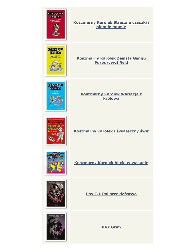 Koszmarny Karolek Straszne czaszki i niemiłe mumie Koszmarny Karolek Zemsta Gangu Purpurowej Ręki Koszmarny Karolek Wariacje z królową Koszmarny Karolek i świąteczny świr Koszmarny Karolek Akcje w wakacje Pax T.1 Pal przekleństwa PAX Grim Pax T.3 Myling Pax T.4 Bjera Percy Jackson i bogowie olimpijscy Tom 1-5 Mikołajek i Wielki Cyrk Kolegów Magiczne drzewo Świat Ogromnych Magiczne Drzewo Cień smoka Magiczne drzewo Olbrzym Baśniobór 4 Tajemnice smoczego azylu Baśniobór 3 Plaga cieni Baśniobór 2 Gwiazda wieczorna wschodzi Baśniobór 5 Klucze do więzienia demonów Trzej detektywi Zaginiony pergamin Biblioteka pana Lemoncella Bracia Hardy W oparach szaleństwa Bracia Hardy Śledztwo na promenadzie Agata na tropie. Wyprawa do Kenii Agata na tropie. Miecz króla Szkocji. Agata na tropie. Korona z Wenecji Agata na tropie. Skarb Majów. Agata na tropie. Wypadek na wieży Eiffla. Agata na tropie. Kradzież nad Niagarą. Biuro detektywistyczne Lassego i Mai Tajemnica szpitala Złota księga Detektywistyczne łamigłówki Lassego i Mai Biuro detektywistyczne Lassego i Mai Tajemnica kawiarni Biuro detektywistyczne Lassego i Mai Tajemnica cyrku Emil detektyw Waleczni rycerze Emil detektyw Pieniądze klasowe Emil i detektywi Opowieści z Narnii Tom 1-7 Wakacje Mikołajka Szkolne przygody Mikołajka Koszmarny Karolek Zwichrowany wampirozombi Harry Potter i Komnata Tajemnic Harry Potter i więzień Azkabanu Harry Potter i kamień filozoficzny Czego uszy nie widzą Magiczna Cukiernia Magiczna cukiernia Okruchy magii Magiczna cukiernia Szczypta magii Zosia z ulicy Kociej Na wycieczce Zosia z ulicy Kociej Na wakacjach Zosia z ulicy Kociej na tropie Zosia z ulicy Kociej Dziennik cwaniaczka 8 Zezowate szczęście Dziennik cwaniaczka 7 Trzeci do pary Dziennik cwaniaczka Biała gorączka Dziennik cwaniaczka 2 Rodrick rządzi Dziennik cwaniaczka 3 Szczyt wszystkiego Dziennik Cwaniaczka Ubaw po pachy Dziennik cwaniaczka Przykra prawda Kroniki Archeo Przepowiednia Synów Słońca Sekret Wielkiego Mistrza Kroniki Archeo Skarb Atlantów Kroniki Archeo Tajemnica klejnotu Nefertiti Kroniki Archeo Zagadka Diamentowej Doliny Kroniki Archeo Zaginiony klucz do Asgardu Kroniki Archeo Szyfr Jazona Charlie i fabryka czekolady Opowiadania z dreszczykiem Pewnego razu w Nibylandii Między Światami Pewnego razu w Nibylandii 3 Szczęśliwy dmuchawiec Pewnego razu w Nibylandii 4 We mgle Pewnego razu w Nibylandii 5 Weselne skrzydełka Pewnego razu w Nibylandii 6 W odległym lesie Ogromne okno Piętnaście kroków Pięciopsiaczki Tajemnica namokniętej gąbki Świetlna układanka Kacper Niewypał Total(na) porażka Kacper Niewypał Co?dziennik pomyłek Kacper Niewypał O!błędne notatki O zajączku Filipie który ze strachu dokonał wielkich czynów Co to znaczy Księga przysłów Co to znaczy Powrót Bartusia czyli co to znaczy... po raz drugi Wielka księga Detektywa Pozytywki Przygody Koziołka Matołka z płytą CD Magiczne Drzewo Gra