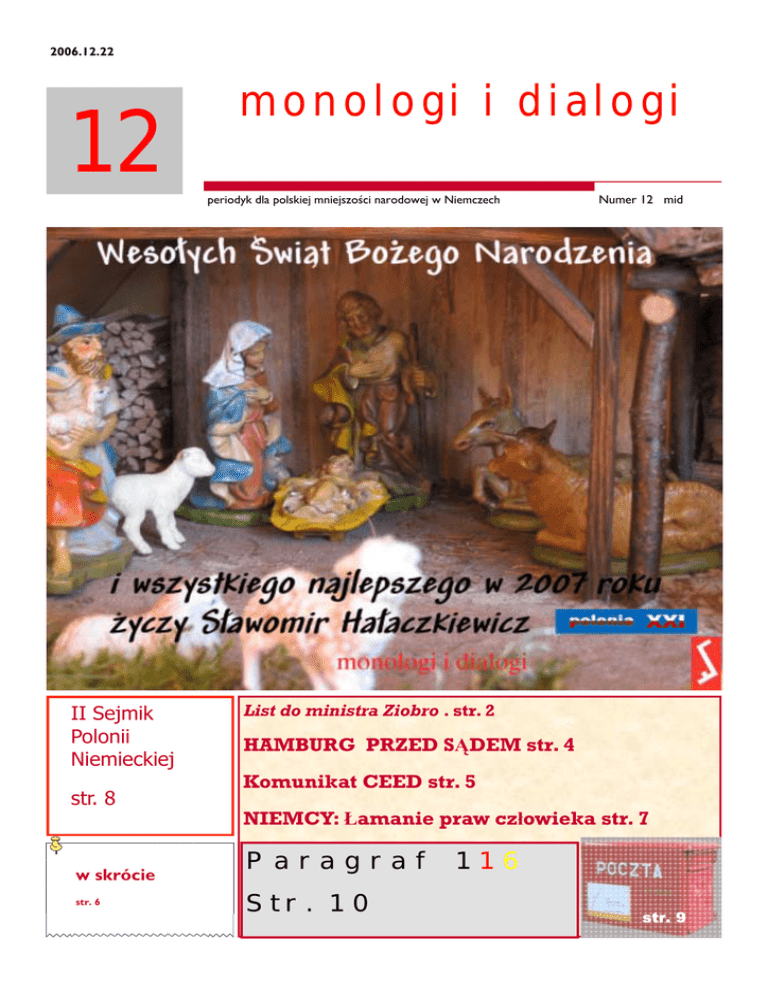 2006.12.22 12 monologi i dialogi periodyk dla polskiej mniejszości narodowej w Niemczech Numer 12 mid W tym wydaniu: II Sejmik Polonii Niemieckiej str. 8 w skrócie str. 6 List do ministra Ziobro . str. 2 HAMBURG PRZED SĄDEM str. 4 Komunikat CEED str. 5 NIEMCY: Łamanie praw człowieka str. 7 Paragraf 116 Str. 10 str. 9 Strona 2 monologi i dialogi Nu mer 12 mi d 200 6.12 .22 Stowarzyszenie Polskie Rodzice Przeciw Dyskryminacji Dzieci _______________________________________________________________________ monologi i dialogi Sz. Pan Minister Zbigniew Ziobro Ministerstwo Sprawiedliwości Al. Ujazdowskie 11 00-950 Warszawa [email protected] Faks: 00 48 - 22 - 628 65 52 Oficjalne doniesienie o urzędowym wynaradawianiu dzieci polskich w Niemczech i łamaniu Traktatu polsko-niemieckiego, praw Dziecka i Praw Obywatelskich Bielefeld, dn. 10.12.2006 (Międzynarodowy Dzień Praw Człowieka) Szanowny Panie Ministrze, W imieniu Stowarzyszania Polskiego Rodzice Przeciw Dyskryminacji Dzieci donoszę oficjalnie o praktykach wynaradawiania dzieci polskich w Niemczech zarówno w przypadku dzieci z rodzin mieszanych, polskoniemieckich, jak i polskich. Sprawa wynaradawiania tych nieletnich obywateli polskich przez niemieckie JUGENDAMTY* została poddana półtoragodzinnej dyskusji parlamentarnej w Sejmie, dnia 12.10.2006 r. Sprawa ta dotyczy również polskiego Ministerstwa Sprawiedliwości. Polskie Ministerstwo Sprawiedliwości aktywnie doprowadziło do wydania polskich dzieci do Niemiec wiedząc dokładnie o tym, że dzieci te zostaną poddane procesowi wynaradawiania, tzn. konkretnie dzieciom tym zabroni się mówić i uczyć po polsku oraz kontaktów z polską rodziną i odwiedzin Polski. Republika Federalna Niemiec nie respektuje wyroków innych państw oraz wyroków Trybunału Europejskiego, jeżeli chodzi o dzieci obcokrajowców, za co według doniesienia Agencji Prasowej AFP z dn. 8.12.2006, godz. 13:50 Niemcy zostały upomniane przez Prezydenta Trybunału Europejskiego Luziusa Wildhabera. Najbardziej znanym jest przypadek tureckiego ojca Görgülü, który służy sądom niemieckim i JUGENDAMTOM do oficjalnej demonstracji niezależności urzędów i sądów niemieckich od prawa międzynarodowego. Niemcy wniosły zastrzeżenia co do praw dzieci obcokrajowców na terenie Niemiec i tym samym nie dopuściły do pełnej ratyfikacji Konwencji Praw Dziecka. Niemcy nie respektują też Europejskiej Konwencji o ekstradycji, dlatego masowi mordercy, skazani przez sądy we Włoszech i Grecji do dzisiejszego dnia śmieją się wraz z niemieckimi prokuratorami i sędziami ze sprawiedliwości. Cd. Str. 3 Nu mer 12 Strona 3 mi d 200 6.12 .22 Cd ze str. 2 W moim konkretnym przypadku zabronioniono mojemu dziecku najpierw mówić po polsku, wyjeżdżać do rodziny do Polski, a gdy się z tymi praktykami nie zgodziłam pan Kuziak z Departamentu Współpracy Międzynarodowej i Prawa Europejskiego z Pana Ministerstwa doprowadził do tego (podobnie jak w przypadku dzieci pani Iwony Laube), że nasze dzieci są z premedytacją wynaradawiane. Zaznaczam, że zabranianie j. polskiego obywatelom polskim na terenie Niemiec jest niezgodne z prawem międzynarodowym (Konwencja Praw Człowieka, Konwencja Praw Dziecka) oraz z traktatem polsko – niemieckim z 17.06.1991 r. (nie wspominając o tym, że jest to do tego sprzeczne z podstawowymi zasadami wychowania oraz zaleceniami nauki). Dlatego proszę o konkretną interwencję Pana Ministra w sprawie urzędowego wynaradawiania dzieci polskich w Niemczech za zgodą urzędników z polskiego Ministerstwa Sprawiedliwości, co my jako pokrzywdzeni rodzice traktujemy jako bezprawie i domagamy się wyłącznie respektowania zagwarantowanych praw, nie stawiając żadnych innych żądań. O tych praktykach został poinformowany Pan Prezydent Kaczyński i pani Minister Fotyga. W imię dobra polskich dzieci, nawet z rodzin mieszanych nie powinno się wydawać tych dzieci do Niemiec, ponieważ jak tysiące innych dzieci w ramach wychowania pod kontrolą Jugendamtów zostaną one kompletnie wynarodowione oraz przede wszystkim wyobcowane od swoich rodziców, ojczyzny, kultury. Każde takie dziecko ma natomiast w Polsce warunki do nauki obydwu języków. Z poważaniem Stowarzyszenie Polskie Rodzice Przeciw Dyskryminacji Dzieci w Niemczech Mirosław Kraszewski Lekarz radiolog Zoppenbrückstr. 29, 47138 Duisburg /Niemcy E-Mail: [email protected] Tel.: 0049 203 410 4125 Beata Monika Pokrzeptowicz-Meyer Tłumacz Przysięgły j. niemieckiego Lektorka j. polskiego/ Uniwersytet Bielefeld/Niemcy Schneider Str. 2, 33613 Bielefeld /Niemcy E-Mail: [email protected] Tel.: 0049 (521) 98 24 816 pryw. - zastrzeżony Tel.: 0049 (521) 106 3610 służb. Tel. (kom.): 0049 (162) 3393843 Do wiadomości: Pani Senator Dorota Arciszeswka Pan Senator Jan Szafraniec Pan Poseł Marek Kawa Pan Poseł Konrad Szymański Pan Poseł Marcin Libicki Pan Poseł Adam Bielan Pan Poseł Bogusław Rogal ski Pan Poseł Jacek Tomczak Pan Poseł Maciej Giertych an Poseł Sylwester Chruszcz Minister Edukacji, Pan Roman Giertych monologi i dialogi Proszę o oficjalną odpowiedź, czy wynaradawianie dzieci polskich w Niemczech następuje na skutek samowoli urzędniczej czy też jest to planowe działanie w ramach współpracy ministerstw. Strona 4 monologi i dialogi Nu mer 12 mi d 200 6.12 .22 Polskie Stowarzyszenie Rodzice Przeciw Dyskryminacji Dzieci w Niemczech Prezes mgr Wojciech Leszek Pomorski, Ernst-Mittelbach-Ring 36, 22455 Hamburg, Niemcy E-Mail: [email protected] tel.: 00494053206306 tel. kom.(RFN): 00491737169797, tel.kom.(Polska): 0048694384788 monologi i dialogi ___________________________________________________________________________ Hamburg, dn. 18.12.2006 r. ZAPROSZENIE NA OTWARTY DLA PUBLICZNOSCI POCES O ZAKAZ JEZYKA POLSKIEGO W DNIU 22.12.2006 W HAMBURGU Szanowne Panie, Szanowni Panowie, Szanowni Panstwo, mam zaszczyt zaprosic Panstwa na majacy sie odbyc w Hamburgu w dniu 22.12.2006 r. pierwszy w powojennej historii 