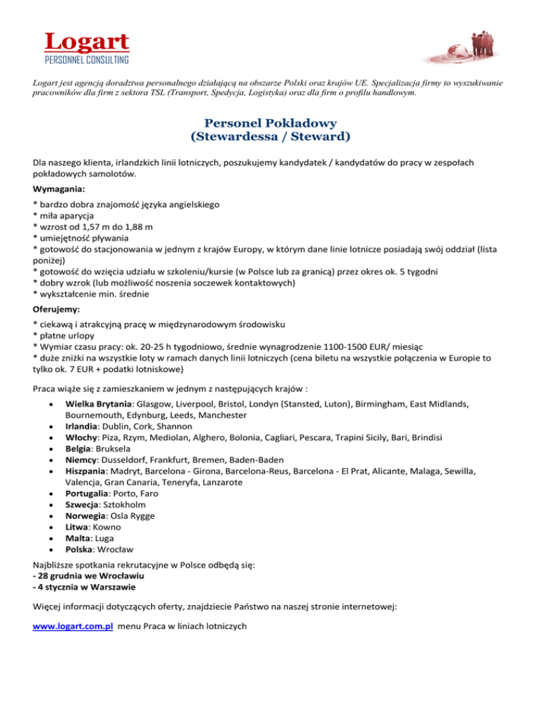 Logart PERSONNEL CONSULTING Logart jest agencją doradztwa personalnego działającą na obszarze Polski oraz krajów UE. Specjalizacja firmy to wyszukiwanie pracowników dla firm z sektora TSL (Transport, Spedycja, Logistyka) oraz dla firm o profilu handlowym. Personel Pokładowy (Stewardessa / Steward) Dla naszego klienta, irlandzkich linii lotniczych, poszukujemy kandydatek / kandydatów do pracy w zespołach pokładowych samolotów. Wymagania: * bardzo dobra znajomość języka angielskiego * miła aparycja * wzrost od 1,57 m do 1,88 m * umiejętność pływania * gotowość do stacjonowania w jednym z krajów Europy, w którym dane linie lotnicze posiadają swój oddział (lista poniżej) * gotowość do wzięcia udziału w szkoleniu/kursie (w Polsce lub za granicą) przez okres ok. 5 tygodni * dobry wzrok (lub możliwość noszenia soczewek kontaktowych) * wykształcenie min. średnie Oferujemy: * ciekawą i atrakcyjną pracę w międzynarodowym środowisku * płatne urlopy * Wymiar czasu pracy: ok. 20-25 h tygodniowo, średnie wynagrodzenie 1100-1500 EUR/ miesiąc * duże zniżki na wszystkie loty w ramach danych linii lotniczych (cena biletu na wszystkie połączenia w Europie to tylko ok. 7 EUR + podatki lotniskowe) Praca wiąże się z zamieszkaniem w jednym z następujących krajów : Wielka Brytania: Glasgow, Liverpool, Bristol, Londyn (Stansted, Luton), Birmingham, East Midlands, Bournemouth, Edynburg, Leeds, Manchester Irlandia: Dublin, Cork, Shannon Włochy: Piza, Rzym, Mediolan, Alghero, Bolonia, Cagliari, Pescara, Trapini Sicily, Bari, Brindisi Belgia: Bruksela Niemcy: Dusseldorf, Frankfurt, Bremen, Baden-Baden Hiszpania: Madryt, Barcelona - Girona, Barcelona-Reus, Barcelona - El Prat, Alicante, Malaga, Sewilla, Valencja, Gran Canaria, Teneryfa, Lanzarote Portugalia: Porto, Faro Szwecja: Sztokholm Norwegia: Osla Rygge Litwa: Kowno Malta: Luga Polska: Wrocław Najbliższe spotkania rekrutacyjne w Polsce odbędą się: - 28 grudnia we Wrocławiu - 4 stycznia w Warszawie Więcej informacji dotyczących oferty, znajdziecie Państwo na naszej stronie internetowej: www.logart.com.pl menu Praca w liniach lotniczych Logart PERSONNEL CONSULTING Osoby zainteresowane prosimy o przesłanie CV w języku angielskim wraz ze zdjęciem na adres: [email protected] W temacie lub treści maila prosimy wpisać preferowane miasto i termin spotkania. W razie dodatkowych pytań prosimy o kontakt pod numerem telefonu 665 33 32 36. Prosimy o dopisanie następującej klauzuli: "Wyrażam zgodę na przetwarzanie moich danych osobowych zawartych w mojej ofercie pracy dla potrzeb niezbędnych do realizacji procesu rekrutacji zgodnie z ustawą z dnia 29 sierpnia 1997 r. o ochronie danych osobowych (Dz. U. z 2002 r. Nr 101, poz. 926, ze zm.)"