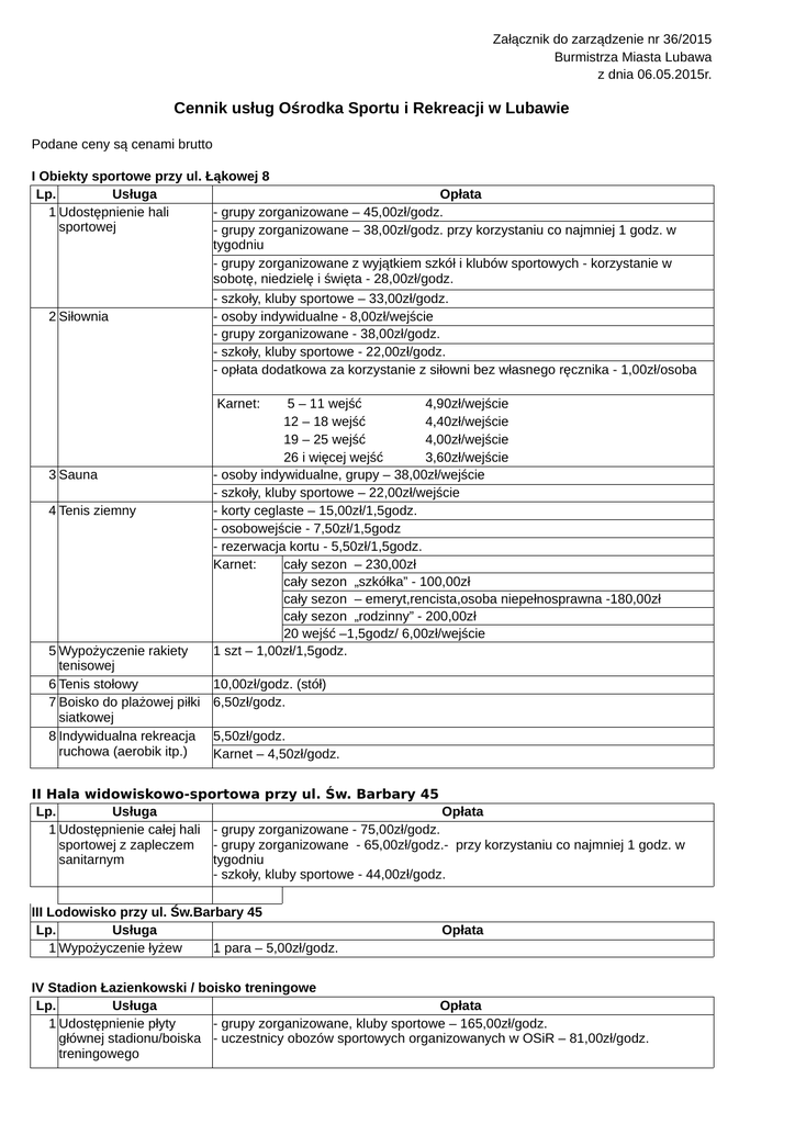Załącznik do zarządzenie nr 36/2015 Burmistrza Miasta Lubawa z dnia 06.05.2015r. Cennik usług Ośrodka Sportu i Rekreacji w Lubawie Podane ceny są cenami brutto I Obiekty sportowe przy ul. Łąkowej 8 Lp. Usługa Opłata 1 Udostępnienie hali - grupy zorganizowane – 45,00zł/godz. sportowej - grupy zorganizowane – 38,00zł/godz. przy korzystaniu co najmniej 1 godz. w tygodniu - grupy zorganizowane z wyjątkiem szkół i klubów sportowych - korzystanie w sobotę, niedzielę i święta - 28,00zł/godz. - szkoły, kluby sportowe – 33,00zł/godz. 2 Siłownia - osoby indywidualne - 8,00zł/wejście - grupy zorganizowane - 38,00zł/godz. - szkoły, kluby sportowe - 22,00zł/godz. - opłata dodatkowa za korzystanie z siłowni bez własnego ręcznika - 1,00zł/osoba Karnet: 3 Sauna 4 Tenis ziemny 5 Wypożyczenie rakiety tenisowej 6 Tenis stołowy 7 Boisko do plażowej piłki siatkowej 8 Indywidualna rekreacja ruchowa (aerobik itp.) 5 – 11 wejść 4,90zł/wejście 12 – 18 wejść 4,40zł/wejście 19 – 25 wejść 4,00zł/wejście 26 i więcej wejść 3,60zł/wejście - osoby indywidualne, grupy – 38,00zł/wejście - szkoły, kluby sportowe – 22,00zł/wejście - korty ceglaste – 15,00zł/1,5godz. - osobowejście - 7,50zł/1,5godz - rezerwacja kortu - 5,50zł/1,5godz. Karnet: cały sezon – 230,00zł cały sezon „szkółka” - 100,00zł cały sezon – emeryt,rencista,osoba niepełnosprawna -180,00zł cały sezon „rodzinny” - 200,00zł 20 wejść –1,5godz/ 6,00zł/wejście 1 szt – 1,00zł/1,5godz. 10,00zł/godz. (stół) 6,50zł/godz. 5,50zł/godz. Karnet – 4,50zł/godz. II Hala widowiskowo-sportowa przy ul. Św. Barbary 45 Lp. Usługa Opłata 1 Udostępnienie całej hali - grupy zorganizowane - 75,00zł/godz. sportowej z zapleczem - grupy zorganizowane - 65,00zł/godz.- przy korzystaniu co najmniej 1 godz. w sanitarnym tygodniu - szkoły, kluby sportowe - 44,00zł/godz. III Lodowisko przy ul. Św.Barbary 45 Lp. Usługa 1 Wypożyczenie łyżew 1 para – 5,00zł/godz. Opłata IV Stadion Łazienkowski / boisko treningowe Lp. Usługa Opłata 1 Udostępnienie płyty - grupy zorganizowane, kluby sportowe – 165,00zł/godz. głównej stadionu/boiska - uczestnicy obozów sportowych organizowanych w OSiR – 81,00zł/godz. treningowego 2 Udostępnienie bieżni, urządzeń lekkoatletycznych - grupy zorganizowane, kluby sportowe – 49,00zł/godz. - szkoły spoza terenu miasta Lubawa - 38,00zł/godz. V Pokoje noclegowe Lp. Nr pokoju 1 2 3 4 5 6 7 8 9 10 11 12 13 14 Noclegi dla firm 14C 14A 14B 10 16 17 12 15 18A 13A 11 18B 13B 1 52,00 zł 52,00 zł 52,00 zł 65,00 zł 65,00 zł 65,00 zł 65,00 zł 65,00 zł 65,00 zł 65,00 zł 65,00 zł 65,00 zł 65,00 zł Ilość osób w pokoju Uwagi 2 3 4 5 Upust w wysokości - 25% dla korzystających 95,00 zł - z noclegów w dniach sobota, niedziela 95,00 zł 110,00 zł 100,00 zł 110,00 zł 110,00 zł 125,00 zł 110,00 zł 125,00 zł 100,00 zł 115,00 zł 110,00 zł 125,00 zł 110,00 zł 125,00 zł 155,00 zł 170,00 zł 110,00 zł 125,00 zł 155,00 zł 170,00 zł 110,00 zł 125,00 zł 155,00 zł 170,00 zł 26,00zł/osobodoba Cena obowiązuje przy pobytach cyklicznych lub trwających nieprzerwanie 4 doby lub więcej w pokojach 3, 4 i 5 osobowych (grupy co najmniej 3 osobowe) 15 Śniadanie 16 Zestaw obiadowy VI Park linowy Lp. Usługa 10,00zł/osoba wg.cen dostawców Korzystanie w miesiącach maj, czerwiec, lipiec, sierpień wrzesień oraz przy otwarciach jednorazowych w pozostałych miesiącach Opłata zwykła Opłata ulgowa (dzieci i młodzież do 18 roku życia) Opłata zwykła 1 Przejście jednej trasy przez 1 osobę 10,00 zł 5,00 zł 15,00 zł 2 Grupy liczące co najmniej 20 osób – 1 trasa/1 osoba 9,00 zł 4,50 zł 13,50 zł - Uwagi Opłata ulgowa (dzieci i młodzież do 18 roku życia) 10,00 zł x 9,00 zł Nie stosuje się upustów dla posiadaczy Karty Dużej Rodziny VII Organizacja obozów sportowych – 69,00zł/osobodzień (cena obejmuje: nocleg, wyżywienie oraz korzystanie z obiektów), upusty w drodze negocjacji. VIII Powierzchnia reklamowa – opłaty ustalane indywidualnie w zależności od miejsca i okoliczności wystawienia reklamy. IX Wpisowe do rozgrywek turniejowych i ligowych, zawodów sportowych organizowanych przez OSiR – ustalane oddzielnie na każde zawody. Stosuje się: - upusty w wysokości 50% dla posiadaczy "Karty Dużej Rodziny" korzystających z parku linowego, siłowni, aerobiku, tenisa ziemnego, tenisa stołowego, boiska do plażowej piłki siatkowej oraz z wypożyczenia łyżew.