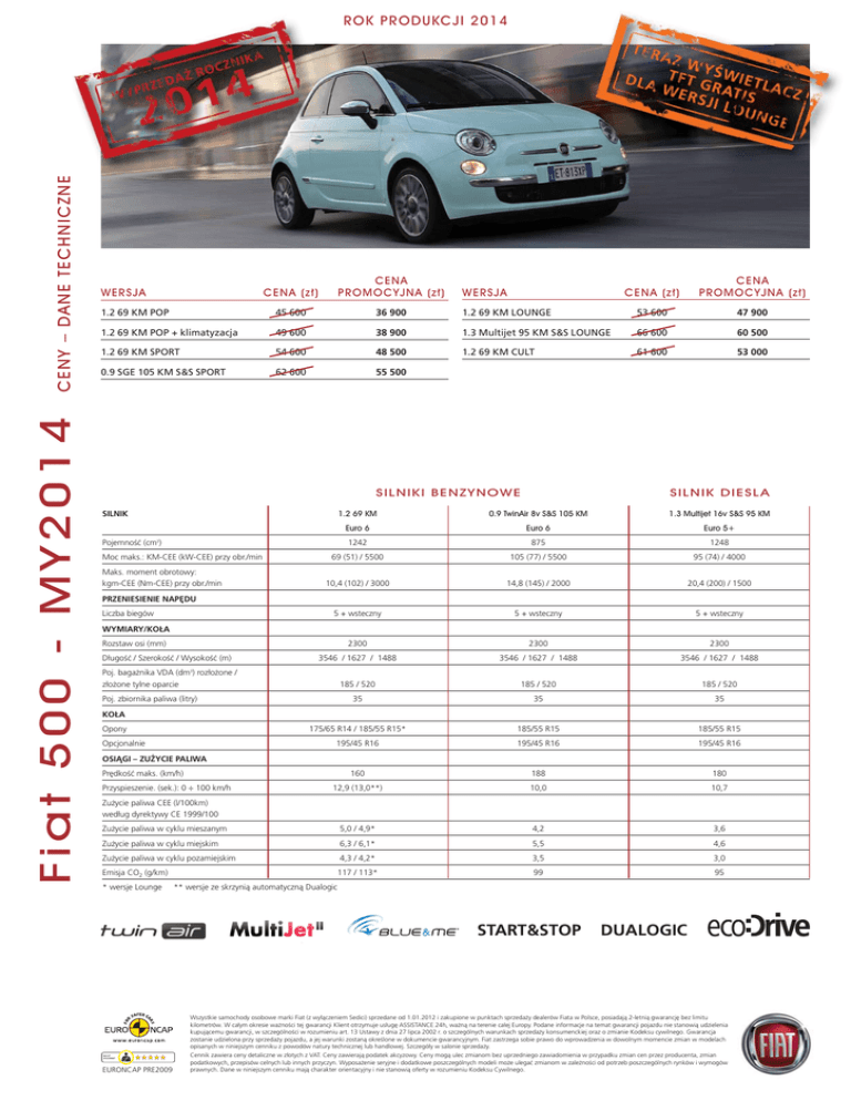 Fi a t 5 0 0 - M Y 2 0 1 4 CENY – DANE TECHNICZNE ROK PRODUKCJI 2014 CENA (z∏) CENA PROMOCYJNA (z∏) 1.2 69 KM LOUNGE 53 600 47 900 38 900 1.3 Multijet 95 KM S&S LOUNGE 66 600 60 500 1.2 69 KM CULT 61 600 53 000 CENA (z∏) CENA PROMOCYJNA (z∏) 1.2 69 KM POP 45 600 36 900 1.2 69 KM POP + klimatyzacja 49 600 WERSJA 1.2 69 KM SPORT 54 600 48 500 0.9 SGE 105 KM S&S SPORT 62 600 55 500 WERSJA SILNIKI BENZYNOWE SILNIK 1.2 69 KM 0.9 TwinAir 8v S&S 105 KM 1.3 Multijet 16v S&S 95 KM Euro 6 Euro 6 Euro 5+ 1242 875 1248 69 (51) / 5500 105 (77) / 5500 95 (74) / 4000 10,4 (102) / 3000 14,8 (145) / 2000 20,4 (200) / 1500 5 + wsteczny 5 + wsteczny 5 + wsteczny Pojemność (cm3) Moc maks.: KM-CEE (kW-CEE) przy obr./min SILNIK DIESLA Maks. moment obrotowy: kgm-CEE (Nm-CEE) przy obr./min PRZENIESIENIE NAPĘDU Liczba biegów WYMIARY/KOŁA Rozstaw osi (mm) Długość / Szerokość / Wysokość (m) 2300 2300 2300 3546 / 1627 / 1488 3546 / 1627 / 1488 3546 / 1627 / 1488 185 / 520 185 / 520 185 / 520 35 35 35 Poj. bagażnika VDA (dm3) rozłożone / złożone tylne oparcie Poj. zbiornika paliwa (litry) KOŁA Opony Opcjonalnie 175/65 R14 / 185/55 R15* 185/55 R15 185/55 R15 195/45 R16 195/45 R16 195/45 R16 OSIĄGI – ZUŻYCIE PALIWA Prędkość maks. (km/h) Przyspieszenie. (sek.): 0 ÷ 100 km/h 160 188 180 12,9 (13,0**) 10,0 10,7 Zużycie paliwa CEE (l/100km) według dyrektywy CE 1999/100 Zużycie paliwa w cyklu mieszanym 5,0 / 4,9* 4,2 3,6 Zużycie paliwa w cyklu miejskim 6,3 / 6,1* 5,5 4,6 Zużycie paliwa w cyklu pozamiejskim 4,3 / 4,2* 3,5 3,0 Emisja CO2 (g/km) 117 / 113* 99 95 * wersje Lounge ** wersje ze skrzynią automatyczną Dualogic START&STOP DUALOGIC Wszystkie samochody osobowe marki Fiat (z wyłączeniem Sedici) sprzedane od 1.01.2012 i zakupione w punktach sprzedaży dealerów Fiata w Polsce, posiadają 2-letnią gwarancję bez limitu kilometrów. W całym okresie ważności tej gwarancji Klient otrzymuje usługę ASSISTANCE 24h, ważną na terenie całej Europy. Podane informacje na temat gwarancji pojazdu nie stanowią udzielenia kupującemu gwarancji, w szczególności w rozumieniu art. 13 Ustawy z dnia 27 lipca 2002 r. o szczególnych warunkach sprzedaży konsumenckiej oraz o zmianie Kodeksu cywilnego. Gwarancja zostanie udzielona przy sprzedaży pojazdu, a jej warunki zostaną określone w dokumencie gwarancyjnym. Fiat zastrzega sobie prawo do wprowadzenia w dowolnym momencie zmian w modelach opisanych w niniejszym cenniku z powodów natury technicznej lub handlowej. Szczegóły w salonie sprzedaży. EURONCAP PRE2009 Cennik zawiera ceny detaliczne w złotych z VAT. Ceny zawierają podatek akcyzowy. Ceny mogą ulec zmianom bez uprzedniego zawiadomienia w przypadku zmian cen przez producenta, zmian podatkowych, przepisów celnych lub innych przyczyn. Wyposażenie seryjne i dodatkowe poszczególnych modeli może ulegać zmianom w zależności od potrzeb poszczególnych rynków i wymogów prawnych. Dane w niniejszym cenniku mają charakter orientacyjny i nie stanowią oferty w rozumieniu Kodeksu Cywilnego. Fi a t 5 0 0 - M Y 2 0 1 4 WYBRANE ELEMENTY WYPOSA˚ENIA ROK PRODUKCJI 2014 LINIA I STYL NR OPCJI POP Zderzaki w kolorze nadwozia a Kierownica pokryta skórą z przyciskami sterowania radioodtwarzaczem 318 600 zł Kierownica sportowa Abarth Design z przyciskami sterowania radioodtwarzaczem 6BQ 5 Lusterka zewnętrzne elektrycznie sterowane w kolorze czarnym 218 a Lusterka zewnętrzne w kolorze nadwozia, elektrycznie sterowane, podgrzewane, zawierają czujnik temperatury zewnętrznej (w kolorze czarnym błyszczącym dla wersji Cult) 041 800 zł Dach i spojler w kolorze czarnym 4GS 5 Przyciemniane szyby tylne 070 500 zł Tapicerka skórzana Frau 211 4 000 zł Listwy boczne ochronne lakierowane z logo 500 4M5 450 zł Pakiet Chromo: chromowane listwy pod linią okien bocznych, chromowana końcówka rury wydechowej, chromowane listwy na przednim i tylnym zderzaku, chromowana górna część dźwigni zmiany biegów 4MQ 600 zł Pakiet Sport: sportowe siedzenia przednie, spojler tylny, specjalne kolory wnętrza i tapicerek, chromowana końcówka rury wydechowej, chromowane listwy progowe 751 5 Specjalne kołpaki kół Vintage 14” 878 300 zł Felgi ze stopów lekkich 15” 14-ramienne, z oponami 185/55 R15 ▼ 6U4 1 500 zł Felgi ze stopów lekkich 15” 18-ramienne, z oponami 185/55 R15 ▼ 431 1 500 zł Felgi ze stopów lekkich 15” Lounge, z oponami 185/55 R15 ▼ 73Z 1 000 zł ▼ Felgi ze stopów lekkich 15” Extraserie, diamentowy szlif, z oponami 185/55 R15 5YN 1 500 zł Felgi ze stopów lekkich 16” Cult, z oponami 195/45 R16 ▼ 74A 2 000 zł Felgi ze stopów lekkich 15” Sport, 5-ramienne, dwukolorowe, diamentowy szlif, z oponami 185/55 R15 ▼ 439 1 500 zł Felgi ze stopów lekkich 16”, wersja specjalna „S”, z oponami 195/45 R16 ▼ 5A6 5 Felgi ze stopów lekkich 16” sportowe, z oponami 195/45 R16 ▼ 6JD 5 ▼ Felgi ze stopów lekkich 16” 5-ramienne, diamentowy szlif, z oponami 195/45 R16 420 2 000 zł ▼ Felgi ze stopów lekkich 16” 17-ramienne, z oponami 195/45 R16 435 2 000 zł Chromowane obudowy lusterek 4RR 400 zł KOMFORT/FUNKCJONALNOŚĆ Fiat CODE (immobiliser) a Zestaw wskaźników z obrotomierzem a Cyfrowy zestaw wskaźników z kolorowym, 7-calowym wyświetlaczem ciekłokrystalicznym TFT 4GF 5 Zagłówki przednie z regulacją wysokości a Kierownica z regulacją wysokości a Elektryczne dwustopniowe wspomaganie kierownicy Dualdrive™ a Start&Stop: automatyczne wyłączanie i ponowne uruchamianie silnika podczas tymczasowego zatrzymania się (opcja w wersji benzynowej 1.2 69 KM) 5DE 1 200 zł Elektrycznie sterowane szyby przednie a Reflektory przednie z systemem Follow Me Home a Centralny zamek z pilotem w kluczyku a Zestaw do szybkiej naprawy opon (Fix&Go) a Zapasowe koło dojazdowe 135/80 R14 (wyklucza zestaw Fix&Go) 803 300 zł Klimatyzacja manualna z filtrem przeciwpyłkowym 025 4 000 zł Klimatyzacja automatyczna (jednostrefowa) z filtrem przeciwpyłkowy