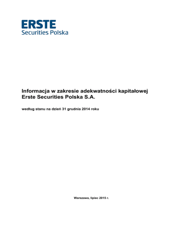 Informacja w zakresie adekwatności kapitałowej Erste Securities Polska S.A. według stanu na dzień 31 grudnia 2014 roku Warszawa, lipiec 2015 r. 1. Wprowadzenie Upublicznienie informacji zawartych w dokumencie jest dokonywane w oparciu o: Politykę Informacyjną Domu Maklerskiego ERSTE Securities Polska S.A. w Zakresie Adekwatności Kapitałowej; Rozporządzenie Ministra Finansów z dnia 26 listopada 2009 r. w sprawie upowszechniania informacji związanych z adekwatnością kapitałową (Dz. U. z 2009 r. Nr 210, poz. 1615 z późn. zm.) („Rozporządzenie w sprawie upowszechniania”); Rozporządzenie Parlamentu Europejskiego i Rady (UE) nr 575/2013 z dnia 26 czerwca 2013 r. w sprawie wymogów ostrożnościowych dla instytucji kredytowych i firm inwestycyjnych, zmieniające rozporządzenie (UE) nr 648/2012, zwane dalej „Rozporządzenie CRR” lub „CRR” (Dz.U. UE L 176 z dnia 27 czerwca 2013 roku z późn. zm). Informacje spełniają również wymogi wynikające z Rozporządzenia wykonawczego Komisji (UE) nr 680/2014 z dnia 16 kwietnia 2014 roku ustanawiającego wykonawcze standardy techniczne dotyczące sprawozdawczości nadzorczej instytucji zgodnie z rozporządzeniem Parlamentu Europejskiego i Rady (UE) nr 575/2013 („Rozporządzenie ITS”) (Dz.U. UE L 191 z dnia 28 czerwca 2014 roku z późn. zm.); Rozporządzenie Wykonawcze Komisji (UE) nr 1423/2013 z dnia 20 grudnia 2013 r. ustanawiające wykonawcze standardy techniczne w zakresie wymogów dotyczących ujawniania informacji na temat funduszy własnych instytucji zgodnie z rozporządzeniem Parlamentu Europejskiego i Rady (UE) nr 575/2013; Wytyczne EBA w sprawie istotności, zastrzeżonego charakteru i poufności ujawnianych informacji oraz częstotliwości ujawniania z art. 432 ust 1, art. 432 ust. 2 i art. 433 rozporządzenia (UE) nr 575/2013. ERSTE Securities Polska S.A. jest istotnym podmiotem zależnym od unijnej instytucji dominującej, o której mowa w art. 4 ust. 1 pkt 30 ustawy z dnia 29 sierpnia 1997 r. – Prawo bankowe (Dz. U. z 2012 r. poz. 1376, z późn. zm.) i zgodnie z §4 ust. 4 Rozporządzenia w sprawie upowszechniania, upowszechnia wyłącznie informacje, o których mowa w § 3 i 4 Załącznika nr 1 do Rozporządzenia w sprawie upowszechniania. Informacje związane z adekwatnością kapitałową są prezentowane w ujęciu jednostkowym. Erste Securities Polska S.A. upowszechnia również informacje określone w Tytule II Części Ósmej Rozporządzenia CRR. Erste Securities Polska S.A. nie upowszechnia dodatkowych informacji określonych w Tytule III Części Ósmej Rozporządzenia CRR, ponieważ nie stosuje instrumentów ani metod określonych w tym Tytule. 2. Informacje ogólne Dom Maklerski Erste Securities Polska S.A. (dalej „Spółka” lub „Dom Maklerski”) jest spółką akcyjną z siedzibą przy ul. Królewskiej 16, 00-103 Warszawa. Spółka prowadzi działalność maklerską na podstawie zezwolenia Komisji Papierów Wartościowych i Giełd nr KPWiG-4021-8/2002 z dnia 16 kwietnia 2002 roku w następującym zakresie: 1) oferowania papierów wartościowych w obrocie pierwotnym lub w pierwszej ofercie publicznej, 2) nabywania lub zbywania papierów wartościowych na cudzy rachunek, 3) nabywania lub zbywania papierów wartościowych na własny rachunek celem realizacji zadań związanych z organizacją rynku regulowanego, 4) prowadzenia rachunków papierami wartościowymi oraz rachunków pieniężnych służących do ich obsługi, 5) pośrednictwa w nabywaniu lub zbywaniu papierów wartościowych będących w obrocie na zagranicznych rynkach regulowanych, 6) podejmowania czynności faktycznych i prawnych związanych z obsługą towarzystw funduszy inwestycyjnych, funduszy inwestycyjnych, towarzystw emerytalnych i funduszy emerytalnych, 7) dokonywania czynności związanych z obrotem prawami majątkowymi, dokonywania czynności związanych z obrotem towarami giełdowymi. 2 Zgodnie z decyzją Komisji Nadzoru Finansowego nr DFL/4020/166/31/I/18/7/2009/10/KD z dnia 1 września 2010 roku Spółka działa również w następującym zakresie: 1) sporządzania analiz inwestycyjnych, 2) sporządzania analiz finansowych, 3) sporządzania innych rekomendacji o charakterze ogólnym dotyczącym transakcji w zakresie instrumentów finansowych. Zgodnie z decyzją Komisji Nadzoru Finansowego nr DRK/4020/30/14/18/1/12/WL z dnia 3 kwietnia 2012 roku Spółka działa również w następującym zakresie: 1) przyjmowania i przekazywania zleceń nabycia lub zbycia instrumentów finansowych, 2) doradztwa inwestycyjnego. Spółka wpisana jest do Rejestru Przedsiębiorców prowadzonego przez Sąd Rejonowy dla m. st. Warszawy w Warszawie, XII Wydział Gospodarczy Krajowego Rejestru Sądowego pod nr KRS 0000065121. Wszystkie informacje przedstawione w niniejszym dokumencie zostały przygotowane według stanu na dzień 31 grudnia 2014 r. i odwołują się do okresu 12 miesięcy kończących się 31 grudnia 2014 roku lub okresów porównywalnych. 3. Informacje finansowe Sprawozdanie finansowe Erste Securities Polska S.A. za rok 2014 zatwierdzone przez Zwyczajne Walne Zgromadzenie Erste Securities Polska S.A. w dniu 30 czerwca 2015 roku zawierające: wprowadzenie do sprawozdania, bilans, rachunek zysków i strat, zestawienie zmian w kapitale własnym, rachunek przepływów pieniężnych za rok obrotowy, opinię biegłego rewidenta zostało zamieszczone na stronie internetowej Domu Maklerskiego www.esp.pl. 4. Cele i strategie w zakresie zarządzania ryzykiem Strategia i procesy w zakresie zarządzania poszczególnymi ryzykami W ramach systemu zarządzania ryzykiem wydzielona została komórka Specjalisty ds. Zarządzania Ryzykiem, którego zadaniem jest bieżący monitoring i doradzanie Zarządowi w kwestii podejmowanego ryzyka. Proces zarządzania ryzykiem w Erste Securities Polska S.A. obejmuje identyfikację ryzyka, jego ocenę i pomiar oraz monitorowanie, kontrolę i raportowanie, jak również podejmowanie decyzji i dzia