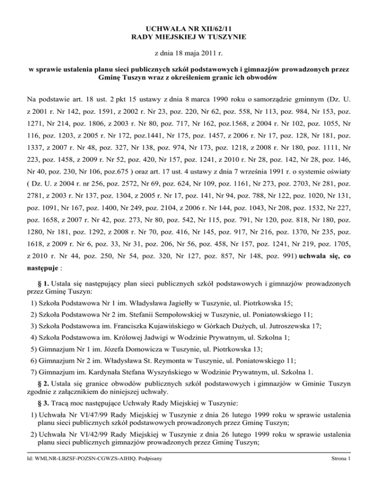 UCHWAŁA NR XII/62/11 RADY MIEJSKIEJ W TUSZYNIE z dnia 18 maja 2011 r. w sprawie ustalenia planu sieci publicznych szkół podstawowych i gimnazjów prowadzonych przez Gminę Tuszyn wraz z określeniem granic ich obwodów Na podstawie art. 18 ust. 2 pkt 15 ustawy z dnia 8 marca 1990 roku o samorządzie gminnym (Dz. U. z 2001 r. Nr 142, poz. 1591, z 2002 r. Nr 23, poz. 220, Nr 62, poz. 558, Nr 113, poz. 984, Nr 153, poz. 1271, Nr 214, poz. 1806, z 2003 r. Nr 80, poz. 717, Nr 162, poz.1568, z 2004 r. Nr 102, poz. 1055, Nr 116, poz. 1203, z 2005 r. Nr 172, poz.1441, Nr 175, poz. 1457, z 2006 r. Nr 17, poz. 128, Nr 181, poz. 1337, z 2007 r. Nr 48, poz. 327, Nr 138, poz. 974, Nr 173, poz. 1218, z 2008 r. Nr 180, poz. 1111, Nr 223, poz. 1458, z 2009 r. Nr 52, poz. 420, Nr 157, poz. 1241, z 2010 r. Nr 28, poz. 142, Nr 28, poz. 146, Nr 40, poz. 230, Nr 106, poz.675 ) oraz art. 17 ust. 4 ustawy z dnia 7 września 1991 r. o systemie oświaty ( Dz. U. z 2004 r. nr 256, poz. 2572, Nr 69, poz. 624, Nr 109, poz. 1161, Nr 273, poz. 2703, Nr 281, poz. 2781, z 2003 r. Nr 137, poz. 1304, z 2005 r. Nr 17, poz. 141, Nr 94, poz. 788, Nr 122, poz. 1020, Nr 131, poz. 1091, Nr 167, poz. 1400, Nr 249, poz. 2104, z 2006 r. Nr 144, poz. 1043, Nr 208, poz. 1532, Nr 227, poz. 1658, z 2007 r. Nr 42, poz. 273, Nr 80, poz. 542, Nr 115, poz. 791, Nr 120, poz. 818, Nr 180, poz. 1280, Nr 181, poz. 1292, z 2008 r. Nr 70, poz. 416, Nr 145, poz. 917, Nr 216, poz. 1370, Nr 235, poz. 1618, z 2009 r. Nr 6, poz. 33, Nr 31, poz. 206, Nr 56, poz. 458, Nr 157, poz. 1241, Nr 219, poz. 1705, z 2010 r. Nr 44, poz. 250, Nr 54, poz. 320, Nr 127, poz. 857, Nr 148, poz. 991) uchwala się, co następuje : § 1. Ustala się następujący plan sieci publicznych szkół podstawowych i gimnazjów prowadzonych przez Gminę Tuszyn: 1) Szkoła Podstawowa Nr 1 im. Władysława Jagiełły w Tuszynie, ul. Piotrkowska 15; 2) Szkoła Podstawowa Nr 2 im. Stefanii Sempołowskiej w Tuszynie, ul. Poniatowskiego 11; 3) Szkoła Podstawowa im. Franciszka Kujawińskiego w Górkach Dużych, ul. Jutroszewska 17; 4) Szkoła Podstawowa im. Królowej Jadwigi w Wodzinie Prywatnym, ul. Szkolna 1; 5) Gimnazjum Nr 1 im. Józefa Domowicza w Tuszynie, ul. Piotrkowska 13; 6) Gimnazjum Nr 2 im. Władysława St. Reymonta w Tuszynie, ul. Poniatowskiego 11; 7) Gimnazjum im. Kardynała Stefana Wyszyńskiego w Wodzinie Prywatnym, ul. Szkolna 1. § 2. Ustala się granice obwodów publicznych szkół podstawowych i gimnazjów w Gminie Tuszyn zgodnie z załącznikiem do niniejszej uchwały. § 3. Tracą moc następujące Uchwały Rady Miejskiej w Tuszynie: 1) Uchwała Nr VI/47/99 Rady Miejskiej w Tuszynie z dnia 26 lutego 1999 roku w sprawie ustalenia planu sieci publicznych szkół podstawowych prowadzonych przez Gminę Tuszyn; 2) Uchwała Nr VI/42/99 Rady Miejskiej w Tuszynie z dnia 26 lutego 1999 roku w sprawie ustalenia planu sieci publicznych gimnazjów prowadzonych przez Gminę Tuszyn; Id: WMLNR-LBZSF-POZSN-CGWZS-AIHIQ. Podpisany Strona 1 3) Uchwała N rXX/152/2000 Rady Miejskiej w Tuszynie z dnia 20 kwietnia 2000 roku w sprawie zmiany Uchwały Nr VI/42/99 Rady Miejskiej w Tuszynie z dnia 26 lutego 1999 roku w sprawie ustalenia planu sieci publicznych gimnazjów prowadzonych przez Gminę Tuszyn; 4) Uchwała Nr VI/39/99 Rady Miejskiej w Tuszynie z dnia 26 lutego 1999 roku w sprawie określenia obwodu publicznej Szkoły Podstawowej Nr 1 w Tuszynie im. Władysława Jagiełły Tuszyn ul. Piotrkowska 13; 5) Uchwała Nr VI/40/99 Rady Miejskiej w Tuszynie z dnia 26 lutego 1999 roku w sprawie określenia obwodu publicznej Szkoły Podstawowej Nr 2 w Tuszynie im. Stefanii Sempołowskiej Tuszyn ul. Poniatowskiego 11; 6) Uchwała Nr VI/41/99 Rady Miejskiej w Tuszynie z dnia 26 lutego 1999 roku w sprawie określenia obwodu publicznej Szkoły Podstawowej w Górkach Dużych ul. Jutroszewska 17; 7) Uchwała Nr VI/46/99 Rady Miejskiej w Tuszynie z dnia 26 lutego 1999 roku w sprawie określenia obwodu publicznej Szkoły Podstawowej w Wodzinie Prywatnym ul. Szkolna 1; 8) Uchwała Nr VI/45/99 Rady Miejskiej w Tuszynie z dnia 26 lutego 1999 roku w sprawie określenia obwodu publicznej Szkoły Podstawowej w Kruszowie ul. Szkolna 13; 9) Uchwała Nr VI/43/99 Rady Miejskiej w Tuszynie z dnia 26 lutego 1999 roku w sprawie określenia obwodu publicznego Gimnazjum Nr 1 w Tuszynie, Tuszyn, ul. Piotrkowska 13; 10) Uchwała Nr XVIII/136/2000 Rady Miejskiej w Tuszynie z dnia 25 lutego 2000 roku w sprawie zmiany Uchwały Nr VI/43/99 Rady Miejskiej w Tuszynie z dnia 26 lutego 1999 r. w sprawie określenia obwodu publicznego Gimnazjum Nr 1 w Tuszynie, Tuszyn ul. Piotrkowska 13; 11) Uchwała Nr XX/153/2000 Rady Miejskiej w Tuszynie z dnia 20 kwietnia 2000 roku w sprawie zmiany Uchwały Nr VI/43/99 Rady Miejskiej w Tuszynie z dnia 26 lutego 1999 r. w sprawie określenia obwodu publicznego Gimnazjum Nr 1 w Tuszynie, Tuszyn ul. Piotrkowska 13; 12) Uchwała Nr VI/44/99 Rady Miejskiej w Tuszynie z dnia 26 lutego 1999 roku w sprawie określenia obwodu publicznego Gimnazjum Nr 2 w Tuszynie, Tuszyn, ul. Poniatowskiego 11. § 4. Wykonanie uchwały powierza się Burmistrzowi Miasta Tuszyna. § 5. Uchwała wchodzi w życie po upływie 14 dni od dnia jej ogłoszenia w Dzienniku Urzędowym Województwa Łódzkiego, z mocą obowiązującą od dnia 1 września 2011 r. Przewodniczący Rady Miejskiej w Tuszynie Andrzej Małecki Id: WMLNR-LBZSF-POZSN-CGWZS-AIHIQ. Podpisany Strona 2 Załącznik do Uchwały Nr XII/62/11 RADY MIEJSKIEJ W TUSZYNIE z dnia 18 maja 2011 r. Obwody publicznych szkół podstawowych i gimnazjów prowadzonych przez Gminę Tuszyn § 1. Ustala się następujące granice obwodów publicznych szkół podstawowych i gimnazjów prowadzonych przez Gminę Tuszyn: 1) Szkoła Podstawowa Nr 1 im. Władysława Jagiełły w Tuszynie, ul. Piotrkowska 15 : Dzielnica Tuszyn Stare Miasto , do obszaru której należą ulice: Jana Pawła II (cała strona parzysta oraz strona nieparzysta do nr 15), Aleksandra Zwierzyńskiego