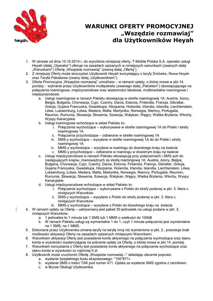 WARUNKI OFERTY PROMOCYJNEJ „Wszędzie rozmawiaj” dla Użytkowników Heyah 1. W okresie od dnia 14.10.2014 r. do wycofania niniejszej oferty, T-Mobile Polska S.A. operator usługi Heyah (dalej „Operator”) oferuje na zasadach opisanych w niniejszych warunkach (zwanych dalej „Warunkami”) Ofertę „Wszędzie rozmawiaj” (zwaną dalej „Ofertą”). 2. Z niniejszej Oferty może skorzystać Użytkownik Heyah korzystający z taryfy Dniówka, Nowa Heyah oraz Taryfa Pakietowa (zwany dalej „Użytkownikiem”). 3. Oferta Promocyjna „Wszędzie rozmawiaj” umożliwia – w ramach opłaty, o której mowa w pkt.14. poniżej - wybranie przez Użytkowników multipakietu (zwanego dalej „Pakietem”) obowiązującego na połączenia roamingowe, międzynarodowe oraz wiadomości tekstowe, multimedialne roamingowe i międzynarodowe a. Usługi roamingowe w ramach Pakietu obowiązują w strefie roamingowej 1A: Austria, Azory, Belgia, Bułgaria, Chorwacja, Cypr, Czechy, Dania, Estonia, Finlandia, Francja, Gibraltar, Grecja, Gujana Francuska, Gwadelupa, Hiszpania, Holandia, Irlandia, Islandia, Liechtenstein, Litwa, Luksemburg, Łotwa, Madera, Malta, Martynika, Norwegia, Niemcy, Portugalia, Reunion, Rumunia, Słowacja, Słowenia, Szwecja, Watykan, Węgry, Wielka Brytania, Włochy, Wyspy Kanaryjskie b. Usługi roamingowe wchodzące w skład Pakietu to: i. Połączenia wychodzące – wykonywane w strefie roamingowej 1A do Polski i strefy roamingowej 1A ii. Połączenia przychodzące – odbierane w strefie roamingowej 1A iii. SMS-y wychodzące – wysyłane w strefie roamingowej 1A do do Polski i strefy roamingowej 1A iv. MMS-y wychodzące – wysyłane w roamingu do dowolnego kraju na świecie v. MMS-y przychodzące – odbierane w roamingu w dowolnym kraju na świecie c. Usługi międzynarodowe w ramach Pakietu obowiązują przy połączeniach i SMS-ach do następujących krajów, równoważnych ze strefą roamingową 1A: Austria, Azory, Belgia, Bułgaria, Chorwacja, Cypr, Czechy, Dania, Estonia, Finlandia, Francja, Gibraltar, Grecja, Gujana Francuska, Gwadelupa, Hiszpania, Holandia, Irlandia, Islandia, Liechtenstein, Litwa, Luksemburg, Łotwa, Madera, Malta, Martynika, Norwegia, Niemcy, Portugalia, Reunion, Rumunia, Słowacja, Słowenia, Szwecja, Watykan, Węgry, Wielka Brytania, Włochy, Wyspy Kanaryjskie d. Usługi międzynarodowe wchodzące w skład Pakietu to: i. Połączenia wychodzące – wykonywane z Polski do strefy podanej w pkt. 3. litera c. niniejszych Warunków ii. SMS-y wychodzące – wysyłane z Polski do strefy podanej w pkt. 3. litera c. niniejszych Warunków iii. MMS-y wychodzące – wysyłane z Polski do dowolnego kraju na świecie 4. W ramach opłaty za Ofertę – uaktywniany jest pakiet 30 jednostek na usługi podane w pkt. 3. niniejszych Warunków: a. 1 jednostka to 1 minuta lub 1 SMS lub 1 MMS o wielkości do 100kB b. W ramach Pakietu usługi są wymienialne 1 do 1, czyli 1 minuta połączenia jest wymienialna na 1 SMS, na 1 MMS. 5. Dokonana przez Użytkownika zmiana taryfy na taryfę inną niż wymienione w pkt. 2., powoduje brak możliwości aktywacji Oferty na zasadach opisanych niniejszymi Warunkami. 6. Warunkiem aktywacji Oferty jest posiadanie konta aktywnego na połączenia wychodzące oraz stanu konta w wysokości wystarczającej na pobranie opłaty za Ofertę, o której mowa w pkt.14. poniżej. 7. Warunkiem korzystania z Oferty jest posiadanie konta aktywnego na połączenia wychodzące oraz stanu konta w wysokości co najmniej 0 zł. 8. Użytkownik może uruchomić Ofertę „Wszędzie rozmawiaj –” składając zlecenie poprzez: a. wysłanie bezpłatnego kodu ekspresowego: *100*871# b. wysłanie SMS o treści TAK pod numer 471. Opłata za wysłanie SMS zgodna z cennikiem. c. w Biurze Obsługi Użytkownika 9. Aktywacja Oferty nastąpi w ciągu 72 godzin od momentu zarejestrowania przez Operatora zlecenia aktywacji i zostanie potwierdzona wiadomością SMS. 10. Oferta jest aktywna przez 14 dni od momentu otrzymania wiadomości SMS z potwierdzeniem aktywacji Oferty. a. Użytkownik może skorzystać z Oferty wielokrotnie. b. W przypadku włączenia kolejnego pakietu (w momencie, gdy termin ważności poprzedniego pakietu jeszcze nie upłynął), jednostki z nowo nabytego pakietu kumulują się z tymi, które jeszcze nie zostały wykorzystane, a nowa data ważności wszystkich zgromadzonych na koncie jednostek w ramach Oferty jest liczona jako 14 dni od dnia aktywacji ostatniego pakietu. 11. Użytkownik może sprawdzić aktualne saldo jednostek w ramach Oferty poprzez: a. wysłanie bezpłatnego kodu ekspresowego *100*871*1# b. w Biurze Obsługi Użytkownika. 12. Operator może udostępnić inne sposoby aktywowania lub sprawdzenia statusu Oferty niż wskazane w niniejszych Warunkach. Informacje na ten temat dostępne są u Konsultanta w Biurze Obsługi Użytkownika, Punktach Sprzedaży oraz na www.heyah.pl. 13. Nie ma możliwości dezaktywacji Oferty przed upływem daty jej ważności. 14. Opłata za ofertę promocyjną „Wszędzie rozmawiaj –” wynosi 10 zł z VAT i jest pobierana jednorazowo w momencie aktywacji tej usługi. 15. W przypadku chęci ponownego skorzystania z Oferty, wymagana jest jej ponowna aktywacja i wówczas ponownie zostanie naliczona opłata. 16. W ramach Pakietu – połączenia roamingowe i międzynarodowe naliczane są za każdą rozpoczętą minutę połączenia. 17. W ramach Pakietu – MMS-y roamingowe i międzynarodowe naliczane są co 100kB. 18. Operator zastrzega sobie prawo do wycofania Oferty w każdym czasie bez podawania przyczyny. W przypadku Użytkownika, który skorzystał z Oferty wycofanie Oferty nie będzie powodować zaprzestania świadczenia usług na zasadach określonych w niniejszych Warunkach. 19. W kwestiach nieuregulowanych niniejszymi Warunkami, zastosowanie mają postanowienia wiążącego Użytkownika regulaminu świadczenia usług telekomunikacyjnych przez Operatora oraz cennika. 20. Podane ceny jednos