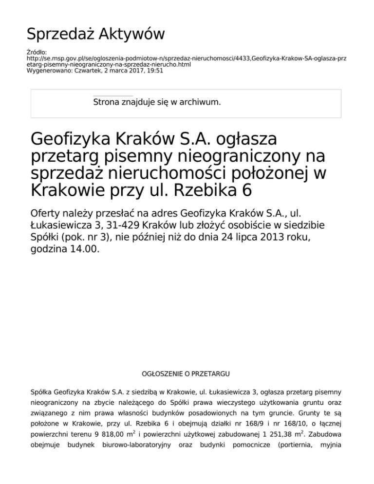 Sprzedaż Aktywów Źródło: http://se.msp.gov.pl/se/ogloszenia-podmiotow-n/sprzedaz-nieruchomosci/4433,Geofizyka-Krakow-SA-oglasza-prz etarg-pisemny-nieograniczony-na-sprzedaz-nierucho.html Wygenerowano: Czwartek, 2 marca 2017, 19:51 Strona znajduje się w archiwum. Geofizyka Kraków S.A. ogłasza przetarg pisemny nieograniczony na sprzedaż nieruchomości położonej w Krakowie przy ul. Rzebika 6 Oferty należy przesłać na adres Geofizyka Kraków S.A., ul. Łukasiewicza 3, 31-429 Kraków lub złożyć osobiście w siedzibie Spółki (pok. nr 3), nie później niż do dnia 24 lipca 2013 roku, godzina 14.00. OGŁOSZENIE O PRZETARGU Spółka Geofizyka Kraków S.A. z siedzibą w Krakowie, ul. Łukasiewicza 3, ogłasza przetarg pisemny nieograniczony na zbycie należącego do Spółki prawa wieczystego użytkowania gruntu oraz związanego z nim prawa własności budynków posadowionych na tym gruncie. Grunty te są położone w Krakowie, przy ul. Rzebika 6 i obejmują działki nr 168/9 i nr 168/10, o łącznej powierzchni terenu 9 818,00 m2 i powierzchni użytkowej zabudowanej 1 251,38 m2. Zabudowa obejmuje budynek biurowo-laboratoryjny oraz budynki pomocnicze (portiernia, myjnia samochodowa, przewijalnia kabli), a także budowle (drogi, parking, wiata, ogrodzenie, sieci infrastruktury). Dla opisanej nieruchomości Sąd Rejonowy dla Krakowa-Podgórza prowadzi księgę wieczystą KR1P/00068419/9. 1. Cena wywoławcza wynosi 3 586 850 PLN netto. Cena zostanie powiększona o podatek od towarów i usług wg. stawki obowiązującej w chwili zawarcia umowy. 2. Oferty należy przesłać na adres Geofizyka Kraków S.A., ul. Łukasiewicza 3, 31-429 Kraków lub złożyć osobiście w siedzibie Spółki (pok. nr 3), w zamkniętej kopercie z dopiskiem „Przetarg Rzebika”, nie później niż do dnia 24 lipca 2013 roku, godzina 14.00. 3. O wynikach przetargu wszyscy oferenci zostaną poinformowani niezwłocznie, ale nie później niż do dnia 31 lipca 2013 roku. 4. Podmioty przystępujące do przetargu zobowiązane są: a. przedłożyć wraz z ofertą: ■ osoby fizyczne – kserokopię dowodu osobistego lub paszportu, ■ małżonek składający samodzielnie ofertę nabycia przedmiotu przetargu do majątku wspólnego – pisemną zgodę drugiego małżonka, ■ osoby prawne i jednostki organizacyjne nie posiadające osobowości prawnej – wypis z właściwego rejestru z daty nie późniejszej niż 3 miesiące sprzed dnia złożenia oferty, ■ oferenci działający przez pełnomocników – oryginał lub notarialnie poświadczony odpis pełnomocnictwa o stosownej treści, b. wpłacić wadium w wysokości 350.000 PLN. Wadium należy wpłacić na rachunek Spółki w Banku Polska Kasa Opieki Spółka Akcyjna z siedzibą w Warszawie nr konta 77 1240 4722 1111 0000 4852 2348., nie później niż do dnia 24 lipca 2013 roku; za datę zapłaty wadium przyjmuje się datę uznania rachunku Spółki ww. kwotą. Nie przedłożenie dokumentów wskazanych w pkt. a lub nie wpłacenie wadium w wyznaczonym terminie, skutkować będzie odrzuceniem oferty z powodów formalnych. 1. Organizator przetargu zastrzega sobie prawo odwołania lub unieważnienia przetargu bez podania przyczyny. 2. Wadium wpłacone przez kandydatów, którzy nie wygrali przetargu zostanie zwrócone w kwocie nominalnej niezwłocznie po rozstrzygnięciu przetargu. Zwracana kwota wadium nie będzie powiększona ani pomniejszona o jakiekolwiek opłaty, odsetki ani prowizje. Wadium wpłacone przez oferenta, który wygrał przetarg, zostanie zaliczone na poczet ceny nabycia w/w nieruchomości. Wadium nie podlega zwrotowi i przepada na rzecz Spółki w przypadku, gdy oferent, który wygrał przetarg, nie przystąpi do zawarcia umowy sprzedaży w ciągu 14 dni od daty ogłoszenia wyników przetargu. 3. Nabywca jest zobowiązany uiścić cenę sprzedaży nieruchomości najpóźniej w dniu zawarcia umowy sprzedaży. 4. Koszty notarialne w całości ponosi nabywca. 5. W stosunku do zbywanej nieruchomości istnieje prawo pierwokupu na rzecz firmy ARGE Nieruchomości Sp. z o.o. 6. Części zbywanej nieruchomości (pomieszczenia biurowe, myjnia samochodowa i miejsca parkingowe) są przedmiotem umów dzierżawy i umów najmu na czas nieoznaczony, z możliwością ich rozwiązania z zachowaniem terminów wypowiedzenia. Dodatkowych informacji nt. przetargu oraz zbywanej nieruchomości udziela Pan Jarosław Grzesik, nr tel. 12 29 91 421. Nieruchomości stanowiące przedmiot przetargu są opisane szczegółowo w operacie szacunkowym, dostępnym w siedzibie Spółki, pok. nr 3. Opublikowane przez: Aleksandra Sierpińska Ostatnia zmiana: 09.07.2013 , 10.07.2013 Autor: Polskie Górnictwo Naftowe i Aleksandra Sierpińska Gazownictwo S.A. Rejestr zmian