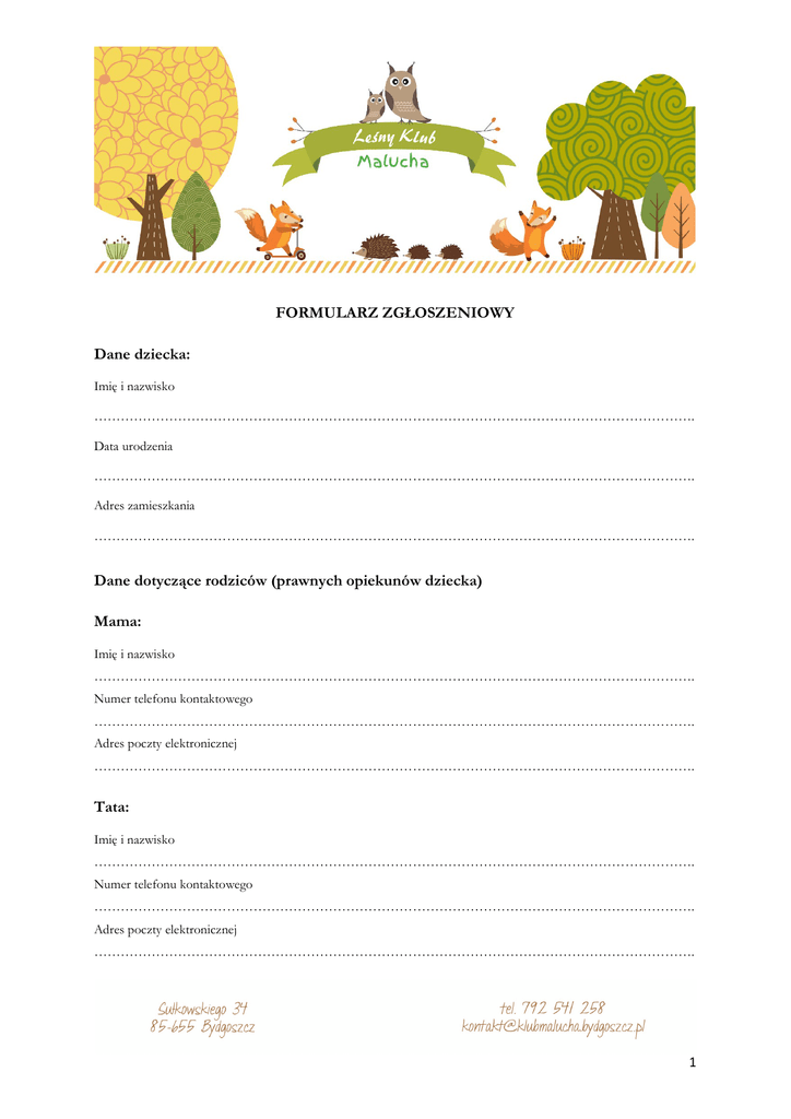 FORMULARZ ZGŁOSZENIOWY Dane dziecka: Imię i nazwisko ………………………………………………………………………………………………………………………. Data urodzenia ………………………………………………………………………………………………………………………. Adres zamieszkania ………………………………………………………………………………………………………………………. Dane dotyczące rodziców (prawnych opiekunów dziecka) Mama: Imię i nazwisko ………………………………………………………………………………………………………………………. Numer telefonu kontaktowego ………………………………………………………………………………………………………………………. Adres poczty elektronicznej ………………………………………………………………………………………………………………………. Tata: Imię i nazwisko ………………………………………………………………………………………………………………………. Numer telefonu kontaktowego ………………………………………………………………………………………………………………………. Adres poczty elektronicznej ………………………………………………………………………………………………………………………. 1 Deklaracja odnośnie wymiaru godzin opieki (zaznaczyć odpowiednie; przy wyborze proszę o uwzględnienie planu dnia - załącznik) [ [ [ [ [ ] jedno spotkanie w tygodniu (od 9.00-12.00) ] dwa spotkania w tygodniu (od 9.00-12.00) ] trzy spotkania w tygodniu (od 9.00-12.00) ] codzienna opieka dopołudniowa (max do 13.00) ] całodzienna opieka Inne:………………………………………………………………………………………… Deklaracja odnośnie wyżywienia dziecka (zaznaczyć odpowiednie) [ ] Deklaruję dostarczanie własnych posiłków mojemu dziecku [ ] Deklaruję korzystanie z usług firmy cateringowej [ ] śniadanie [ ] II śniadanie [ ] dwudaniowy obiad [ ] podwieczorek „Oświadczam, że wyrażam zgodę na przetwarzanie wyżej podanych danych osobowych wyłącznie w związku z rekrutacją.” …………………………………… (podpis rodzica, prawnego opiekuna dziecka) 3 Załącznik nr 1. Cennik Pakiety jednodniowe (w zależności od dostępności miejsc w danym dniu): 1h - 12 zł 4h - 35 zł cały dzień - 50 zł (bez graniczeń) Pakiety miesięczne (+jednorazowe wpisowe 200 zł – gwarancja miejsca w klubie malucha) 4h/dziennie - 500 zł opieka całodniowa - 650 1 1 od śniadanka do obiadku (bez poobiedniej drzemki) - od ok 8.30 -12.30 2 Karnety do wykorzystania w miesiącu kalendarzowym w godzinach prowadzenia zajęć ogólnorozwojowych (9.00-12.00) (+jednorazowe wpisowe 200 zł – gwarancja miejsca w klubie malucha tylko w przypadku deklaracji konkretnych dni tygodnia): 2 1 spotkanie tygodniowo/miesiąc - 130 zł 2 spotkania tygodniowo/miesiąc - 240 zł 3 spotkania tygodniowo/miesiąc - 330 zł podczas tego czasu, dzieci będą miały okazję uczestniczyć w zajęciach ogólnorozwojowych z wykorzystaniem elementów szeregu metod wczesnego wspomagania rozwoju. 2 Koszt opieki obejmujący inne ramy czasowe ustalany indywidualnie. Posiłki dostarczane przez firmę cateringową płatne osobno (oferta wyżywienia całodziennego, bądź jednego posiłku w formie obiadku już wkrótce) Orientacyjny plan dnia 8.30-9.00 - Śniadanko 9.00-10.30 - Zajęcia ogólnorozwojowe wykorzystujące elementy metod wczesnego wspomagania rozwoju, zabawy wg preferencji podopiecznych 10.30-10.45 - II śniadanie/przekąska 11.00-12.00 - Zajęcia ogólnorozwojowe wykorzystujące elementy metod wczesnego wspomagania rozwoju, zabawy wg preferencji podopiecznych 12.30-13.00 - Obiad 13.15-15.00 - Odpoczynek dzieci, zabawy wyciszające, relaks, drzemka 15.00 – Podwieczorek 15.15 – Zabawy dowolne 3