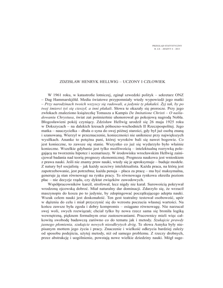 PRZEGLĄD STATYSTYCZNY R. LX – ZESZYT 4 – 2013 ZDZISàAW HENRYK HELLWIG – UCZONY I CZàOWIEK W 1961 roku, w katastro¿e lotniczej, zginąá szwedzki polityk – sekretarz ONZ – Dag Hammarskjöld. Media Ğwiatowe przypomniaáy wtedy wypowiedĨ jego matki – Przy narodzinach twoich wszyscy siĊ radowali, a jedynie ty páakaáeĞ. ĩyj tak, by po twej Ğmierci tyĞ siĊ cieszyá, a inni páakali. Sáowa te okazaáy siĊ prorocze. Przy jego zwáokach znaleziono ksiąĪeczkĊ Tomasza a Kampis De Imitatione Christi – O naĞladowaniu Chrystusa, Ğwiat zaĞ poĞmiertnie uhonorowaá go pokojową nagrodą Nobla. Báogosáawieni pokój czyniący. Zdzisáaw Hellwig urodziá siĊ 26 maja 1925 roku w Dokszycach – na dalekich kresach póánocno-wschodnich II Rzeczpospolitej. Jego matka – nauczycielka – dbaáa o syna do swej póĨnej staroĞci, gdy byá juĪ osobą znaną i szanowaną. Wierzyá w przeznaczenie, koniecznoĞci nie unikniesz przy najwiĊkszych wysiákach. Ananke to potĊĪna pani, której wyroków bali siĊ nawet bogowie. Co jest konieczne, to zawsze siĊ stanie. Wszystko co juĪ siĊ wydarzyáo byáo wáaĞnie konieczne. Wszelkie gdybanie jest tylko moĪliwoĞcią – intelektualną rozrywką polegającą na tworzeniu hipotez i scenariuszy. W Ğrodowisku wrocáawskim Hellwig zainicjowaá badania nad teorią prognozy ekonomicznej. Prognoza naukowa jest wnioskiem z prawa nauki. JeĞli nie znamy praw nauki, wtedy siĊ je aproksymuje – buduje modele. Z natury byá socjalistą – jak kaĪdy uczciwy intelektualista. KaĪda praca, na którą jest zapotrzebowanie, jest potrzebna; kaĪda pensja – páaca za pracĊ – ma byü maksymalna, generuje ją stan równowagi na rynku pracy. To równowaga rynkowa okreĞla poziom páac – nie decyzje rządu, czy dyktat związków zawodowych. Wspóápracowników karciá, strofowaá, lecz nigdy nie karaá. SurowoĞcią pokrywaá wrodzoną ojcowską dobroü. Miaá naturalny dar dominacji. Zdarzyáo siĊ, Īe wrzuciá maszynopis do kosza po to jedynie, by zdopingowaü początkującego adepta nauki. Wszak celem nauki jest doskonaáoĞü. Ten gest teatralny testowaá osobowoĞü, upór w dąĪeniu do celu i miaá przyczyniü siĊ do wzrostu poczucia wáasnej wartoĞci. Na koĔcu zawsze byáa zgoda i dobry kompromis – osiągano równowagĊ. Nie narzucaá swej woli, swych rozwiązaĔ; chciaá tylko by nowa rzecz sama siĊ broniáa logiką wewnĊtrzną, piĊknem formalnym oraz zastosowaniami. Pracownicy mieli wiĊc caákowitą swobodĊ badawczą zarówno co do tematu jak i metody. Szukajcie prawdy jasnego páomienia, szukajcie nowych nieodkrytych dróg. Te sáowa Asnyka byáy niepisanym mottem jego Īycia i pracy. Znaczenie i wielkoĞü odkrycia bardziej zaleĪy od sposobu podejĞcia, uĪytej metody, niĪ od samego problemu. Z rzeczy drobnych, przez abstrakcjĊ i uogólnienie, powstają nowe wielkie dziedziny nauki. Mógá suge- 548 Antoni Smoluk rowaü zadanie – czyniá to rzadko, ale nigdy nie narzucaá sposobu jego rozwiązania. WáaĞciwoĞü tĊ naleĪy uznaü za cechĊ charakterystyczną szkoáy naukowej Hellwiga. Troszczyá siĊ jednako o rozwój naukowy i byt materialny swych máodszych kolegów. W 1984 roku w Marburgu odbywaá siĊ wielki kongres MiĊdzynarodowego Instytutu Statystycznego. Z polecenia Hellwiga zaproszono kilka osób z Polski. W czasie konferencji pogoda siĊ zaáamaáa, byá to początek wrzeĞnia, zrobiáo siĊ zimno. KtóryĞ z máodych kolegów, lekko ubrany, zwyczajnie byá zziĊbniĊty. Hellwig wyjąá z walizki ciepáą baweánianą podkoszulkĊ i przymusiá go do jej wáoĪenia. Takie zachowania, w róĪnych odmianach, najlepiej charakteryzują jego stosunek do ludzi i wspóápracowników. Lubiá Īycie towarzyskie i nocne Polaków rozmowy. PóĨną porą, gdy ciaáa wiĊdáy ze zmĊczenia, zawsze miaá zapas nadzwyczajny: paczkĊ czekoladek, Īóáty ser lub nawet zwykáy chleb. Wzmacniaá wątáe ciaáa, by oĪywiü ducha. Cebion – to jego ulubione sáowo – odĞwieĪa mózg, stymuluje, przynosi nowe i niezwykáe myĞli oraz skojarzenia. Dla odprĊĪenia, w wolnych chwilach malowaá obrazy i pisaá dydaktyczne powiastki – apoftegmaty, które moĪna uwaĪaü za wykáad ¿lozo¿i w przypowieĞciach. Nic co ludzkie nie byáo mu obce. Graá dobrze w brydĪa, lubiá alkohole, jednak stroniá od luksusu i pokazowych wydatków. Bawiá siĊ nawet w objaĞnianie kart – dziewczyny to uwielbiaáy. CzynnoĞü tĊ pewnie traktowaá jako irracjonalne uzupeánienie prognozy naukowej. Byá Ptolemeuszem i Cyganką zarazem. Z alchemii powstaáa chemia, chciaá kiedyĞ byü chemikiem, z astrologii – astronomia i teoria prognozy, a takĪe – w czĊĞci przynajmniej – futurologia. Wizje przyszáoĞci mają walny wpáyw na bieĪącą politykĊ, kulturĊ i edukacjĊ. Byá pierwszym kierownikiem katedry matematyki w WyĪszej Szkole Ekonomicznej we Wrocáawiu. Lubiá matematykĊ i ceniá ją jako podstawĊ i syntezĊ caáej nauki. DrąĪyá pojĊcie losowoĞci. Kiedy ciąg zer i jedynek moĪna uznaü za przypadkowy jak báyski promieniowania kosmicznego na ekranie? Kiedy jest to prawidáowoĞü? Jak odróĪniaü zjawiska regularne, systematyczne, od zdarzeĔ przypadkowych? Wielki Henri Poincaré áączyá to z ciągáoĞcią, a Hellwig liczyá czĊstotliwoĞci sáów. JeĪeli dowolne sáowo zer i jedynek pojawia siĊ w ciągu z dodatnią czĊstotliwoĞcią, wtedy taki ciąg ma charakter losowy. OdpowiedĨ na to ¿lozo¿czne pytanie jest waĪna, a nawet bardzo waĪna, z praktycznego punktu widzenia. Daje bowiem teoretyczną podstawĊ do wnioskowania czy ciąg katastrof lotniczych jest zjawiskiem naturalnym, czy teĪ są to planowane sabotaĪe. Czy piĊkna Wenecja tonie w morzu, czy teĪ nie ma podstaw do obaw, bo są to naturalne, przypadkowe wahania poziomu wody. Proponowaá róĪne miary zaleĪnoĞci zdarzeĔ losowych. W wieku juĪ dojrzaáym, okoáo piĊüdziesiątki, nadrabiaá zalegáoĞci muzyczne. Staraá siĊ byw