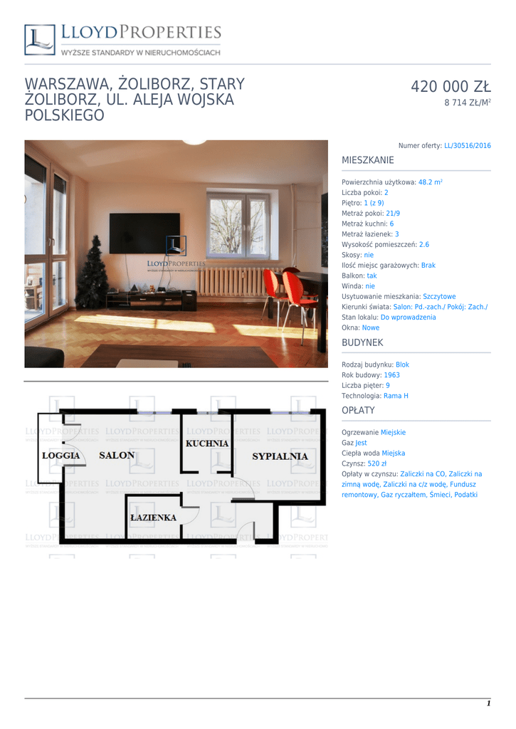 WARSZAWA, ŻOLIBORZ, STARY ŻOLIBORZ, UL. ALEJA WOJSKA POLSKIEGO 420 000 ZŁ 8 714 ZŁ/M2 Numer oferty: LL/30516/2016 MIESZKANIE Powierzchnia użytkowa: 48.2 m2 Liczba pokoi: 2 Piętro: 1 (z 9) Metraż pokoi: 21/9 Metraż kuchni: 6 Metraż łazienek: 3 Wysokość pomieszczeń: 2.6 Skosy: nie Ilość miejsc garażowych: Brak Balkon: tak Winda: nie Usytuowanie mieszkania: Szczytowe Kierunki świata: Salon: Pd.-zach./ Pokój: Zach./ Stan lokalu: Do wprowadzenia Okna: Nowe BUDYNEK Rodzaj budynku: Blok Rok budowy: 1963 Liczba pięter: 9 Technologia: Rama H OPŁATY Ogrzewanie Miejskie Gaz Jest Ciepła woda Miejska Czynsz: 520 zł Opłaty w czynszu: Zaliczki na CO, Zaliczki na zimną wodę, Zaliczki na c/z wodę, Fundusz remontowy, Gaz ryczałtem, Śmieci, Podatki 1 Jakub Bednarek Property Expert +48 533 340 311 [email protected] OPIS Prezentowane mieszkanie tworzą rozmieszczone na powierzchni 48 m2: - salon (21 m2), - sypialnia (11 m2), - łazienka z toaletą (3 m2) - osobna widna kuchnia (6 m2) oraz - przedpokój. Przestronny salon daje duże możliwości aranżacyjne. Duży balkon stwarza okazję do jedzenia posiłków na świeżym powietrzu. Mieszkanie jest ciche i ma widok na zielone tereny z obu pokoi. Część kuchenna jest wyposażona - piekarnik, płyta gazowa, lodówko-zamrażarka. W łazience znajduje się wanna, toaleta oraz umywalka. W przedpokoju znajdują się głębokie szafy wnękowe i pawlacze. Na podłodze w pokojach znajduje się parkiet, natomiast w łazience, przedpokoju i kuchni terakota. Do mieszkania przynależy piwnica (2 m2) dająca dodatkową przestrzeń na przechowywanie różnych rzeczy. W mieszkaniu wymienione zostały wszystkie instalacje: elektryczna, wodno-kanalizacyjna, gazowa oraz grzewcza. Nieruchomość nie wymaga dodatkowych nakładów finansowych. Dzięki dwustronnej ekspozycji okien (południe, zachód) mieszkanie wydaje się większe, jest jasne i dobrze doświetlone. W mieszkaniu zamontowana jest klimatyzacja. Mieszkanie usytuowane jest na 1 piętrze 9-piętrowego bloku z 1963 roku. Budynek po modernizacji - odnowione klatki schodowe, wyposażony w domofon. Bliskość przystanku tramwajowego i autobusowego sprawia, że sprawnie dostaniemy się w każde miejsce Warszawy zarówno za dnia jak i nocą, a do ścisłego centrum dojazd zajmuje 10 minut. Do stacji metra Dworzec Gdański dojazd zajmuje 5 minut. Osiedle położone jest na pograniczu Śródmieścia i Żoliborza, w zielonej i lekko odseparowanej od zgiełku i hałasu części miasta. Otoczenie drzewami na Starym Żoliborzu przy Alei Wojska Polskiego i Placu Inwalidów stwarza możliwość do częstych spacerów i wycieczek rowerowych. W najbliższym sąsiedztwie znajdują się restauracje, winiarnie, kawiarnie, liczne sklepy spożywcze, apteka, poczta, bazarek, duży market, banki, szkoły, przedszkola, żłobki oraz przychodnia lekarska. a także Centrum Handlowe Arkadia. Doskonałe umiejscowienie daje poczucie wielkomiejskości ze względu na bliskość komunikacji miejskiej. 2