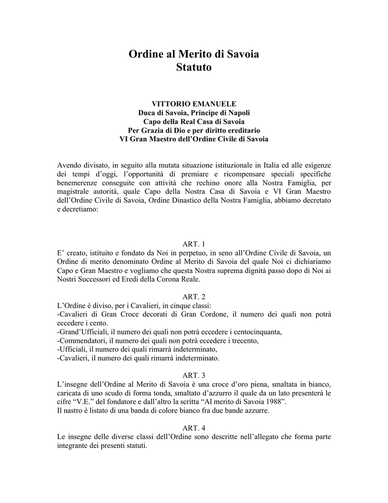Ordine al Merito di Savoia Statuto VITTORIO EMANUELE Duca di Savoia, Principe di Napoli Capo della Real Casa di Savoia Per Grazia di Dio e per diritto ereditario VI Gran Maestro dell’Ordine Civile di Savoia Avendo divisato, in seguito alla mutata situazione istituzionale in Italia ed alle esigenze dei tempi d’oggi, l’opportunità di premiare e ricompensare speciali specifiche benemerenze conseguite con attività che rechino onore alla Nostra Famiglia, per magistrale autorità, quale Capo della Nostra Casa di Savoia e VI Gran Maestro dell’Ordine Civile di Savoia, Ordine Dinastico della Nostra Famiglia, abbiamo decretato e decretiamo: ART. 1 E’ creato, istituito e fondato da Noi in perpetuo, in seno all’Ordine Civile di Savoia, un Ordine di merito denominato Ordine al Merito di Savoia del quale Noi ci dichiariamo Capo e Gran Maestro e vogliamo che questa Nostra suprema dignità passo dopo di Noi ai Nostri Successori ed Eredi della Corona Reale. ART. 2 L’Ordine è diviso, per i Cavalieri, in cinque classi: -Cavalieri di Gran Croce decorati di Gran Cordone, il numero dei quali non potrà eccedere i cento. -Grand’Ufficiali, il numero dei quali non potrà eccedere i centocinquanta, -Commendatori, il numero dei quali non potrà eccedere i trecento, -Ufficiali, il numero dei quali rimarrà indeterminato, -Cavalieri, il numero dei quali rimarrà indeterminato. ART. 3 L’insegne dell’Ordine al Merito di Savoia è una croce d’oro piena, smaltata in bianco, caricata di uno scudo di forma tonda, smaltato d’azzurro il quale da un lato presenterà le cifre “V.E.” del fondatore e dall’altro la scritta “Al merito di Savoia 1988”. Il nastro è listato di una banda di colore bianco fra due bande azzurre. ART. 4 Le insegne delle diverse classi dell’Ordine sono descritte nell’allegato che forma parte integrante dei presenti statuti. ART. 5 L’Ordine al Merito di Savoia sarà da Noi conferito per speciali e specifiche benemerenze verso la Nostra Casa, tanto per Magistrale Motu Proprio quanto su proposta del Consiglio dell’Ordine Civile di Savoia. Coloro che avranno acquisito benemerenze ma che per la natura di dette benemerenze o per la giovane età non potranno aspirare al momento ad essere ammessi nell’Ordine potranno venir decorati della Croce al Merito di Savoia che sarà, a seconda dei casi, in oro o in argento. ART. 6 I nuovi membri dell’Ordine non potranno fregiarsi delle insegne stabilite per il proprio grado prima che la nomina sia stata registrata al Gran Magistero. ART. 7 Il Presidente del Consiglio dell’Ordine Civile di Savoia stenderà il decreto di nomina e lo presenterà alla Nostra firma, previo controllo ed esame dei requisiti di lealtà, fedeltà e benemerenza verso la Nostra persona e la Real Casa di Savoia. Le f unzioni di raccolta di notizie e l’istruttoria di accertamento dei requisiti relativi ad ogni proposta di nomina sono demandate ai Delegati nazionali e regionali degli Ordini Dinastici della Nostra Real Casa. ART. 8 Gli insigniti di ogni classe potranno indossare, in occasione di cerimonie religiose dell’Ordine o di altro Ordine Dinastico sabaudo, un manto di panno turchino, aggiustato alla gorgiera con nappe di seta bianca e azzurra e con la croce dell’Ordine ricamata sul lato sinistro, delle seguenti misure: Cavalieri di Gran Croce decorati di Gran Cordone altezza mm. 34. Grand’Ufficiali e Commendatori altezza mm. 31. Ufficiali e Cavalieri altezza mm. 26. ART. 9 Il Gran Maestro si avvale del Consiglio dell’Ordine Civile di Savoia per la gestione dell’Ordine. Detto Consiglio può delegare tutte o parte delle funzioni agli organi dell’Ordine dei Santi Maurizio e Lazzaro. ART. 10 Tutti i Cavalieri dell’Ordine Civile di Savoia possono fregiarsi anche delle insegne di Cavalieri di Gran Croce decorati di Gran Cordone dell’Ordine al Merito di Savoia. ART. 11 Sarà cancellato dai ruoli e verrà privato del diritto di fregiarsi delle insegne e di fare uso dei titoli derivanti chiunque, per un fatto accertato, abbia mancato all’onore o alla lealtà verso l’Ordine, verso i principii che lo reggono e verso Casa Savoia. La revoca è fatta con Decreto Magistrale sentito il parere del Consiglio dell’Ordine Civile di Savoia. Il Consiglio, prima di deliberare, dovrà, per mezzo del suo Presidente, dare avviso all’interessato della proposta di cancellazione e revoca, dei fatti e motivi sui quali si fonda e fissare un termine per presentare le sue osservazioni per iscritto. Non sarà necessaria tale procedura quando il fatto contestato risulti da documenti di incontrovertibile autenticità o sia accertato da sentenza passata in giudicato. ALLEGATO relativo alle insegne dei cavalieri e delle dame Cavaliere di Gran Croce decorato di Gran Cordone: Fascia da portarsi a tracolla dalla spalla destra al fianco sinistro, in seta dei colori dell’Ordine, di 100 mm. Di altezza, chiusa a fiocco e con code, dalla quale pende la croce dell’Ordine di mm. 67 sormontata da una corona reale in oro di 42 mm. Placca: d’argento a otto gruppi di raggi rastremati e diamantati di 85 mm. di diametro con sovrapposta la croce dell’Ordine di 55 mm. Miniatura: riduzione di 13 mm. della placca, pendente da un nastro di seta dei colori dell’Ordine di 12 mm. Rosetta: riduzione della placca al centro di una rosetta in seta dei colori dell’Ordine di 12 mm. Nastrino per uniforme: in seta dei color dell’Ordine di 37 mm. di larghezza con sovrapposte tre corone reali in oro. Grand’Ufficiale: Nastro da collo: in seta dei colori dell’Ordine di 50 mm. di altezza dal quale pende la croce dell’Ordine di 55 mm. sormontata dalla corona reale in oro di 38 mm. Placca: d’argento a quattro gruppi di raggi rastremati e diamantati di 75 mm. di diametro con sovrapposta la croce dell’Ordine di 41 mm. Miniatura: riduzione di 16 mm. della placca pendente da nastro di seta dei colori dell’Ordine di 13 mm. Rosetta: riduzione della placca al centro di una ros