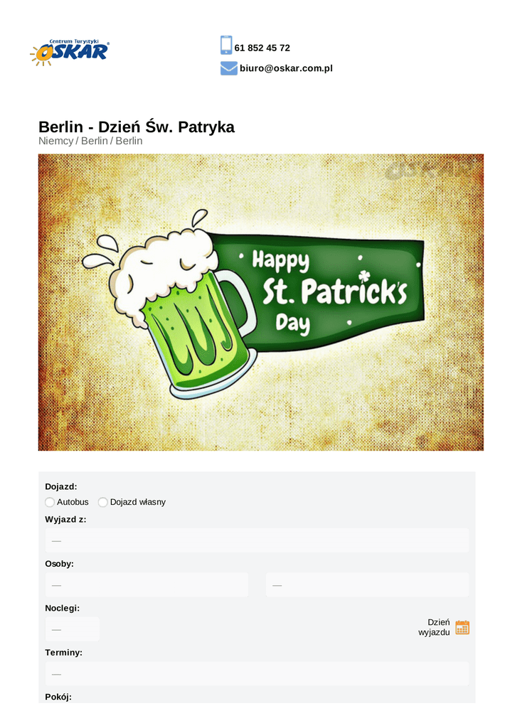 61 852 45 72 [email protected] Berlin - Dzień Św. Patryka Niemcy / Berlin / Berlin Dojazd: Autobus Dojazd własny Wyjazd z: Osoby: Noclegi: Dzień wyjazdu Terminy: Pokój: Wyżywienie: Najtańsza oferta First Minute cena promocyjna cena katalogowa do 5 marca 2017: 58,20 zł do 5 marca 2017: 58,20 zł do 5 marca 2017: 70,20 zł do 5 marca 2017: 135,80 zł do 5 marca 2017: 135,80 zł do 5 marca 2017: 163,80 zł Suma:194,00 Suma: zł 194,00 zł Suma: 234,00 zł Opis oferty Miejscowość Dzień św. Patryka w Berlinie DzieńOpinie Świętego Patryka to irlandzkie święto narodowe, obchodzone na cześć pierwszego chrześcijańskiego misjonarza z Irlandii. Shamrock, czyli trójlistna koniczyna to główny symbol tego święta. Według legendy o św. Patryku, misjonarz wykorzystał ją aby wytłumaczyć pierwszym irlandzkim Rozkład jazdydogmat o Trójcy Świętej. Początkowo Dzień Świętego Patryka był świętem kościelnym, ale chrześcijanom z czasem zaczął być znany na całym świecie. 17 marca to dzień, któremu towarzyszy parada przebranych w tradycyjne irlandzkie stroje oraz tłumy przebranych na zielono świętujących ludzi. W ten dzień wiele irlandzkich pubów w Berlinie organizuje muzykę na żywo oraz pokazy tańców, przy których można spożywać irlandzkie trunki, zwłaszcza „zielone piwo”. Zakwaterowanie Oferta nie obejmuje zakwaterowania. Karta Dużej Rodziny www.oskar.com.pl/zalaczniki/karta_duzej_rodziny DWUpak i TRZYpak DWUpak z rabatem do 25% na osobe TRZYpak z rabatem do 50% na osobe Promocja obowiązuje przy zakupie 2 lub 3 spośród typów ofert: Karnawał w Wenecji, Wyspa Tropikalna, Legoland, Heide Park, Alzacja: Strasburg + Colmar, Festiwal Tulipanów i Amsterdam, Parada Kwiatów, Hamburg + Kraina M iniatur, Kopenhaga + Ogrody Tivoli, Salzburg i Hallstatt, Wodospad Rheinfall i Wyspa M ainau. Rabat naliczany jest od ceny podstawowej i dotyczy najtańszej spośród wybranych ofert. Istnieje możliwość dowolnej kombinacji rezerwacji wyjazdów przy zalożeniu, że dane osobowe uczestników nie ulegają zmianie. Ubezpieczenie Warunki ubezpieczenia Bezpieczne Podróże Signal Iduna dokument do pobrania www.oskar.com.pl/zalaczniki/owu Warunki ubezpieczenia Kosztów Imprezy Turystycznej Signal Iduna dokument do pobrania www.oskar.com.pl/zalaczniki/owurg Turystyczny Fundusz Gwarancyjny W związku z powołaniem do życia w dniu 26.11.2016 Turystycznego Funduszu Gwarancyjnego każdy klient Biura Podróży Oskar zobowiązany jest do zapłaty kwoty w wysokości 10zł/os. przy każdorazowej rezerwacji imprezy turystycznej (obowiązuje od dnia 26.11.2016). Kwota przeznaczona na Turystyczny Fundusz Gwarancyjny zostanie automatycznie doliczona do wartości rezerwacji (w momencie jej dokonania). Wyjątkiem są imprezy turystyczne odbywające się w krajach posiadających granicę z Rzeczpospolitą Polską. Składka nie jest przychodem biura. Udogodnienia Klimatyzacja Regulowane fotele Tacki GPS Zawodowy kierowca Pasy bezpieczeństwa Toaleta w autokarze Podnóżki City breaks Wi-Fi Centrum rozrywek Blisko centrum Życie nocne Bez paszportu Tour guide Program ramowy Dzień 1 (17.03.2017) Wyjazd z poszczególnych miast zgodnie z rozkładem jazdy autokaru. Przyjazd do Berlina. Zwiedzanie rozpoczynamy od wizyty na Placu Poczdamskim - jednym z największych i najruchliwszych placów w centralnym Berlinie z charakterystyczną monolityczną konstrukcją o elewacji ze szkła i stali budynku Sony Center. Autokarem przejedziemy koło Checkpoint Charlie - jednego z najbardziej znanych przejść granicznych w okresie zimnej wojny pomiędzy NRD i Berlinem Zachodnim oraz zobaczymy fragmenty muru berlińskiego i odwiedzimy centralny punkt miasta - Alexanderplatz z charakterystyczną wieżą telewizyjną. Podczas spaceru z pilotem zobaczymy m.in. Kościół Mariacki, Wyspę Muzeów, Katedrę oraz osobliwości ulicy Unter den Linden - pomnik Fryderyka Wielkiego, Staatsoper, Neue Wache, Uniwersytet Humboldta, Bebelplatz, Opernpalais, ambasady Francji oraz Federacji Rosyjskiej, hotel Adlon oraz Bramę Brandenburską. Następnie zobaczymy pomnik ofiar Holocaustu, Reichstag oraz Siegessäule w parku Tiergarten. Po zakończeniu zwiedzania czas wolny na indywidualny udział w zabawach związanych z dniem Św. Partryka oraz zakupy w Primark. Wyjazd w drogrę powrotną ok. godz. 23. Dzień 2 (18.03.2017) Powrót do poszczególnych miast w godzinach nocnych/porannych. Cena obejmuje transport autokarem klasy LUX (klimatyzacja, barek, WC, DVD) ubezpieczenie KL i NNW opiekę pilota Cena nie obejmuje Informacje dodatkowe program ramowy obejmuje zwiedzanie obiektów z zewnątrz; zwiedzanie wewnątrz oraz udział w dodatkowych wydarzeniach w indywidualnym zakresie w trakcie czasu wolnego program wyjazdu jest ramowy i może ulec zmianie dokumenty - paszport lub dowód osobisty zaleca się wyrobienie karty EKUZ Chcesz wiedzieć szybciej? Polub nas na facebooku OSKAR Sp. z o.o. pl.Wolności 2/4c, 61-738 Poznań Potrzebujesz pomocy? Zadzwoń lub napisz: 61 852 45 72 [email protected] Zadzwoń Projekt i wdrożenie: Simply User