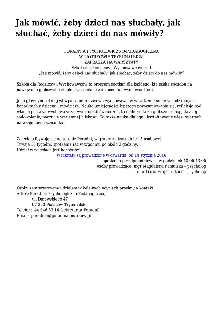 Jak mówić, żeby dzieci nas słuchały, jak słuchać, żeby dzieci do nas mówiły? PORADNIA PSYCHOLOGICZNO-PEDAGOGICZNA W PIOTRKOWIE TRYBUNALSKIM ZAPRASZA NA WARSZTATY Szkoła dla Rodziców i Wychowawców cz. I „Jak mówić, żeby dzieci nas sluchały, jak słuchać, żeby dzieci do nas mówiły” Szkoła dla Rodziców i Wychowawców to program spotkań dla każdego, kto szuka sposobu na nawiązanie głębszych i cieplejszych relacji z dziećmi lub wychowankami. Jego głównym celem jest wpieranie rodziców i wychowawców w radzeniu sobie w codziennych kontaktach z dziećmi i młodzieżą. Nauka umiejętności lepszego porozumiewania się, refleksja nad własną postawą wychowawczą, wymiana doświadczeń, to małe kroki ku głębszej relacji, dającej zadowolenie, poczucie wzajemnej bliskości. To także nauka dialogu i kształtowanie więzi opartych na wzajemnym szacunku. Zajęcia odbywają się na terenie Poradni, w grupie maksymalnie 15 osobowej. Trwają 10 tygodni, spotkania raz w tygodniu po około 3 godziny. Udział w zajęciach jest bezpłatny! Warsztaty są prowadzone w czwartki, od 14 stycznia 2016 spotkania przedpołudniowe – w godzinach 10:00-13:00 osoby prowadzące: mgr Magdalena Famulska – psycholog mgr Daria Fraj-Grudzień - psycholog Osoby zainteresowane udziałem w kolejnych edycjach prosimy o kontakt: Adres: Poradnia Psychologiczno-Pedagogiczna, ul. Dmowskiego 47 97-300 Piotrków Trybunalski Telefon: 44 646 53 16 (sekretariat Poradni) Email: [email protected]