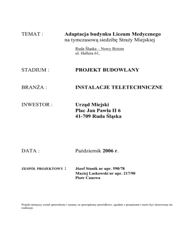 TEMAT : Adaptacja budynku Liceum Medycznego na tymczasową siedzibę StraŜy Miejskiej Ruda Śląska – Nowy Bytom ul. Hallera 61, STADIUM : PROJEKT BUDOWLANY BRANśA : INSTALACJE TELETECHNICZNE INWESTOR : Urząd Miejski Plac Jan Pawła II 6 41-709 Ruda Śląska DATA : Październik 2006 r. ZESPÓŁ PROJEKTOWY : Józef Stanik nr upr. 590/78 Maciej Laskowski nr upr. 217/90 Piotr Canewa Projekt niniejszy został sprawdzony i uznany za sporządzony prawidłowo, zgodnie z przepisami i moŜe być skierowany do realizacji. 1. WSTĘP 1.1 Przedmiot projektu. Przedmiotem niniejszego projektu jest adaptacja budynku byłego Liceum Medycznego na potrzeby tymczasowej siedziby StraŜy Miejskiej. 1.2 Podstawa opracowania. - Zlecenie inwestora. - Dane zebrane przez projektanta w terenie. - Dokonane uzgodnienia. 1.3 Inwestor. Zleceniodawcą i inwestorem jest Urząd Miejski w Rudzie Śląskiej Plac Jana Pawła II 6, 41-709 Ruda Śląska . 1.4 Biuro projektów. Dokumentację techniczną opracowuje „ARCHICO” s.c. z siedzibą w Gliwicach przy ul. Sowińskiego 5 pod nadzorem Macieja Laskowskiego (upr. bud. -projektowe 217/90 ). 1.5 Zakres rzeczowy. - budowa instalacji okablowania strukturalnego, instalacji monitoringu budynku, przebudowy rozdzielni głównej, budowy instalacji telefonicznej, telewizyjnej, instalacji elektrycznej zasilania dedykowanego. 2 2. Charakterystyka techniczna inwestycji. 1. DANE PODSTAWOWE 1.1. Przedmiot opracowania Przedmiotem opracowania jest projekt wykonawczy dotyczący budowy okablowania strukturalnego oraz wydzielonej instalacji elektrycznej dla potrzeb stanowisk komputerowych, wraz z budową instalacji teletechnicznej, sygnalizacji włamania, monitoringu zewnętrznego, łączności radiowej w budynku byłego Liceum Medycznego przystosowywanym na potrzeby tymczasowej siedziby StraŜy Miejskiej w Rudzie Śląskiej przy ul. Hallera 61. 1.2. Podstawa opracowania · Zlecenie Inwestora · Uzgodnienia z Inwestorem · Uzgodnienia z przyszłym uŜytkownikiem · Ustawa z dnia 7.VII.1994r. Prawo budowlane (Dz.U. z 2005r., Nr 163, poz. 1364) · Polskie Normy 1.3. Zakres opracowania Projekt niniejszy obejmuje: · Budowę okablowania strukturalnego · Budowę wydzielonej instalacji elektrycznej · Budowę GPD · Budowę sieci telefonicznej · Budowę instalacji alarmowej, · Budowę instalacji do monitoringu, · Budowę instalacji telewizji kablowej 2. OPIS TECHNICZNY 2.1. Charakterystyka obiektu Budynek dydaktyczny naleŜący do Miasta Ruda Śląska mieści się przy ul. Gen. Hallera 61 w Rudzie Śląskiej. 2.2. Stan istniejacy W chwili obecnej w budynku są nieliczne odcinki okablowania strukturalnego bez wydzielonej instalacji elektrycznej. W budynku na parterze zlokalizowany jest istniejący bezpośredni układ pomiaru energii elektrycznej oraz zabezpieczenia wszystkich obwodów odbiorczych znajdujących się w budynku. Istniejący układ sieciowy: TN-C. Aktualnie do budynku doprowadzona jest do pomieszczenia sekretariatu linia telefoniczna, brak jest w budynku instalacji umoŜliwiającej łączność radiową, monitoring wizyjny oraz telewizję kablową. 2.3. Stan projektowany 2.3.1 Łączność z budynkiem Urzędu Miasta W celu zapewnienia łączności i umoŜliwienia korzystania z danych umieszczonych na serwerach wewnętrznych Urzędu Miasta naleŜy pomiędzy budynkami ułoŜyć kabel światłowodowy jednodomowy co najmniej 6J. Zalecane jest ułoŜenie kabla 12 J, który umoŜliwi dostarczenia w jednym medium łączności komputerowej oraz telefonicznej. Kabel naleŜy ułoŜyć w kanalizacji teletechnicznej dzierŜawionej od podmiotu świadczącego usługi dzierŜawy, a w dalszym etapie naleŜy 3 wybudować własną kanalizację pomiędzy adresami Plac Jana Pawła II 6 – Gen. Hallera 61 2.3.2. Łączność radiowa W celu zapewnienia łączności radiowej konieczne jest wybudowanie masztu do umieszczenia na nim anteny nadawczo odbiorczej. Ze względu na wysoki koszt budowy masztu inwestycja zostanie przesunięta w czasie do momentu rozpoczęcia prac przy budowie Centrum Ratownictwa. Z tego względu badania propagacyjne oraz modyfikacja posiadanego pozwolenia radiowego w chwili obecnej są zbyteczne. 2.3.3 Sygnalizacja włamania W pomieszczeniach magazynu broni oraz serwerownii naleŜy załoŜyć system sygnalizacji włamania. Pomieszczenia proponuje się chronić poprzez zastosowanie czujników podczerwieni oraz czujek inercyjnych z kontaktronami zamontowanymi na drzwiach i dodatkowo w pomieszczeniu serwerownii na oknie. Główny punkt powiadomienia o włamaniu ma się znajdować na dyŜurce. Instalacja prowadzona będzie w ciągach zbiorczych kabli teletechnicznych. Do budowy zastosować kable typu YTKSY 3x2x0,5 do magistrali cyfrowej , YTKSY 1x4x05 oraz YTKSY 5x2x0,5 2.3.4 Monitoring zewnętrzny budynku Dla potrzeb ochrony obiektu projektuje się instalację telewizji uŜytkowej (CCTV). Projektuje się instalację 4 kamer zewnętrznych współpracujących z rejestratorem poklatkowym 4 kanałowym wyposaŜonym w duŜy dysk twardy umoŜliwiający rejestrację ciągłą przez co najmniej 5 dni, oraz monitorami dla podglądu (obraz multipleksowany oraz szczegółowy). Projektuje się instalację kamer zewnętrznych kolorowych z funkcją dzień/noc 2.3.5 Instalacja telewizji kablowej Projektuje się wykonanie instalacji abonenckiej telewizji kablowej na bazie sieci telewizji zewnętrznej. W niniejszym opracowaniu zaprojektowano gniada abonenckie, okablowanie abonenckie kablem RG 6 oraz kabel dystrybucyjny RG 11. Instalacja wykonana będzie w topologii gwiazdy i sprowadzona do pomieszczenia serwerownii do którego teŜ w przyszłości doprowadzony zostanie sygnał operatora zewnętrznego. WyposaŜenie instalacji w urządzenia magistralne i zasilające wykona operator TVK w obiekcie. 2.3.6. Budowa wewnętrznej linii zasilającej tablice komputerowa TK W związku z budową okablowania strukturalnego dla potrzeb stanowisk komputerowych projektuje się nową wewnętrzna linię zasilając