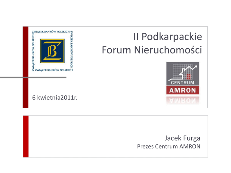 II Podkarpackie Forum Nieruchomości 6 kwietnia2011r. Jacek Furga Prezes Centrum AMRON Agenda 1. Podsumowanie roku 2010 - analiza rynku kredytów hipotecznych 2. Rekomedacje Mieszkaniowe Związku Banków Polskich 3. Funkcjonalnośd Systemu AMRON 4. Podkarpacki Rynek Nieruchomości wg Centrum AMRON 5. AMRON – oferta dla jednostek samorządu terytorialnego II Podkarpackie Forum Nieruchomości 2 Analiza rynku kredytów hipotecznych Rozwój rynku kredytów hipotecznych – nowe umowy i portfel kredytów w tys. sztuk 1600 1425 1400 1449 1303 1130 1200 945 1000 715 800 521 600 405 400 200 290 112 141 162 218 302 311 290 189 230 0 2002 2003 2004 II Podkarpackie Forum Nieruchomości 2005 2006 2007 2008 2009 2010 3 Analiza rynku kredytów hipotecznych Rozwój rynku kredytów hipotecznych – nowe umowy i portfel kredytów w mld PLN 300 264 250 215 193 200 150 117 100 50 76 49,2 42 34,8 28,8 24,2 19,5 15,2 11,3 7,4 54 64 39 48,7 0 2002 2003 2004 II Podkarpackie Forum Nieruchomości 2005 2006 2007 2008 2009 2010 4 Analiza rynku kredytów hipotecznych Rozwój rynku kredytów hipotecznych – średnia wartośd kredytu mieszkaniowego 250 000 205 180 200 000 205 954 202 448 178 200 149 000 150 000 123 000 100 000 87 000 96 000 2002 2003 106 000 50 000 0 2004 II Podkarpackie Forum Nieruchomości 2005 2006 2007 2008 2009 2010 5 Analiza rynku kredytów hipotecznych Wyprzedzające reakcje banków wobec Rekomendacji S - zmiana struktury walutowej nowych kredytów hipotecznych 80% 70% 60% 50% 40% 30% 20% 10% 0% 2008 II Podkarpackie Forum Nieruchomości 2009 2010 6 Specyfika nieruchomości mieszkaniowych powszechnośd zaspokojenia potrzeb mieszkaniowych z jednej strony a wysoka kapitałochłonnośd dobra, jakim jest mieszkanie z drugiej powoduje problemy na etapie zaspokojenia tej potrzeby dwoistośd funkcji jakie pełni mieszkanie: funkcja społeczna - mieszkanie jako podstawowy element zaspokajający potrzeby człowieka funkcja ekonomiczna jako towar, ale również forma lokaty kapitału czy cel inwestycyjny wypadkową funkcji, jaką pełni mieszkanie i jego wysokiej kapitałochłonności jest koniecznośd interwencji paostwa w proces zaspokajania potrzeb mieszkaniowych obywateli Nie można prognozowad poprawy sytuacji mieszkaniowej wyłącznie w oparciu o rozwiązania rynkowe II Podkarpackie Forum Nieruchomości 7 Finansowanie budownictwa mieszkaniowego = przeciwdziałanie spowolnieniu gospodarczemu jednym z istotnych, pozytywnie zweryfikowanych w praktyce wielu krajów sposobów na wychodzenie z okresów dekoniunktury gospodarczej jest rozwój budownictwa mieszkaniowego, przysłowiowe już koło zamachowe gospodarki Związek Banków Polskich (Komitet ds. Finansowania Nieruchomości) aktywnie uczestniczy w poszukiwaniu skutecznych form kreowanie rozwoju gospodarczego poprzez budowę stabilnego i płynnego systemu finansowania budownictwa mieszkaniowego program mieszkaniowy powinien opierad się na zaangażowaniu w jego realizację gospodarstw domowych poprzez kumulowanie prywatnych oszczędności i stymulowanie przez Paostwo skłonności do długoterminowego oszczędzania na cele emerytalne, zdrowotne, edukacyjne i mieszkaniowe II Podkarpackie Forum Nieruchomości 8 Rekomendacje Mieszkaniowe ZBP 15 stycznia 2010 - „Rekomendacje dotyczące działao niezbędnych dla poprawy sytuacji w obszarze budownictwa mieszkaniowego” przyjęte przez Zarząd Związku Banków Polskich: wzmocnienie roli i aktywności paostwa we wspieraniu stabilnego rozwoju budownictwa mieszkaniowego zapewnienie długoterminowego refinansowania dla kredytów hipotecznych odbudowa wzajemnego zaufania uczestników ryku obrotu nieruchomościami dla bezpieczeostwa obrotu nieruchomościami i jego finansowania 19 lutego 2010 - Rezolucja Sejmu RP zobowiązująca rząd do przedłożenia w terminie do 30 czerwca Programu Rozwoju Budownictwa Mieszkaniowego na lata 2010-2020 II Podkarpackie Forum Nieruchomości 9 Rekomendacje Mieszkaniowe ZBP WYZWANIE 1: płynnośd sektora i dostęp do długoterminowego finansowania działania na rzecz przepisów umożliwiających polskim bankom emitowanie listów zastawnych działania na rzecz wprowadzenia przepisów (w tym podatkowych) ułatwiających przeprowadzanie sekurytyzacji aktywów bankowych w sytuacji regularnej rozwiązaniem stabilizującym rynek finansowania budownictwa mieszkaniowego, gwarantującym długoterminowe refinansowanie powinien byd system oszczędnościowo-kredytowy kas budowlanych II Podkarpackie Forum Nieruchomości 10 Rekomendacje Mieszkaniowe ZBP WYZWANIE 2: aktywniejsze paostwo prowadzenie polityki mieszkaniowej sprzyjającej zaspokajaniu potrzeb mieszkaniowych obywateli jest obowiązkiem konstytucyjnym (art. 75. ust. 1. Konstytucji RP) polityka mieszkaniowa to podejście interdyscyplinarne dla resortu infrastruktury, gospodarki, rolnictwa, polityki regionalnej i polityki społecznej i co najważniejsze również dla resortu finansów polityka mieszkaniowa nie może byd limitowana roczną perspektywą zamknięcia budżetu paostwa – to wieloletnie działanie również w wymiarze budżetu zadaniowego paostwa II Podkarpackie Forum Nieruchomości 11 Rekomendacje Mieszkaniowe ZBP WYZWANIE 3: bezpieczeostwo uczestników obrotu nieruchomościami Stworzenie rozwiązao prawnych gwarantujących ochronę nabywców i lokatorów, uwzględniających takie instrumenty jak: rachunek powierniczy w transakcjach deweloperskich fundusz gwarancyjny (także z udziałem środków budżetowych) dla zabezpieczenia spłaty kredytów hipotecznych restrukturyzacja projektów mieszkaniowych inwestorów budowlanych (deweloperów) w przypadku niemożności z ich strony wywiązania się z umów z klientami oczekującymi na mieszkanie przepisy o ochronie lokatorów, warunkowane aspektem socjalnym, ale też uwzględniające prawa właścicieli i wymogi wobec jednostek samorządu terytorialnego w zakresie budownictwa socjalnego II Podkarpackie Forum Nieruchomości 12 Rekomendacje Mieszkaniowe ZBP WYZWANIE 4: odbudo