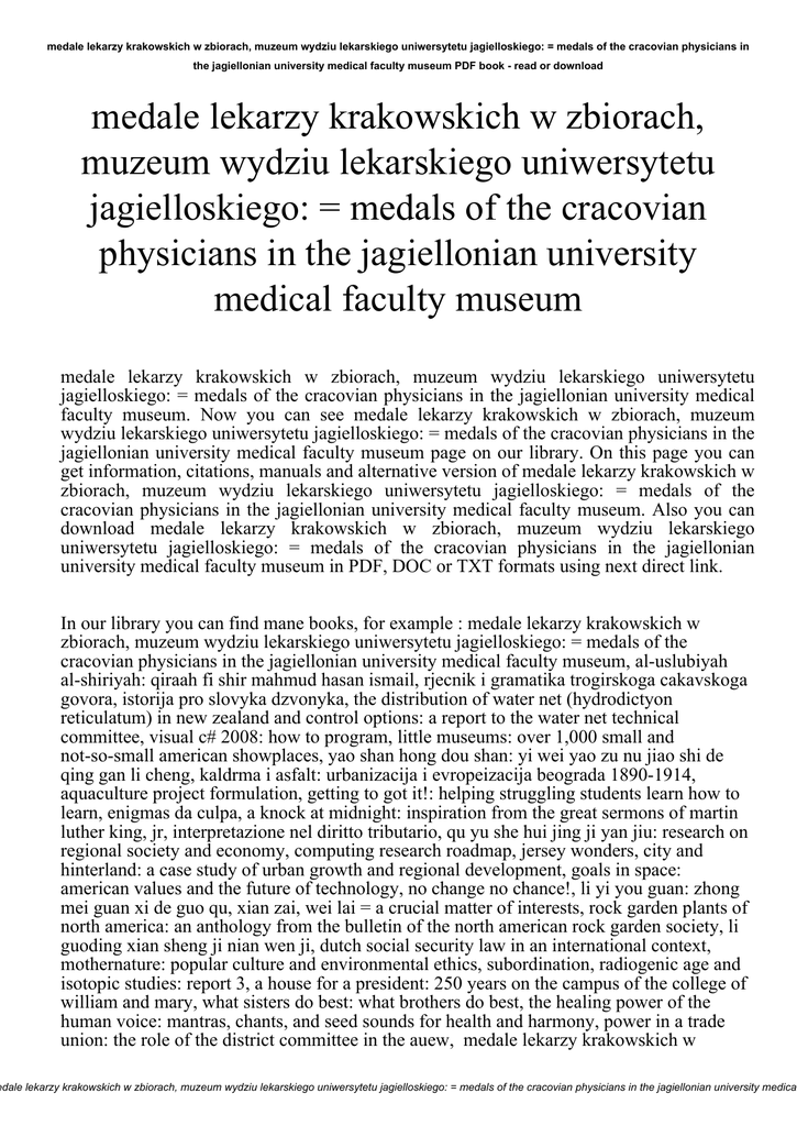 medale lekarzy krakowskich w zbiorach, muzeum wydziu lekarskiego uniwersytetu jagielloskiego: = medals of the cracovian physicians in the jagiellonian university medical faculty museum PDF book - read or download medale lekarzy krakowskich w zbiorach, muzeum wydziu lekarskiego uniwersytetu jagielloskiego: = medals of the cracovian physicians in the jagiellonian university medical faculty museum medale lekarzy krakowskich w zbiorach, muzeum wydziu lekarskiego uniwersytetu jagielloskiego: = medals of the cracovian physicians in the jagiellonian university medical faculty museum. Now you can see medale lekarzy krakowskich w zbiorach, muzeum wydziu lekarskiego uniwersytetu jagielloskiego: = medals of the cracovian physicians in the jagiellonian university medical faculty museum page on our library. On this page you can get information, citations, manuals and alternative version of medale lekarzy krakowskich w zbiorach, muzeum wydziu lekarskiego uniwersytetu jagielloskiego: = medals of the cracovian physicians in the jagiellonian university medical faculty museum. Also you can download medale lekarzy krakowskich w zbiorach, muzeum wydziu lekarskiego uniwersytetu jagielloskiego: = medals of the cracovian physicians in the jagiellonian university medical faculty museum in PDF, DOC or TXT formats using next direct link. In our library you can find mane books, for example : medale lekarzy krakowskich w zbiorach, muzeum wydziu lekarskiego uniwersytetu jagielloskiego: = medals of the cracovian physicians in the jagiellonian university medical faculty museum, al-uslubiyah al-shiriyah: qiraah fi shir mahmud hasan ismail, rjecnik i gramatika trogirskoga cakavskoga govora, istorija pro slovyka dzvonyka, the distribution of water net (hydrodictyon reticulatum) in new zealand and control options: a report to the water net technical committee, visual c# 2008: how to program, little museums: over 1,000 small and not-so-small american showplaces, yao shan hong dou shan: yi wei yao zu nu jiao shi de qing gan li cheng, kaldrma i asfalt: urbanizacija i evropeizacija beograda 1890-1914, aquaculture project formulation, getting to got it!: helping struggling students learn how to learn, enigmas da culpa, a knock at midnight: inspiration from the great sermons of martin luther king, jr, interpretazione nel diritto tributario, qu yu she hui jing ji yan jiu: research on regional society and economy, computing research roadmap, jersey wonders, city and hinterland: a case study of urban growth and regional development, goals in space: american values and the future of technology, no change no chance!, li yi you guan: zhong mei guan xi de guo qu, xian zai, wei lai = a crucial matter of interests, rock garden plants of north america: an anthology from the bulletin of the north american rock garden society, li guoding xian sheng ji nian wen ji, dutch social security law in an international context, mothernature: popular culture and environmental ethics, subordination, radiogenic age and isotopic studies: report 3, a house for a president: 250 years on the campus of the college of william and mary, what sisters do best: what brothers do best, the healing power of the human voice: mantras, chants, and seed sounds for health and harmony, power in a trade union: the role of the district committee in the auew, medale lekarzy krakowskich w edale lekarzy krakowskich w zbiorach, muzeum wydziu lekarskiego uniwersytetu jagielloskiego: = medals of the cracovian physicians in the jagiellonian university medica medale lekarzy krakowskich w zbiorach, muzeum wydziu lekarskiego uniwersytetu jagielloskiego: = medals of the cracovian physicians in the jagiellonian university medical faculty museum PDF book - read or download zbiorach, muzeum wydziu lekarskiego uniwersytetu jagielloskiego: = medals of the cracovian physicians in the jagiellonian university medical faculty museum, all this books you can read on our site or download in PDF - medale lekarzy krakowskich w zbiorach, muzeum wydziu lekarskiego uniwersytetu jagielloskiego: = medals of the cracovian physicians in the jagiellonian university medical faculty museum, DOC - medale lekarzy krakowskich w zbiorach, muzeum wydziu lekarskiego uniwersytetu jagielloskiego: = medals of the cracovian physicians in the jagiellonian university medical faculty museum or TXT - medale lekarzy krakowskich w zbiorach, muzeum wydziu lekarskiego uniwersytetu jagielloskiego: = medals of the cracovian physicians in the jagiellonian university medical faculty museum format online. Our catalogue provide simple ways so that you can find a medale lekarzy krakowskich w zbiorach, muzeum wydziu lekarskiego uniwersytetu jagielloskiego: = medals of the cracovian physicians in the jagiellonian university medical faculty museum PDF file digging. And by having usage of our ebooks online or by stocking it , you have convenient answers with medale lekarzy krakowskich w zbiorach, muzeum wydziu lekarskiego uniwersytetu jagielloskiego: = medals of the cracovian physicians in the jagiellonian university medical faculty museum. finding medale lekarzy krakowskich w zbiorach, muzeum wydziu lekarskiego uniwersytetu jagielloskiego: = medals of the cracovian physicians in the jagiellonian university medical faculty museum, you are to find our website comprehensive medale lekarzy krakowskich w zbiorach, muzeum wydziu lekarskiego uniwersytetu jagielloskiego: = medals of the cracovian physicians in the jagiellonian university medical faculty museum manuals listed. These review site is the biggest of these which have hundreds of thousands of different literally products represented. So as to there are specific sites catered to different product also types or categories, brands or niches related to medale lekarzy krakowskich w zbiorach, muzeum wydziu lekarskiego uniwersytetu jagielloskiego: = medals of the cracovian physicians in the jagiellonian university medical faculty museum. So depending on what exactly you are searching, you 