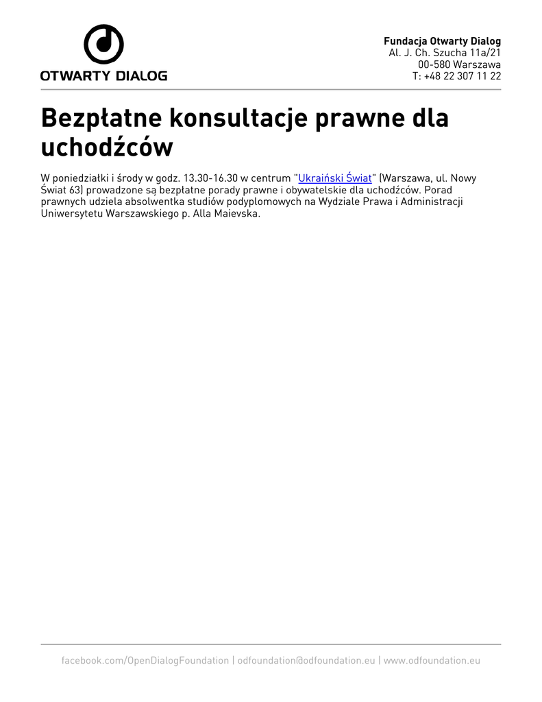 Fundacja Otwarty Dialog Al. J. Ch. Szucha 11a/21 00-580 Warszawa T: +48 22 307 11 22 Bezpłatne konsultacje prawne dla uchodźców W poniedziałki i środy w godz. 13.30-16.30 w centrum "Ukraiński Świat" (Warszawa, ul. Nowy Świat 63) prowadzone są bezpłatne porady prawne i obywatelskie dla uchodźców. Porad prawnych udziela absolwentka studiów podyplomowych na Wydziale Prawa i Administracji Uniwersytetu Warszawskiego p. Alla Maievska. facebook.com/OpenDialogFoundation | [email protected] | www.odfoundation.eu