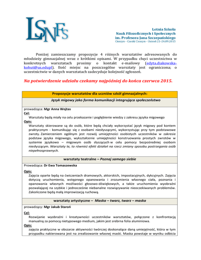 Poniżej zamieszczamy propozycje 4 różnych warsztatów adresowanych do młodzieży gimnazjalnej wraz z krótkimi opisami. W przypadku chęci uczestnictwa w konkretnych warsztatach prosimy o kontakt e-mailowy ([email protected]). Ilość miejsc na poszczególne warsztaty jest ograniczona; o uczestnictwie w danych warsztatach zadecyduje kolejność zgłoszeń. Na potwierdzenie udziału czekamy najpóźniej do końca czerwca 2015. Propozycje warsztatów dla uczniów szkół gimnazjalnych: Język migowy jako forma komunikacji integrująca społeczeństwo prowadząca: Mgr Anna Wojtas Cel: Warsztaty będą miały na celu przekazanie i pogłębienie wiedzy z zakresu języka migowego Opis: Warsztaty skierowane są do osób, które będą chciały wykorzystać język migowy pod kontem praktycznym - komunikując się z osobami niesłyszącymi, wykorzystując przy tym podstawowe zwroty. Zamierzeniem ogólnym jest rozwój umiejętności osobistych uczestników w zakresie podstaw języka migowego, wykształcenie umiejętności konstruowania prostych zwrotów w systemie językowo – migowym osób słyszących w celu pomocy bezpośredniej osobom niesłyszącym. Warsztaty te, to również efekt działań na rzecz zmiany sposobu postrzegania osób niepełnosprawnych. warsztaty teatralne – Poznaj samego siebie Prowadząca: Dr Ewa Tomaszewska Opis: Zajęcia oparte będą na ćwiczeniach dramowych, aktorskich, impostacyjnych, dykcyjnych. Zajęcia dotyczą uruchomienia, wstępnego opanowania i zrozumienia własnego ciała, poznania i opanowania własnych możliwości głosowo-dźwiękowych, a także uruchomienia wyobraźni pozwalającej na szybkie i jednocześnie niebanalne rozwiązywanie nieoczekiwanych problemów. Zakończone będą małą improwizacją ruchową. warsztaty artystyczne – Maska – twarz, twarz – maska prowadzący: Mgr Jakub Staroń Cel: Rozwijanie wyobraźni i kreatywności uczestników warsztatów, połączone z konfrontacją manualną za pomocą nietypowego medium, jakim jest srebrna folia aluminiowa. Opis: zajęcia praktyczne w obszarze aktywności twórczej doskonalące daną umiejętność, która w tym przypadku nakierowana jest na zrealizowanie własnej maski. Maska powstaje w wyniku odbicia własnej lub czyjejś twarzy - portretu, za pomocą nietypowego medium jakim jest srebrna folia aluminiowa. Odbicie powstaje przez dociśnięcie dłonią kawałka folii położonej na własnej twarzy. Następnie odbicie prowadzi nas w przestrzeń klasycznej pracowni graficznej gdzie możemy spotkać matryce graficzne do druku wypukłego, druku wklęsłego, z których to matryc wykonywane są za pomocą pras drukarskich, grafiki - odbicia obrazu. Warsztaty muzyczne – Różne oblicza muzyki symfonicznej prowadząca: dr Anna Trzcionka-Wieczorek Cel: Aktywne doświadczania muzyki symfonicznej Opis: Warsztaty będą oparte na poznaniu i słuchaniu różnych utworów muzyki symfonicznej. Poprzez liczne przykłady zaczerpnięte z różnych obszarów życia współczesnego człowieka, będzie to próba przełamania stereotypu, iż muzyka symfoniczna jest nudna i nieatrakcyjna. Poza tym, zapoznanie uczniów z różnymi utworami muzyki symfonicznej będzie dowodem na to, iż utwory symfoniczne są wszechobecne w życiu młodzieży XXI wieku. Warsztaty polegać będą na aktywnym doświadczaniu/poznawaniu muzyki symfonicznej poprzez stwarzanie okazji do podejmowania różnych form aktywności: ruchowej, plastycznej, literackiej itp. na tle słuchanej muzyki. Uczestnicy warsztatów będą mieli okazję współpracować z rówieśnikami w sposób aktywny i twórczy. Równolegle do warsztatów dla młodzieży również dla przybyłych nauczycieli zrealizowane zostaną warsztaty prowadzone przez pracowników Uniwersytetu Śląskiego. Prosimy o podanie nazwiska opiekuna młodzieży wraz z danymi kontaktowymi: adresem e-mail oraz numerem telefonu. warsztaty dla nauczycieli - Szkoła jako miejsce rozwoju podmiotów edukacji prowadzące: dr Gabriela Piechaczek-Ogierman, dr Aleksandra Minczanowska Cel: - zapoznanie z istotą teorii humanistycznej, - ukazanie cech pozytywnych uczenia się przez doświadczenie (modelu poszukującego) i we współpracy, - uświadomienie roli nauczyciela i ucznia w aktywizującym procesie kształcenia, - wywołanie krytycznej refleksji związanej z organizacją aktywnego procesu nauczania – uczenia się. Przebieg zajęć: 1. 2. 3. 4. 5. Bingo! – zabawa integracyjna. Czuję się jak ……., bo ………. „Cebula” Mapa – edukacja z wyobraźnią. Nauczyciel jako rzemieślnik czy jako ogrodnik - metaforyczne ujęcie dwóch modeli pracy pedagogicznej. 6. Czas na refleksję i podsumowanie. Adresaci: nauczyciele różnych typów szkół Uczestnicy: 1. Imię nazwisko nauczyciela, e-mail, nr telefonu 2.