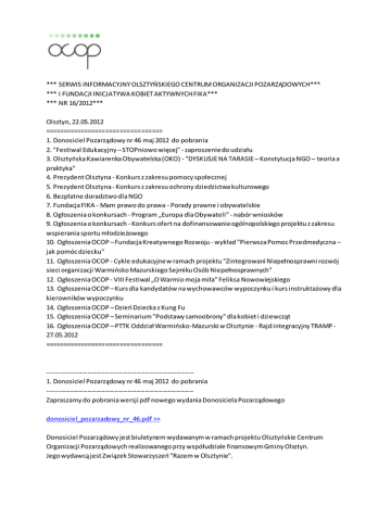 *** SERWIS INFORMACYJNY OLSZTYŃSKIEGO CENTRUM ORGANIZACJI POZARZĄDOWYCH*** *** I FUNDACJI INICJATYWA KOBIET AKTYWNYCH FIKA*** *** NR 16/2012*** Olsztyn, 22.05.2012 ================================= 1. Donosiciel Pozarządowy nr 46 maj 2012 do pobrania 2. "Festiwal Edukacyjny – STOPniowo więcej" - zaproszenie do udziału 3. Olsztyńska Kawiarenka Obywatelska (OKO) - "DYSKUSJE NA TARASIE – Konstytucja NGO – teoria a praktyka" 4. Prezydent Olsztyna - Konkurs z zakresu pomocy społecznej 5. Prezydent Olsztyna - Konkurs z zakresu ochrony dziedzictwa kulturowego 6. Bezpłatne doradztwo dla NGO 7. Fundacja FIKA - Mam prawo do prawa - Porady prawne i obywatelskie 8. Ogłoszenia o konkursach - Program „Europa dla Obywateli” - nabór wniosków 9. Ogłoszenia o konkursach - Konkurs ofert na dofinansowanie ogólnopolskiego projektu z zakresu wspierania sportu młodzieżowego 10. Ogłoszenia OCOP – Fundacja Kreatywnego Rozwoju - wykład "Pierwsza Pomoc Przedmedyczna – jak pomóc dziecku" 11. Ogłoszenia OCOP - Cykle edukacyjne w ramach projektu "Zintegrowani Niepełnosprawni rozwój sieci organizacji Warmińsko Mazurskiego Sejmiku Osób Niepełnosprawnych" 12. Ogłoszenia OCOP - VIII Festiwal „O Warmio moja miła” Feliksa Nowowiejskiego 13. Ogłoszenia OCOP – Kurs dla kandydatów na wychowawców wypoczynku i kurs instruktażowy dla kierowników wypoczynku 14. Ogłoszenia OCOP – Dzień Dziecka z Kung Fu 15. Ogłoszenia OCOP – Seminarium "Podstawy samoobrony" dla kobiet i dziewcząt 16. Ogłoszenia OCOP – PTTK Oddział Warmińsko-Mazurski w Olsztynie - Rajd integracyjny TRAMP 27.05.2012 ================================= -----------------------------------------------------------------1. Donosiciel Pozarządowy nr 46 maj 2012 do pobrania -----------------------------------------------------------------Zapraszamy do pobrania wersji pdf nowego wydania Donosiciela Pozarządowego donosiciel_pozarzadowy_nr_46.pdf >> Donosiciel Pozarządowy jest biuletynem wydawanym w ramach projektu Olsztyńskie Centrum Organizacji Pozarządowych realizowanego przy współudziale finansowym Gminy Olsztyn. Jego wydawcą jest Związek Stowarzyszeń "Razem w Olsztynie". Archiwum DP znajduje się tutaj >> --------------------------------------------------------------------2. "Festiwal Edukacyjny – STOPniowo więcej" - zaproszenie do udziału --------------------------------------------------------------------Olsztyńskie Centrum Organizacji Pozarządowych zaprasza do udziału w szkoleniach organizowanych w ramach "Festiwalu Edukacyjnego – STOPniowo więcej", który został stworzony przez uczestników III ogólnopolskiej edycji Szkoły Trenerskiej dla Bibliotekarzy i Bibliotekarek. Szkolenia odbywać się będą w dniach 18-19 czerwca 2012 r. w siedzibie Olsztyńskiej Wyższej Szkoły Informatyki i Zarządzania im. prof. Tadeusza Kotarbińskiego przy ul. Artyleryjskiej 3f w Olsztynie. Szkolenia poprowadzą bibliotekarze i bibliotekarki z całej Polski, realizujący w swojej codziennej pracy wizję biblioteki jako centrum wiedzy i aktywności lokalnej. Pracując ze społecznością lokalną, są chętni do dzielenia się swoją wiedzą i umiejętnościami. Od września 2011 roku uczestniczą w intensywnym cyklu szkoleń, w ramach którego rozwijają umiejętności tworzenia sytuacji edukacyjnych, metodologii uczenia osób dorosłych, przygotowania i prowadzenia zajęć metodami aktywnymi – czyli jak ciekawie, twórczo, edukacyjnie umożliwiać ludziom uczenie się. Festiwal jest finałem tego cyklu. Zobacz więcej >> --------------------------------------------------------------------3. Olsztyńska Kawiarenka Obywatelska (OKO) - "DYSKUSJE NA TARASIE – Konstytucja NGO – teoria a praktyka" --------------------------------------------------------------------Serdecznie zapraszamy do Olsztyńskiej Kawiarenki Obywatelskiej (OKO) na spotkanie pt. "DYSKUSJE NA TARASIE – Konstytucja NGO – teoria a praktyka", które odbędzie się 29 maja (wtorek) o godz. 17.00 w Olsztyńskim Centrum Organizacji Pozarządowych ul. Tarasa Szewczenki 1. Zobacz więcej >> --------------------------------------------------------------------4. Prezydent Olsztyna - Konkurs z zakresu pomocy społecznej --------------------------------------------------------------------Przedmiotem konkursu jest zlecenie wykonania zadania publicznego wraz z udzieleniem dotacji na dofinansowanie dystrybucji żywności dla najuboższych mieszkańców Olsztyna. Wysokość środków publicznych przeznaczonych na realizację ww. zadania w roku 2012 wynosi 30.000 zł. Termin składania ofert upływa z dniem 5 czerwca 2012 roku (decyduje data stempla pocztowego). Oferty, które wpłyną po terminie nie będą rozpatrywane. Treść ogłoszenia - pobierz plik Źródło: www.ngo.olsztyn.eu/konkursy-ofert/ogoszenia-o-konkursach/608-konkurs-z-zakresu-pomocyspoecznej --------------------------------------------------------------------5. Prezydent Olsztyna - Konkurs z zakresu ochrony dziedzictwa kulturowego --------------------------------------------------------------------Przedmiotem konkursu jest zlecenie wykonania zadań publicznych wraz z udzieleniem dotacji na ich dofinansowanie w zakresie: 1) konserwacja starodruków i zespołów akt archiwalnych ze zbiorów historycznych znajdujących się na terenie Olsztyna – 30.000 zł, 2) popularyzacja i edukacja w zakresie ochrony zabytków, upowszechnianie wiedzy o historii i dziedzictwie kulturowym miasta oraz promocja dziedzictwa kulturowego miasta – 5.000 zł. Zobacz więcej >> --------------------------------------------------------------------6. Bezpłatne doradztwo dla NGO --------------------------------------------------------------------Olsztyńskie Centrum Organizacji Pozarządowych oferuje bezpłatną pomoc przy przygotowaniu ofert konkursowych. Organizacje zainteresowane ofertą OCOP proszone są o kontakt: [email protected], Tel. 512558349 Bezpłatne doradztwo uzyskać można również w 