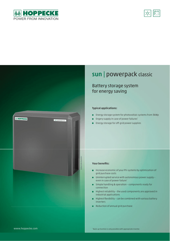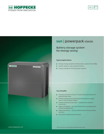 sun | powerpack classic Battery storage system for energy saving Typical applications: Energy storage system for photovoltaic systems from 3kWp Engery supply in case of power failures* Similar to the illustration Energy storage for off-grid power supplies Your benefits: Increase economic of your PV-systems by optimization of grid purchase costs Uninterrupted service with autonomous power supply – even in case of power failure* Simple handling & operation – components ready for connection Highest reliability – the used components are approved in industrial applications Highest flexibility – can be combined with various battery inverters Reduction of annual grid purchase www.hoppecke.com * Back-up function is only possible with appropirate inverter. Type overview sun | powerpack classic Energy content(C10) kWh Nominal voltage V Number of racks, Connection type Length L mm Width B mm Height H mm Weight kg sun | powerpack classic 6.4/48 6,4 48 1 857 355 724 253 sun | powerpack classic 8.0/48 8,0 48 1 829 385 767 295 sun | powerpack classic 11.0/48 11,0 48 1 829 385 899 370 sun | powerpack classic 16.0/48 16,0 48 2 829* 385* 767 590 sun | powerpack classic 22.0/48 22,0 48 2 829* 385* 899 740 Similar to the illustration * in parallel connection of 2 racks the dimensions have to be multiplied by 2. 2500 cycles at a depth of discharge of 50% and a temperature of 20 °C Design life: 10 years (at 20 °C) Optimal environmental compatibility – closed loop for recovery of materials in an accredited recycling system IEC 60896-21 IEC 61427 HOPPECKE Batterien GmbH & Co. KG Bontkirchener Str. 1 · D - 59929 Brilon · Tel.: +49 (0) 2963 61-374 · Fax: +49 (0) 2963 61-270 E-Mail: [email protected] · www.hoppecke.com 05/2015 EN sun | powerpack classic All details in this brochure are based on state-of-the-art technology. Our products are subject to constant development. We therefore reserve the right to make changes. Capacities, dimensions and weights