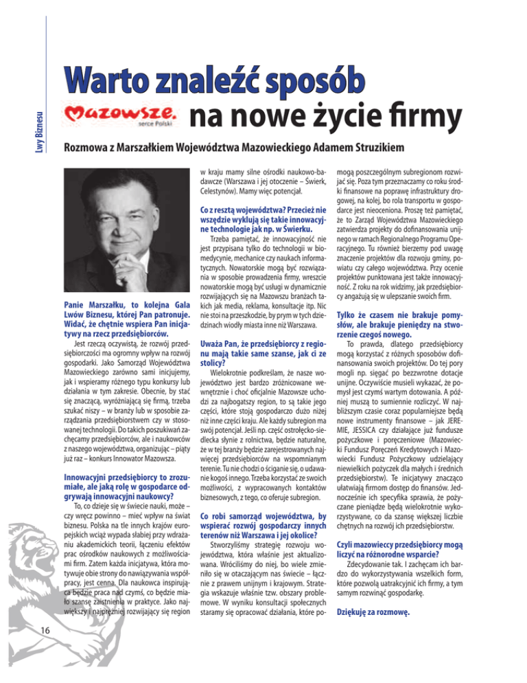 Lwy Biznesu Warto znaleźć sposób na nowe życie firmy Rozmowa z Marszałkiem Województwa Mazowieckiego Adamem Struzikiem w kraju mamy silne ośrodki naukowo-badawcze (Warszawa i jej otoczenie – Świerk, Celestynów). Mamy więc potencjał. Co z resztą województwa? Przecież nie wszędzie wyklują się takie innowacyjne technologie jak np. w Świerku. Panie Marszałku, to kolejna Gala Lwów Biznesu, której Pan patronuje. Widać, że chętnie wspiera Pan inicjatywy na rzecz przedsiębiorców. Jest rzeczą oczywistą, że rozwój przedsiębiorczości ma ogromny wpływ na rozwój gospodarki. Jako Samorząd Województwa Mazowieckiego zarówno sami inicjujemy, jak i wspieramy różnego typu konkursy lub działania w tym zakresie. Obecnie, by stać się znaczącą, wyróżniającą się firmą, trzeba szukać niszy – w branży lub w sposobie zarządzania przedsiębiorstwem czy w stosowanej technologii. Do takich poszukiwań zachęcamy przedsiębiorców, ale i naukowców z naszego województwa, organizując – piąty już raz – konkurs Innowator Mazowsza. Innowacyjni przedsiębiorcy to zrozumiałe, ale jaką rolę w gospodarce odgrywają innowacyjni naukowcy? To, co dzieje się w świecie nauki, może – czy wręcz powinno – mieć wpływ na świat biznesu. Polska na tle innych krajów europejskich wciąż wypada słabiej przy wdrażaniu akademickich teorii, łączeniu efektów prac ośrodków naukowych z możliwościami firm. Zatem każda inicjatywa, która motywuje obie strony do nawiązywania współpracy, jest cenna. Dla naukowca inspirująca będzie praca nad czymś, co będzie miało szansę zaistnienia w praktyce. Jako największy i najprężniej rozwijający się region 16 Trzeba pamiętać, że innowacyjność nie jest przypisana tylko do technologii w biomedycynie, mechanice czy naukach informatycznych. Nowatorskie mogą być rozwiązania w sposobie prowadzenia firmy, wreszcie nowatorskie mogą być usługi w dynamicznie rozwijających się na Mazowszu branżach takich jak media, reklama, konsultacje itp. Nic nie stoi na przeszkodzie, by prym w tych dziedzinach wiodły miasta inne niż Warszawa. Uważa Pan, że przedsiębiorcy z regionu mają takie same szanse, jak ci ze stolicy? Wielokrotnie podkreślam, że nasze województwo jest bardzo zróżnicowane wewnętrznie i choć oficjalnie Mazowsze uchodzi za najbogatszy region, to są takie jego części, które stoją gospodarczo dużo niżej niż inne części kraju. Ale każdy subregion ma swój potencjał. Jeśli np. część ostrołęcko-siedlecka słynie z rolnictwa, będzie naturalne, że w tej branży będzie zarejestrowanych najwięcej przedsiębiorców na wspomnianym terenie. Tu nie chodzi o ściganie się, o udawanie kogoś innego. Trzeba korzystać ze swoich możliwości, z wypracowanych kontaktów biznesowych, z tego, co oferuje subregion. Co robi samorząd województwa, by wspierać rozwój gospodarczy innych terenów niż Warszawa i jej okolice? Stworzyliśmy strategię rozwoju województwa, która właśnie jest aktualizowana. Wróciliśmy do niej, bo wiele zmieniło się w otaczającym nas świecie – łącznie z prawem unijnym i krajowym. Strategia wskazuje właśnie tzw. obszary problemowe. W wyniku konsultacji społecznych staramy się opracować działania, które po- mogą poszczególnym subregionom rozwijać się. Poza tym przeznaczamy co roku środki finansowe na poprawę infrastruktury drogowej, na kolej, bo rola transportu w gospodarce jest nieoceniona. Proszę też pamiętać, że to Zarząd Województwa Mazowieckiego zatwierdza projekty do dofinansowania unijnego w ramach Regionalnego Programu Operacyjnego. Tu również bierzemy pod uwagę znaczenie projektów dla rozwoju gminy, powiatu czy całego województwa. Przy ocenie projektów punktowana jest także innowacyjność. Z roku na rok widzimy, jak przedsiębiorcy angażują się w ulepszanie swoich firm. Tylko że czasem nie brakuje pomysłów, ale brakuje pieniędzy na stworzenie czegoś nowego. To prawda, dlatego przedsiębiorcy mogą korzystać z różnych sposobów dofinansowania swoich projektów. Do tej pory mogli np. sięgać po bezzwrotne dotacje unijne. Oczywiście musieli wykazać, że pomysł jest czymś wartym dotowania. A później muszą to sumiennie rozliczyć. W najbliższym czasie coraz popularniejsze będą nowe instrumenty finansowe – jak JEREMIE, JESSICA czy działające już fundusze pożyczkowe i poręczeniowe (Mazowiecki Fundusz Poręczeń Kredytowych i Mazowiecki Fundusz Pożyczkowy udzielający niewielkich pożyczek dla małych i średnich przedsiębiorstw). Te inicjatywy znacząco ułatwiają firmom dostęp do finansów. Jednocześnie ich specyfika sprawia, że pożyczane pieniądze będą wielokrotnie wykorzystywane, co da szansę większej liczbie chętnych na rozwój ich przedsiębiorstw. Czyli mazowieccy przedsiębiorcy mogą liczyć na różnorodne wsparcie? Zdecydowanie tak. I zachęcam ich bardzo do wykorzystywania wszelkich form, które pozwolą uatrakcyjnić ich firmy, a tym samym rozwinąć gospodarkę. Dziękuję za rozmowę.