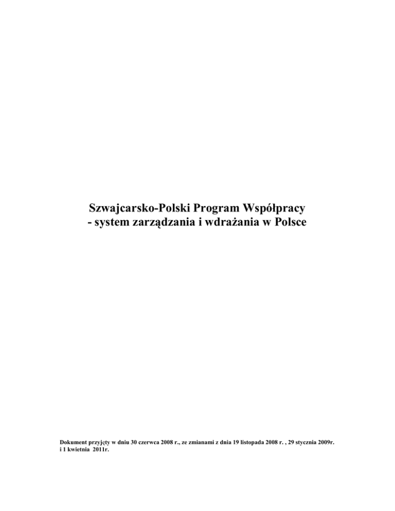 Szwajcarsko-Polski Program Współpracy - system zarządzania i wdraŜania w Polsce Dokument przyjęty w dniu 30 czerwca 2008 r., ze zmianami z dnia 19 listopada 2008 r. , 29 stycznia 2009r. i 1 kwietnia 2011r. Szwajcarsko-Polski Program Współpracy - system zarządzania i wdraŜania w Polsce WSTĘP .................................................................................................................................3 1. CELE ................................................................................................................................3 2. ZASADY ...........................................................................................................................3 3. SYSTEM ZARZĄDZANIA I WDRAśANIA PO STRONIE POLSKIEJ .....................4 3.1. STRUKTURA INSTYTUCJONALNA ....................................................................................4 Krajowa Instytucja Koordynująca...................................................................................4 Instytucje Pośredniczące.................................................................................................5 Właściwe ministerstwa i/lub właściwe regionalne i lokalne władze samorządowe...........6 Komisje Oceniające ........................................................................................................7 Instytucja Płatnicza ........................................................................................................7 Instytucja Audytu ............................................................................................................7 Komitet Monitorujący .....................................................................................................8 3.2. SYSTEM NABORU WNIOSKÓW ........................................................................................8 Procedura konkursowa ...................................................................................................8 Procedura pozakonkursowa............................................................................................9 3.3. PROCEDURA OCENY I WYBORU ....................................................................................10 Etap 1. Ocena i wstępny wybór projektów na podstawie Zarysu projektu......................10 Ocena formalna ............................................................................................................11 Ocena merytoryczna .....................................................................................................12 Fundusz na Przygotowanie Projektów ..........................................................................12 Procedura odwoławcza.................................................................................................12 Etap 2. Ostateczna ocena i akceptacja projektu na podstawie Kompletnej Propozycji Projektu........................................................................................................................13 Ocena formalna ............................................................................................................13 Ocena merytoryczna .....................................................................................................14 Procedura odwoławcza.................................................................................................14 SCHEMAT OCENY WNIOSKÓW I PODZIAŁU KOMPETENCJI W TYM ZAKRESIE ...........................15 3.4. SYSTEM WDRAśANIA PROJEKTU ..................................................................................16 SCHEMAT WDRAśANIA PROJEKTU ......................................................................................16 3.5. PRZEKAZYWANIE ŚRODKÓW FINANSOWYCH.................................................................16 3.6. MONITOROWANIE I RAPORTOWANIE ............................................................................17 3.7. AUDYT I KONTROLA FINANSOWA ................................................................................19 2 Szwajcarsko-Polski Program Współpracy - system zarządzania i wdraŜania w Polsce Wstęp W kwietniu 2003 r. Rada Unii Europejskiej upowaŜniła Komisję Europejską do przeprowadzenia negocjacji ze Szwajcarią w sprawie umowy dotyczącej wkładu finansowego na rzecz zmniejszenia róŜnic gospodarczych i społecznych w rozszerzonej Unii Europejskiej. Dnia 19 maja 2004 r. podczas Szczytu Szwajcaria - UE, strona szwajcarska zadeklarowała gotowość ustanowienia szwajcarskiego programu pomocowego w wysokości 1 mld CHF. Negocjacje między Komisją Europejską a Rządem Szwajcarii zakończyły się dnia 27 lutego 2006 r. podpisaniem tzw. Memorandum of Understanding. Strona szwajcarska mogła jednak rozpocząć formalne negocjacje z nowymi państwami członkowskimi UE w sprawie przyznania pomocy, dopiero po przeprowadzeniu w dniu 26 listopada 2006 r. referendum w Szwajcarii, które zakończyło się pomyślnieratyfikacją Ustawy federalnej o współpracy z państwami Europy Wschodniej. Zgodnie z postanowieniami Memorandum of Understanding, Polsce, jako jednemu z 10 państw- beneficjentów przypadło 489,020 mln franków szwajcarskich, co stanowi 49% całkowitej puli środków pomocowych. Negocjacje szczegółowych warunków udzielenia pomocy finansowej zakończyły się wraz z podpisaniem między Szwajcarską Radą Federalną a Rządem Polski, dnia 20 grudnia 2007r. Umowy ramowej o wdraŜaniu Szwajcarsko-Polskiego Programu Współpracy w celu zmniejszenia róŜnic społeczno-gospodarczych w obrębie rozszerzonej Unii Europejskiej, zwanej dalej Umową ramową. 1. Cele Zgodnie z załoŜeniami Umowy ramowej, realizacja Szwajcarsko - Polskiego Programu Współpracy, zwanego dalej Programem Współpracy, przyczyni się do zmniejszenia róŜnic społeczno - gospodarczych pomiędzy Polską a bardziej zaawansowanymi państwami rozszerzonej Unii Europejskiej (UE) oraz przyczyni się do zmniejszenia róŜnic społeczno - gospodarc