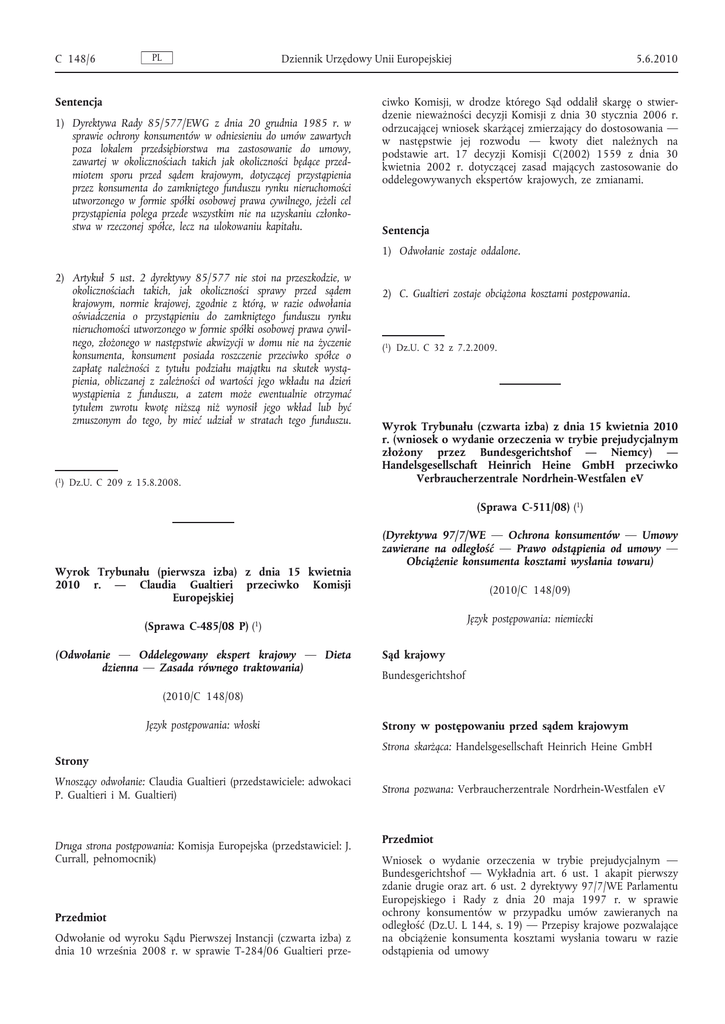 C 148/6 PL Dziennik Urzędowy Unii Europejskiej Sentencja 1) Dyrektywa Rady 85/577/EWG z dnia 20 grudnia 1985 r. w sprawie ochrony konsumentów w odniesieniu do umów zawartych poza lokalem przedsiębiorstwa ma zastosowanie do umowy, zawartej w okolicznościach takich jak okoliczności będące przed miotem sporu przed sądem krajowym, dotyczącej przystąpienia przez konsumenta do zamkniętego funduszu rynku nieruchomości utworzonego w formie spółki osobowej prawa cywilnego, jeżeli cel przystąpienia polega przede wszystkim nie na uzyskaniu członko stwa w rzeczonej spółce, lecz na ulokowaniu kapitału. 5.6.2010 ciwko Komisji, w drodze którego Sąd oddalił skargę o stwier dzenie nieważności decyzji Komisji z dnia 30 stycznia 2006 r. odrzucającej wniosek skarżącej zmierzający do dostosowania — w następstwie jej rozwodu — kwoty diet należnych na podstawie art. 17 decyzji Komisji C(2002) 1559 z dnia 30 kwietnia 2002 r. dotyczącej zasad mających zastosowanie do oddelegowywanych ekspertów krajowych, ze zmianami. Sentencja 1) Odwołanie zostaje oddalone. 2) Artykuł 5 ust. 2 dyrektywy 85/577 nie stoi na przeszkodzie, w okolicznościach takich, jak okoliczności sprawy przed sądem krajowym, normie krajowej, zgodnie z którą, w razie odwołania oświadczenia o przystąpieniu do zamkniętego funduszu rynku nieruchomości utworzonego w formie spółki osobowej prawa cywil nego, złożonego w następstwie akwizycji w domu nie na życzenie konsumenta, konsument posiada roszczenie przeciwko spółce o zapłatę należności z tytułu podziału majątku na skutek wystą pienia, obliczanej z zależności od wartości jego wkładu na dzień wystąpienia z funduszu, a zatem może ewentualnie otrzymać tytułem zwrotu kwotę niższą niż wynosił jego wkład lub być zmuszonym do tego, by mieć udział w stratach tego funduszu. (1) Dz.U. C 209 z 15.8.2008. 2) C. Gualtieri zostaje obciążona kosztami postępowania. (1) Dz.U. C 32 z 7.2.2009. Wyrok Trybunału (czwarta izba) z dnia 15 kwietnia 2010 r. (wniosek o wydanie orzeczenia w trybie prejudycjalnym złożony przez Bundesgerichtshof — Niemcy) — Handelsgesellschaft Heinrich Heine GmbH przeciwko Verbraucherzentrale Nordrhein-Westfalen eV (Sprawa C-511/08) (1) Wyrok Trybunału (pierwsza izba) z dnia 15 kwietnia 2010 r. — Claudia Gualtieri przeciwko Komisji Europejskiej (Dyrektywa 97/7/WE — Ochrona konsumentów — Umowy zawierane na odległość — Prawo odstąpienia od umowy — Obciążenie konsumenta kosztami wysłania towaru) (2010/C 148/09) Język postępowania: niemiecki (Sprawa C-485/08 P) (1) (Odwołanie — Oddelegowany ekspert krajowy — Dieta dzienna — Zasada równego traktowania) Sąd krajowy Bundesgerichtshof (2010/C 148/08) Język postępowania: włoski Strony w postępowaniu przed sądem krajowym Strona skarżąca: Handelsgesellschaft Heinrich Heine GmbH Strony Wnoszący odwołanie: Claudia Gualtieri (przedstawiciele: adwokaci P. Gualtieri i M. Gualtieri) Druga strona postępowania: Komisja Europejska (przedstawiciel: J. Currall, pełnomocnik) Przedmiot Odwołanie od wyroku Sądu Pierwszej Instancji (czwarta izba) z dnia 10 września 2008 r. w sprawie T-284/06 Gualtieri prze Strona pozwana: Verbraucherzentrale Nordrhein-Westfalen eV Przedmiot Wniosek o wydanie orzeczenia w trybie prejudycjalnym — Bundesgerichtshof — Wykładnia art. 6 ust. 1 akapit pierwszy zdanie drugie oraz art. 6 ust. 2 dyrektywy 97/7/WE Parlamentu Europejskiego i Rady z dnia 20 maja 1997 r. w sprawie ochrony konsumentów w przypadku umów zawieranych na odległość (Dz.U. L 144, s. 19) — Przepisy krajowe pozwalające na obciążenie konsumenta kosztami wysłania towaru w razie odstąpienia od umowy