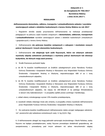 Załącznik nr 1 do Zarządzenia Nr 750/2017 Burmistrza Nidzicy z dnia 23.01.2017 r. REGULAMIN dofinansowania demontażu, odbioru, transportu i unieszkodliwienia azbestu i wyrobów zawierających azbest z obiektów budowlanych z terenu Gminy Nidzica na rok 2017 1. Regulamin określa zasady przyznawania dofinansowania na realizacje przedsięwzięć polegających na pokryciu części kosztów związanych z demontażem, odbiorem, transportem i unieszkodliwieniem wyrobów zawierających azbest z obiektów budowlanych (mieszkalnych i gospodarczych) z terenu Gminy Nidzica. 2. Dofinansowanie nie pokrywa kosztów związanych z zakupem i montażem nowych pokryć dachowych i innych elementów budowlanych. 3. Dofinansowanie nie obejmuje tych osób fizycznych, które we własnym zakresie wywiozły odpady azbestowe pochodzące z wymiany pokryć dachowych lub elewacji budynków, do których mają tytuł prawny. 4. Środki finansowe pochodzić będą: a. do 85 % kosztów kwalifikowanych ze środków udostępnionych przez Narodowy Fundusz Ochrony Środowiska i Gospodarki Wodnej w Warszawie oraz Wojewódzki Funduszu Ochrony Środowiska i Gospodarki Wodnej w Olsztynie, nieprzekraczające 680 zł za 1 tonę unieszkodliwionych odpadów, b. do 85 % kosztów kwalifikowanych ze środków udostępnionych przez Narodowy Fundusz Ochrony Środowiska i Gospodarki Wodnej w Warszawie oraz Wojewódzki Funduszu Ochrony Środowiska i Gospodarki Wodnej w Olsztynie, nieprzekraczające 680 zł za 1 tonę unieszkodliwionych odpadów, nie więcej niż 200 000,00 zł na jednego Wnioskodawcę w danym roku kalendarzowym – w przypadku spółek prawa cywilnego i handlowego, c. wkład własny wnioskującego wynosi 15% kosztów przedsięwzięcia, d. wysokość wkładu własnego może ulec zmianie, w przypadku zmiany wysokości dofinansowania przez Wojewódzki Fundusz Ochrony Środowiska i Gospodarki Wodnej w Olsztynie. 5. Do wyliczenia kosztów kwalifikowanych dofinansowania należy przyjąć następujące założenia: 1m2 powierzchni płyt azbestowo-cementowych waży 11 kg (0,011 Mg). 6. O dofinansowanie ubiegać się mogą jednostki samorządu terytorialnego i Skarb Państwa, osoby fizyczne nie będące przedsiębiorcami, osoby fizyczne prowadzące działalność gospodarczą, ale zarejestrowaną i prowadzoną pod innym adresem niż adres nieruchomości objętej 1 dofinansowaniem, rolnicy, kościoły i związki wyznaniowe, stowarzyszenia, spółdzielnie mieszkaniowe, wspólnoty mieszkaniowe, rodzinne ogrody działkowe, będące we władaniu Polskiego Związku Działkowców, jednostki sektora finansów publicznych będące gminnymi lub powiatowymi osobami prawnymi, spółki prawa cywilnego i handlowego. 7. Dofinansowanie nie dotyczy nieruchomości wykorzystywanych do prowadzenia działalności gospodarczej. 8. Udzielenie pomocy na zdjęcie oraz/lub transport i utylizację wyrobów zawierających azbest stanowi pomoc de minimis, w myśl Ustawy z dnia 30 kwietnia 2004 r. o postępowaniu w sprawach dotyczących pomocy publicznej (Dz. U. z 2016 r. poz. 1808 ze zm.) 9. Podmiot ubiegający się o udzielenie pomocy de minimis zobowiązuje się do wypełnienia FORMULARZA INFORMACJI PRZEDSTAWIANYCH PRZY UBIEGANIU SIĘ O POMOC DE MINIMIS , na formularzu stanowiącym załącznik do rozporządzenia Rady Ministrów z dnia 24 października 2014 r. (Dz.U. z 2014 poz. 1543) zmieniającego rozporządzenie Rady Ministrów z dnia 29 marca 2010 r. w sprawie zakresu informacji przedstawianych przez podmiot ubiegający się o pomoc de minimis (Dz. U. z 2010 r. Nr 53, poz. 311). 10. Osoby prowadzące działalność w rolnictwie i/lub w rybołówstwie zobowiązane się do wypełnienia FORMULARZA INFORMACJI PRZEDSTAWIANYCH PRZEZ WNIOSKODAWCĘ zgodnie z Rozporządzeniem Rady Ministrów z dnia 11 czerwca 2010 r. w sprawie informacji składanych przez podmioty ubiegające się o pomoc de minimis w rolnictwie lub rybołówstwie (Dz. U z 2010 r., Nr 121, poz. 810) 11. Gmina Nidzica, na potwierdzenie udzielonej pomocy, wyda zaświadczenie o pomocy de minimis i pomocy de minimis w rolnictwie i/lub rybołówstwie zgodnie z Rozporządzeniem Rady Ministrów z dnia 20 marca 2007 r. w sprawie zaświadczeń o pomocy de minimis i pomocy de minimis w rolnictwie lub rybołówstwie (Dz. U. z 2015 r. poz. 1983 ze zm.) 12. Dofinansowanie przysługuje osobom mającym tytuł prawny do nieruchomości zlokalizowanej na terenie gminy Nidzica, na której znajduje się azbest lub wyroby zawierające azbest. 13. Wyboru firmy, która wykona prace na każdej nieruchomości objętej dofinansowaniem dokona Gmina Nidzica w ramach postępowania o udzielenie zamówienia publicznego. Prace związane z demontażem, transportem i unieszkodliwieniem odpadów niebezpiecznych (azbestowych) mogą być wykonywane tylko przez wyspecjalizowaną firmę posiadającą stosowne zezwolenie. 14. W celu ubiegania się o dofinansowanie przedsięwzięcia określonego w pkt 1 należy złożyć wniosek, zgodnie ze wzorem stanowiącym załącznik nr 1 do niniejszego Regulaminu w terminie do 28.02.2017 r. w Biurze Obsługi Klienta (pokój nr 1). Do wniosku należy dołączyć: a) Dokument potwierdzający tytuł prawny do budynku/działki: 2 w przypadku budynków mieszkalnych będących wyłączną własnością wnioskodawcy – aktualny wypis z rejestru gruntów (ze Starostwa Powiatowego w Nidzicy), w przypadku budynków mieszkalnych będących przedmiotem współwłasności – zgoda wszystkich współwłaścicieli na wykonanie prac związanych z usuwaniem odpadów niebezpiecznych zawierających azbest wraz z aktualnym wypisem z rejestru gruntów (ze Starostwa Powiatowego w Nidzicy), upoważnienie dla wnioskodawcy do złożenia wniosku w imieniu wszystkich współwłaścicieli i do podpisania umowy z Gminą Nidzica (załącznik nr 1 do Wniosku), w przypadku altan w rodzinnych ogrodach działkowych - potwierdzenie zarządu ogrodu działkowego, że wnioskodawca jest użytkownikiem działki i właścicielem po