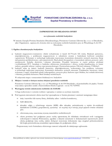 ZAPROSZENIE DO SKŁADANIA OFERT na wykonanie rozbiórki budynków W imieniu Zarządu Powiatu Strzelecko-Drezdeneckiego, Powiatowe Centrum Zdrowia Sp. z o.o. w Drezdenku, jako Organizator, zaprasza do złożenia ofert na wykonanie rozbiórki budynków przy ul. Piłsudskiego 8, 66-530 Drezdenko. 1. Ogólna charakterystyka budynków: a) budynek magazynowo-warstatowy: obiekt wybudowany w latach 60/70-tych XX wieku. Budynek parterowy, niepodpiwniczony, z poddaszem magazynowym w zabudowie zwartej z budynkami kotłowni centralnej i garażowym. Wykonany w technologii tradycyjnej murowanej, konstrukcja elementów nośnych masywna, Strop nad parterem prefabrykowany z płyt panwiowych. Dach płaski dwuspadowy o konstrukcji stalowej, poszycie z płyt eternitowych. Stolarka drzwiowa i okienna drewniana. Posadzki betonowe w części pokryte płytkami i wykładzinami PCV. Instalacje w budynku: elektryczna oświetleniowa i siłowa, wodno-kanalizacyjna, co (ruraż stalowy, grzejniki żeliwne i stalowe typu przemysłowego). Powierzchnia parteru 538,1m2, kubatura 3 928,0m3. b) budynek wiata na śmieci: budynek parterowy, niepodpiwniczony, wolnostojący, bez poddasza, wykonany w technologii tradycyjnej murowanej, konstrukcja elementów nośnych mieszana. Fundamenty betonowe, ściany wykonane z cegieł, stropodach płaski, jednospadowy, poszycie płyty dachowe typu Oduline, bez stolarki drzwiowej i okiennej, posadzka betonowa. Brak instalacji technicznych. W załączeniu mapa z oznaczeniem lokalizacji ww. budynków 2. Miejsce i termin w którym można obejrzeć przedmiot rozbiórki Powiatowe Centrum Zdrowia Sp. z o.o. ul. Piłsudskiego 8, 66-530 Drezdenko, od poniedziałku do piątku. Termin wizji należy uprzednio ustalić z Kierownikiem Działu Logistyki – nr tel. 95/7639955. 3. Wymagany termin zakończenia rozbiórki: do 15.05.016 Usługa realizowana w systemie rozbierz i uprzątnij, w zamian za uzyskane materiały. 4. Pod rygorem nieważności oferta musi być sporządzona w formie pisemnej i zawierać następujące dane: • imię i nazwisko lub nazwę firmy, dokładny adres i telefon kontaktowy, • NIP, REGON, • aktualny odpis z właściwego rejestru (KRS) albo aktualne zaświadczenie o wpisie do ewidencji działalności (CEDiG) gospodarczej, wystawiony nie wcześniej niż 6 miesięcy przed upływem terminu składania ofert, • oferowaną cenę, szacowaną wycenę materiałów rozbiórkowych • oferta powinna być podpisana przez osobę uprawnioną do składania oświadczeń woli i zaciągania zobowiązań w imieniu Wykonawcy, zgodnie z danymi zawartymi w dokumentach rejestrowych. Jeżeli ofertę podpisuje inna osoba, należy dołączyć stosowane dokumenty (np.: oryginał pełnomocnictwa lub kopię potwierdzoną notarialnie) uprawniające do podpisania oferty. Proponowany wzór formularza ofertowego stanowi załącznik do niniejszego ogłoszenia Data publikacji na tablicy ogłoszeń oraz stronie internetowej Zamawiającego www.szpital-drezdenko.pl –12.04.2016r. 1 5. Termin składania ofert: Oferty należy składać w formie pisemnej w Sekretariacie Powiatowego Centrum Zdrowia Sp. z o.o., ul.Piłsudskiego 8, 66-530 Drezdenko, do dnia 20 kwietnia 2016r. Pożądane jest, aby oferta złożona została Zamawiającemu w zaklejonym, nieprzezroczystym i nienaruszonym opakowaniu opatrzona następującym opisem: Powiatowe Centrum Zdrowia Sp. z o.o., ul. Piłsudskiego 8, 66-530 Drezdenko Oferta na rozbiórkę budynków Dopuszcza się możliwość wysłania oferty pocztą elektroniczną ([email protected]) pod warunkiem niezwłocznego dostarczenia drogą tradycyjną. 6. Miejsce i termin otwarcia ofert 6.1 Oferty złożone w terminie zostaną przekazane do Właściciela przedmiotu rozbiórki. 6.2 Właściciel zastrzega sobie prawo swobodnego wyboru oferty, a także zamknięcia/ unieważnienia postępowania bez wybrania którejkolwiek z ofert, bez podawania przyczyny. 7. Minimalny termin związania ofertą - 30 dni. 8. Dopuszcza się możliwość negocjowania warunków realizacji po złożeniu oferty. Pożądane jest, aby Wykonawca określił w treści składanej oferty, czy jest zainteresowany dalszymi negocjacjami. 9. Forma porozumienia się z Organizatorem W przedmiotowym postępowaniu oświadczenia, wnioski, zawiadomienia oraz informacje mogą być przekazywane pisemnie, za pomocą faksu – pod nr 95/7639974 lub poczty elektronicznej [email protected] . 10. Tryb i forma udzielania wyjaśnień. Wykonawca może zwrócić się do Organizatora o wyjaśnienie treści ogłoszenia, przekazanie dodatkowych informacji. Treść zapytań wraz z wyjaśnieniami zostanie opublikowana na stronie internetowej, na której umieszczono ogłoszenie. 11. Pozostałe warunki. 11.1 Wykonawca zobowiązany będzie zrealizować przedmiot zamówienia zgodnie z obowiązującymi przepisami techniczno-budowlanymi, normami oraz zasadami współczesnej wiedzy technicznej określonymi w Ustawie Prawo Budowlane z dnia 7 lipca 1994 r. (T.J Dz.U. z dnia 27 listopada 2013r., nr 907 ze zm.). 11.2 Treść stosunku zobowiązaniowego ustalony zostanie po dokonaniu wyboru oferty. 11.3 Organizator zastrzega sobie prawo odwołania przetargu bez podawania przyczyny. 11.4 Ogłoszenie o postępowaniu dostępne jest również pod adresem www.bip.fsd.pl, www.szpital-drezdenko.pl . WICEPREZES PREZES Dariusz Kopka Wanda Elżbieta Szumna Potwierdzenie zamieszczenia ogłoszenia Data publikacji na tablicy ogłoszeń oraz stronie internetowej Zamawiającego www.szpital-drezdenko.pl –12.04.2016r. 2