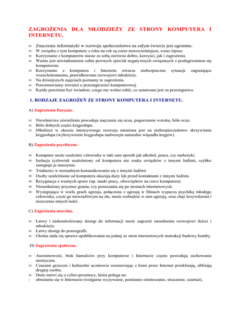 zagrożenia dla młodzieży ze strony komputera i internetu.