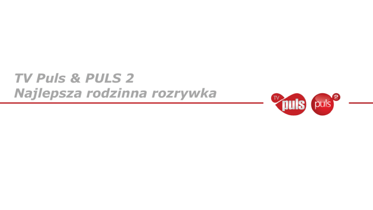 TV Puls & PULS 2 Najlepsza rodzinna rozrywka Agenda 1. Telewizja Puls Sp. z o.o. 2. TV Puls 3. PULS 2 2 1. Telewizja Puls sp. z o.o. Telewizja Puls sp. z o.o. • Telewizja Puls Sp. z o.o. to jedna z największych niezależnych telewizji w Polsce, która jest właścicielem dwóch ogólnopolskich kanałów telewizyjnych – TV Puls i PULS 2 z licencją na nadawanie w ramach naziemnej telewizji cyfrowej. Telewizja Puls Sp. z o.o. regularnie współpracuje z największymi światowymi wytwórniami, takimi jak Time Warner, Disney, FOX, NBC, Discovery i Viacom Telewizja Puls jest czwartą grupą mediową na polskim rynku TV Puls i PULS 2 znajdują się na multipleksie MUX 2 (DTT), którego zasięg pokrywa 97% terytorium Polski Rodzinna oferta programowa TV Puls i PULS 2 jest komplementarna TV Puls i PULS 2 mają ponad 5,5% udziału (SHR, 16-49) w polskim rynku tv 4 Komplementarność ramówek TV Puls i PULS 2 – pasma dla rodziców z dziećmi PONIEDZIAŁEK 07:00 19:00 19:00 20:00 WTOREK ŚRODA CZWARTEK PIĄTEK SOBOTA NIEDZIELA 07:00 12:00 JUNIOR TV 12:00 19:00 WEEKENDOWE KINO DLA CAŁEJ RODZINY 19:00 20:00 JUNIOR TV – PINGWINY Z MADAGASKARU JUNIOR TV JUNIOR TV – PINGWINY Z MADAGASKARU Telewizja Puls sp. z o.o. Obydwa kanały w TOP 10 w Polsce! 14,0% 12,1% 12,0% 11,0% SHR% 10,0% 7,3% 8,0% 6,8% 6,0% 3,7% 3,7% 4,0% 2,9% 2,7% 2,0% 2,2% 1,9% 1,9% 1,5% 1,5% 1,4% 1,3% 1,2% 1,1% 1,1% 1,0% 1,0% Źródło: Nielsen Audience Measurement 01-31.08.2014, A16-49 ATM Rozrywka Stopklatka TVP Rozrywka Polsat News TV6 Polo TV Eska TV TVP INFO TTV - Twoja Telewizja TVP Seriale PULS 2 Polsat2 TV4 TVN24 TV Puls TVN7 TVP2 TVP1 TVN Polsat 0,0% 6 Źródło: Nielsen Audience Measurement 01.01.2014-31.08.2014, A16-49 kanały - Polcast kanały - ATC kanały - Universal kanały - 4fun Media kanały - HBO kanały - Time Warner kanały - BBC kanały - Sony PTI kanały - Disney kanały - Fox kanały - Kino Polska kanały - Canal+ kanały - ZPR kanały - Viacom 5,0% kanały - Discovery kanały - Puls kanały - TVN 25,0% kanały - Polsat kanały - TVP SHR% Telewizja Puls sp. z o.o. Telewizja Puls jest 4. grupą mediową w Polsce! 30,0% 24,9% 24,0% 21,6% 20,0% 15,0% 10,0% 5,0% 3,2% 2,9% 2,6% 2,2% 1,4% 1,1% 1,0% 0,9% 0,8% 0,8% 0,7% 0,6% 0,3% 0,3% 0,2% 0,0% 7 Telewizja Puls sp. z o.o. Piąta pozycja TV Puls i szóste miejsce PULS 2 wśród widzów DVB-T! 18,0% 16,0% 16,0% 14,0% 11,1% SHR% 12,0% 10,0% 8,3% 8,0% 7,5% 6,7% 5,5% 5,1% 6,0% 4,5% 4,0% 3,6% 3,1% 3,1% 2,9% 2,8% 2,7% 2,5% 2,0% 2,0% 1,7% 1,5% 1,5% 1,5% Źródło: Nielsen Audience Measurement 01-31.08.2014, DVB-T 16-49 TVP Regionalna TVP Polonia TVP Historia Fokus TV TVP Rozrywka Stopklatka ATM Rozrywka Eska TV Polo TV TVP INFO TV6 TTV - Twoja Telewizja TV4 TVN7 PULS 2 TV Puls TVP2 TVP1 TVN Polsat 0,0% 8 2. TV Puls TV Puls Atrakcyjny kanał telewizyjny z najlepszą rodzinną rozrywką! Jeden z pięciu czołowych kanałów tv w Polsce Wyróżnia się najlepszą rodzinną ofertą programową, wysoko ceni bezpieczeństwo oraz przewidywalność przy oglądaniu telewizji. Filarami ramówki skierowanej także do rodziców z dziećmi są stałe pasma: Weekendowe Kino dla całej rodziny oraz Junior TV Pasmo Junior TV jest emitowane codziennie o godzinie 19:00, a w nim od jesieni wróciły cieszące się niesłabnącą popularnością „Pingwiny z Madagaskaru”. W tym roku (drugi rok z rzędu) kanał TV Puls otrzymał prestiżową Telekamerę Tele Tygodnia za ogromny wzrost oglądalności i dołączenie do piątki największych kanałów telewizyjnych w Polsce. 10 TV Puls TV Puls – dynamiczny wzrost oglądalności w latach 2006-2014 SHR% 4,5% 4,0% 3,72% 3,36% 3,5% 3,0% 2,51% 2,5% 1,94% 2,0% 1,52% 1,5% 1,06% 1,0% 0,5% 0,76% 0,35% 0,49% 0,0% 2006 2007 2008 2009 2010 Źródło: Nielsen Audience Measurement 01.01.2006 – 31.05.2014, A16-49 2011 2012 2013 May 2014 11 Start TV Puls HD! We wtorek, 2 września, Telewizja Puls rozpoczął nadawanie kanału TV Puls HD. W pierwszym etapie kanał trafił do oferty największych operatorów kablowych w Polsce (m.in. UPC Polska, VECTRA, TOYA, Petrus, Sat Film) 3. PULS 2 PULS 2 PULS 2 to najszybciej rozwijający się kanał naziemny w Polsce, którego oferta programowa składa się m.in. z przebojowych animacji znanych z płatnych kanałów dziecięcych. Ramówka PULS 2 zbudowana jest komplementarnie w stosunku do TV Puls i wypełniona jest animacjami emitowanymi w paśmie Junior TV od poniedziałku do piątku w godz. 7:00-19:00 oraz w weekendy od 7.00 do 12.00. Obecnie PULS 2 emituje w paśmie Junior TV najlepsze animacje z takich wytwórni jak Time Warner, Rainbow, Disney czy Viacom: „SpongeBob Kanciastoporty”, „KotoPies”, „Marta mówi”, „Gumisie”, „Zwariowane melodie”, „Mia i ja”, „Winx Club”, „Daltonowie”, „Baranek Shaun”, „Angry Birds” czy „Timon i Pumba”. 14 PULS 2 PULS 2 – po 2 latach od startu 1,9% SHR! SHR% 2,5% 1,91% 2,0% 1,5% 1,35% 1,43% 1,0% 0,75% 0,5% 0,33% 0,0% 2H 2012* 1H 2013 2H 2013 Źródło: Nielsen Audience Measurement 19.07.2012-31.08.2014, A16-49 1H 2014 Aug 2014 15 PULS 2 PULS 2 ma wyższy SHR w grupach 4-9 i 4-12 od wszystkich kanałów dziecięcych! Grupa 4-9 Counter Channel Grupa 4-12 (r) SHR % Counter Channels (r) SHR % 1 PULS 2 7,02% 1 PULS 2 6,99% 2 Cartoon Network 6,46% 2 Nickelodeon 5,71% 3 Nickelodeon 5,64% 3 Cartoon Network 5,57% 4 Disney Junior 4,54% 4 Disney Channel 4,57% 5 MiniMini+ 4,38% 6 Disney Channel 3,88% 5 TV Puls 4,05% 7 Nick Jr 3,64% 6 Disney Junior 3,43% 8 TV Puls 3,50% 7 MiniMini+ 3,17% 9 TVP ABC 3,01% 8 Nick Jr 2,62% 10 Boomerang 2,60% 9 TVP ABC 2,53% 11 Disney XD 2,42% 10 Disney XD 2,29% 12 Nickelodeon HD 1,52% 11 Boomerang 1,94% 13 Polsat JimJam 1,37% 12 Nickelodeon HD 1,46% Źródło: Nielsen Audience Measurement 01-31.08.2014, A4-9 i A4-12 16 Dziękujemy