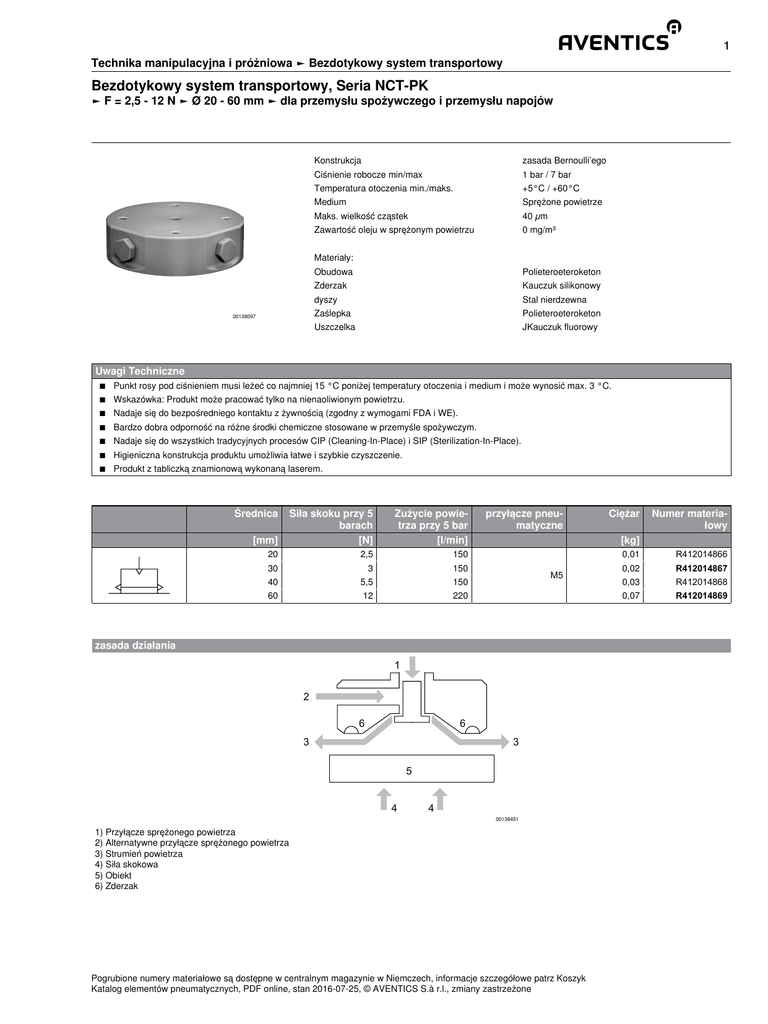 1 Technika manipulacyjna i próżniowa ► Bezdotykowy system transportowy Bezdotykowy system transportowy, Seria NCT-PK ► F = 2,5 - 12 N ► Ø 20 - 60 mm ► dla przemysłu spożywczego i przemysłu napojów Konstrukcja zasada Bernoulli’ego Ciśnienie robocze min/max 1 bar / 7 bar Temperatura otoczenia min./maks. +5°C / +60°C Medium Sprężone powietrze Maks. wielkość cząstek 40 µm Zawartość oleju w sprężonym powietrzu 0 mg/m³ Materiały: 00138097 Obudowa Polieteroeteroketon Zderzak Kauczuk silikonowy dyszy Stal nierdzewna Zaślepka Polieteroeteroketon Uszczelka JKauczuk fluorowy Uwagi Techniczne ■ Punkt rosy pod ciśnieniem musi leżeć co najmniej 15 °C poniżej temperatury otoczenia i medium i może wynosić max. 3 °C. ■ Wskazówka: Produkt może pracować tylko na nienaoliwionym powietrzu. ■ Nadaje się do bezpośredniego kontaktu z żywnością (zgodny z wymogami FDA i WE). ■ Bardzo dobra odporność na różne środki chemiczne stosowane w przemyśle spożywczym. ■ Nadaje się do wszystkich tradycyjnych procesów CIP (Cleaning-In-Place) i SIP (Sterilization-In-Place). ■ Higieniczna konstrukcja produktu umożliwia łatwe i szybkie czyszczenie. ■ Produkt z tabliczką znamionową wykonaną laserem. Średnica [mm] Siła skoku przy 5 barach [N] Zużycie powietrza przy 5 bar [l/min] 30 3 150 40 5,5 150 60 12 220 20 2,5 przyłącze pneumatyczne 150 M5 zasada działania 1 2 6 6 3 3 5 4 4 00138451 1) Przyłącze sprężonego powietrza 2) Alternatywne przyłącze sprężonego powietrza 3) Strumień powietrza 4) Siła skokowa 5) Obiekt 6) Zderzak Pogrubione numery materiałowe są dostępne w centralnym magazynie w Niemczech, informacje szczegółowe patrz Koszyk Katalog elementów pneumatycznych, PDF online, stan 2016-07-25, © AVENTICS S.à r.l., zmiany zastrzeżone Ciężar [kg] Numer materiałowy 0,01 R412014866 0,02 R412014867 0,03 R412014868 0,07 R412014869 2 Technika manipulacyjna i próżniowa ► Bezdotykowy system transportowy Bezdotykowy system transportowy, Seria NCT-PK ► F = 2,5 - 12 N ► Ø 20 - 60 mm ► dla przemysłu spożywczego i przemysłu napojów 200 4,0 180 3,5 160 3,0 140 2,5 120 2,0 100 1,5 80 1,0 60 0,5 40 0 1 2 3 4 P [bar] 5 6 7 8 F [N] Q [l/min] Siła skokowa F i zużycie powietrza Q w zależności od ciśnienia roboczego p, Ø 20 0,0 00138087 Siła skokowa F i zużycie powietrza Q w zależności od ciśnienia roboczego p, Ø 30 200 5,0 180 4,5 4,0 160 3,5 3,0 2,5 120 2,0 100 1,5 80 1,0 60 40 F [N] Q [l/min] 140 0,5 0 1 2 3 4 P [bar] 5 6 7 8 0,0 00138088 Pogrubione numery materiałowe są dostępne w centralnym magazynie w Niemczech, informacje szczegółowe patrz Koszyk Katalog elementów pneumatycznych, PDF online, stan 2016-07-25, © AVENTICS S.à r.l., zmiany zastrzeżone 3 Technika manipulacyjna i próżniowa ► Bezdotykowy system transportowy Bezdotykowy system transportowy, Seria NCT-PK ► F = 2,5 - 12 N ► Ø 20 - 60 mm ► dla przemysłu spożywczego i przemysłu napojów 220 9,0 200 8,0 180 7,0 160 6,0 140 5,0 120 4,0 100 3,0 80 2,0 60 1,0 40 0 1 2 3 4 P [bar] 5 6 7 8 F [N] Q [l/min] Siła skokowa F i zużycie powietrza Q w zależności od ciśnienia roboczego p, Ø 40 0,0 00138089 Siła skokowa F i zużycie powietrza Q w zależności od ciśnienia roboczego p, Ø 60 20,0 340 18,0 290 16,0 14,0 12,0 10,0 190 F [N] Q [l/min] 240 8,0 140 6,0 4,0 90 2,0 40 0 1 2 3 4 P [bar] 5 6 7 8 0,0 00138090 Pogrubione numery materiałowe są dostępne w centralnym magazynie w Niemczech, informacje szczegółowe patrz Koszyk Katalog elementów pneumatycznych, PDF online, stan 2016-07-25, © AVENTICS S.à r.l., zmiany zastrzeżone 4 Technika manipulacyjna i próżniowa ► Bezdotykowy system transportowy Bezdotykowy system transportowy, Seria NCT-PK ► F = 2,5 - 12 N ► Ø 20 - 60 mm ► dla przemysłu spożywczego i przemysłu napojów Rozmiary, Ø 20 6 M5 15 )M3 (3x 26 26,50 3 4 20 2 1 00138091 1) Zderzak 2) Dysza 3) Przyłącze sprężonego powietrza 4) alternatywne przyłącze sprężonego powietrza ze śrubą zamykającą Rozmiary, Ø 30 6 4 M5 22 )M (4x 17 17,6 3 30 4 31 2 1 00138092 1) Zderzak 2) Dysza 3) Przyłącze sprężonego powietrza 4) alternatywne przyłącze sprężonego powietrza ze śrubą zamykającą Pogrubione numery materiałowe są dostępne w centralnym magazynie w Niemczech, informacje szczegółowe patrz Koszyk Katalog elementów pneumatycznych, PDF online, stan 2016-07-25, © AVENTICS S.à r.l., zmiany zastrzeżone 5 Technika manipulacyjna i próżniowa ► Bezdotykowy system transportowy Bezdotykowy system transportowy, Seria NCT-PK ► F = 2,5 - 12 N ► Ø 20 - 60 mm ► dla przemysłu spożywczego i przemysłu napojów Rozmiary, Ø 40 4 45 6 M5 )M (4x 17 17,6 3 60 61 4 1 2 00138093 1) Zderzak 2) Dysza 3) Przyłącze sprężonego powietrza 4) alternatywne przyłącze sprężonego powietrza ze śrubą zamykającą Pogrubione numery materiałowe są dostępne w centralnym magazynie w Niemczech, informacje szczegółowe patrz Koszyk Katalog elementów pneumatycznych, PDF online, stan 2016-07-25, © AVENTICS S.à r.l., zmiany zastrzeżone 6 Technika manipulacyjna i próżniowa ► Bezdotykowy system transportowy Bezdotykowy system transportowy, Seria NCT-PK ► F = 2,5 - 12 N ► Ø 20 - 60 mm ► dla przemysłu spożywczego i przemysłu napojów Rozmiary, Ø 60 4 45 6 M5 )M (4x 17 17,6 3 60 61 4 1 2 00138094 1) Zderzak 2) Dysza 3) Przyłącze sprężonego powietrza 4) alternatywne przyłącze sprężonego powietrza ze śrubą zamykającą Pogrubione numery materiałowe są dostępne w centralnym magazynie w Niemczech, informacje szczegółowe patrz Koszyk Katalog elementów pneumatycznych, PDF online, stan 2016-07-25, © AVENTICS S.à r.l., zmiany zastrzeżone