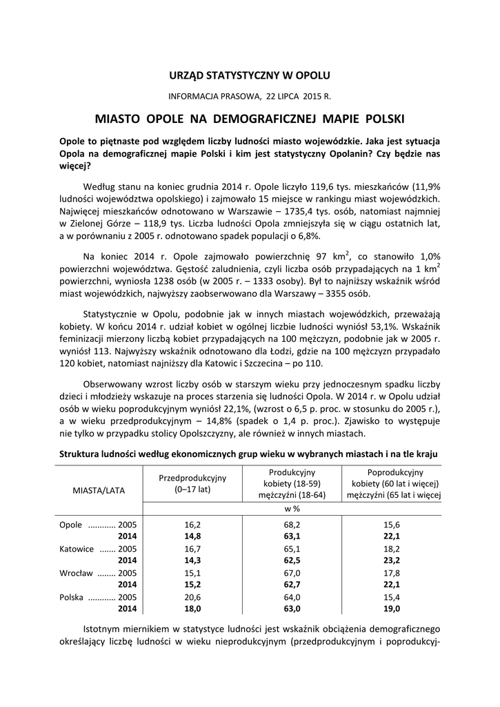 URZĄD STATYSTYCZNY W OPOLU INFORMACJA PRASOWA, 22 LIPCA 2015 R. MIASTO OPOLE NA DEMOGRAFICZNEJ MAPIE POLSKI Opole to piętnaste pod względem liczby ludności miasto wojewódzkie. Jaka jest sytuacja Opola na demograficznej mapie Polski i kim jest statystyczny Opolanin? Czy będzie nas więcej? Według stanu na koniec grudnia 2014 r. Opole liczyło 119,6 tys. mieszkańców (11,9% ludności województwa opolskiego) i zajmowało 15 miejsce w rankingu miast wojewódzkich. Najwięcej mieszkańców odnotowano w Warszawie – 1735,4 tys. osób, natomiast najmniej w Zielonej Górze – 118,9 tys. Liczba ludności Opola zmniejszyła się w ciągu ostatnich lat, a w porównaniu z 2005 r. odnotowano spadek populacji o 6,8%. Na koniec 2014 r. Opole zajmowało powierzchnię 97 km2, co stanowiło 1,0% powierzchni województwa. Gęstość zaludnienia, czyli liczba osób przypadających na 1 km2 powierzchni, wyniosła 1238 osób (w 2005 r. – 1333 osoby). Był to najniższy wskaźnik wśród miast wojewódzkich, najwyższy zaobserwowano dla Warszawy – 3355 osób. Statystycznie w Opolu, podobnie jak w innych miastach wojewódzkich, przeważają kobiety. W końcu 2014 r. udział kobiet w ogólnej liczbie ludności wyniósł 53,1%. Wskaźnik feminizacji mierzony liczbą kobiet przypadających na 100 mężczyzn, podobnie jak w 2005 r. wyniósł 113. Najwyższy wskaźnik odnotowano dla Łodzi, gdzie na 100 mężczyzn przypadało 120 kobiet, natomiast najniższy dla Katowic i Szczecina – po 110. Obserwowany wzrost liczby osób w starszym wieku przy jednoczesnym spadku liczby dzieci i młodzieży wskazuje na proces starzenia się ludności Opola. W 2014 r. w Opolu udział osób w wieku poprodukcyjnym wyniósł 22,1%, (wzrost o 6,5 p. proc. w stosunku do 2005 r.), a w wieku przedprodukcyjnym – 14,8% (spadek o 1,4 p. proc.). Zjawisko to występuje nie tylko w przypadku stolicy Opolszczyzny, ale również w innych miastach. Struktura ludności według ekonomicznych grup wieku w wybranych miastach i na tle kraju MIASTA/LATA Przedprodukcyjny (0–17 lat) Opole ............ 2005 2014 Katowice ....... 2005 2014 Wrocław ........ 2005 2014 Polska ............ 2005 2014 16,2 14,8 16,7 14,3 15,1 15,2 20,6 18,0 Produkcyjny kobiety (18-59) mężczyźni (18-64) w% Poprodukcyjny kobiety (60 lat i więcej) mężczyźni (65 lat i więcej 68,2 63,1 65,1 62,5 67,0 62,7 64,0 63,0 15,6 22,1 18,2 23,2 17,8 22,1 15,4 19,0 Istotnym miernikiem w statystyce ludności jest wskaźnik obciążenia demograficznego określający liczbę ludności w wieku nieprodukcyjnym (przedprodukcyjnym i poprodukcyj- nym) na 100 osób w wieku produkcyjnym. W 2014 r. dla miasta Opola wartość tego wskaźnika wyniosła 58, a w porównaniu z 2005 r. (wartość wskaźnika – 47) obciążenie ludności w wieku produkcyjnym ludnością w wieku nieprodukcyjnym zwiększyło się o 11 osób. Najwyższy wskaźnik obciążenia demograficznego odnotowano w Łodzi – 65, a najniższy w Białymstoku – 55 (w 2005 r. było to odpowiednio: 52 i 50). LUDNOŚĆ W WIEKU NIEPRODUKCYJNYM NA 100 OSÓB W WIEKU PRODUKCYJNYM Białystok Bydgoszcz Gdańsk Katowice Kielce Kraków Lublin Łódź 2005 Olsztyn 2014 Opole Poznań Rzeszów Szczecin Warszawa Wrocław Zielona Góra 0 10 20 30 40 50 60 70 osoby W Opolu od kilkunastu lat (z wyjątkiem lat 2008–2010) utrzymywała się przewaga liczby zgonów nad liczbą urodzeń żywych, wskutek czego notowany był ujemny przyrost naturalny. W 2014 r. liczba urodzeń żywych w przeliczeniu na 1000 ludności wyniosła 8,9 natomiast liczba zgonów 9,5 (w 2005 r. odpowiednio: 8,0 i 8,6). Wskaźnik przyrostu naturalnego na 1000 ludności wyniósł minus 0,1 (w 2005 r. minus 0,5). Oprócz Opola ujemną wartość wskaźnika odnotowano jeszcze w 5 miastach wojewódzkich, w tym najniższą w Łodzi, tj. minus 5,5). W pozostałych miastach wystąpił dodatni przyrost naturalny, a najwyższy wskaźnik odnotowano w Rzeszowie (3,3). Obserwuje się również wzrost mediany wieku ludności Opola, co jest skutkiem wydłużania się przeciętnego trwania życia oraz niskiej liczby urodzeń. Wartość mediany (wiek środkowy) wyznacza granicę wieku, którą połowa mieszkańców miasta już przekroczyła, a druga połowa jeszcze nie osiągnęła. W 2014 r. mediana wieku ludności Opola ogółem wynosiła 42 lata, przy czym statystyczna Opolanka miała 44 lata, a Opolanin – 40 lat. Dla porównania w 2005 r. mediana ogółem wynosiła 38 lat, dla kobiet – 40 lat, a dla mężczyzn – 36 lat. Oznacza to, że po upływie 10 lat statystyczny mieszkaniec Opola był o 4 lata starszy. W 2014 r. najwyższą wartość mediany wieku odnotowano w Łodzi i Katowicach – po 44 lata, natomiast najniższą w Rzeszowie – 38 lat. MEDIANA WIEKU W 2014 R. wiek 45 43 41 39 37 35 Z uwagi na ruch migracyjny ludności, można stwierdzić, że więcej osób wyjeżdżało z Opola niż przybywało do miasta na stałe, wskutek czego odnotowano ujemne saldo migracji. W 2014 r. wskaźnik salda migracji w przeliczeniu na 1000 ludności wyniósł minus 1,1 (minus 3,3 w 2005 r.). Oprócz Opola, w wyniku migracji, jeszcze w 7 miastach wojewódzkich więcej osób wyjeżdżało niż przyjeżdżało na stałe, a najniższy wskaźnik odnotowano dla Poznania (minus 3,5) i Katowic (minus 3,4). Dodatnie saldo migracji wystąpiło w 8 miastach, a najwięcej osób osiedliło się w Warszawie i Zielonej Górze (wartość wskaźnika wyniosła odpowiednio: 5,2 i 4,4). Przewiduje się, że liczba mieszkańców Opola będzie w kolejnych latach stale się zmniejszać i zgodnie z najnowszą prognozą demograficzną w 2050 r. wyniesie 90,6 tys. osób (o 24,2% mniej niż w 2014 r.). Zmieni się również znacząco struktura wiekowa ludności. Według prognoz (po uwzględnieniu zmian wieku emerytalnego) zwiększy się udział ludności w wieku poprodukcyjnym (o 10,5%) w stosunku do 2014 r., zmniejszy natomiast udział osób w wieku przedprodukcyjnym (o 2,4%) i produkcyjnym (o 8,1%). Praw