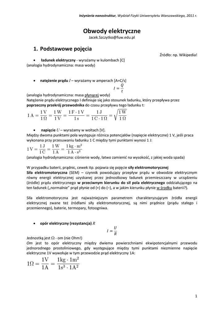 Inżynieria nanostruktur, Wydział Fizyki Uniwersytetu Warszawskiego, 2011 r. Obwody elektryczne [email protected] 1. Podstawowe pojęcia • ładunek elektryczny - wyrażamy w kulombach [C] (analogia hydrodynamiczna: masa wody) Źródło: np. Wikipedia! • natężenie prądu I – wyrażamy w amperach [A=C/s] 𝑄 𝐼= 𝑡 (analogia hydrodynamiczna: masa płynącej wody) Natężenie prądu elektrycznego I definiuje się jako stosunek ładunku, który przepływa przez poprzeczny przekrój przewodnika do czasu przepływu tego ładunku t: • napięcie U – wyrażamy w woltach [V]. Między dwoma punktami pola występuje różnica potencjałów (napięcie elektryczne) 1 V, jeśli praca wykonana przy przesuwaniu ładunku 1 C między tymi punktami wynosi 1 J: (analogia hydrodynamiczna: ciśnienie wody, łatwo zamienić na wysokość, z jakiej woda spada) W przypadku baterii, prądnic, cewek itp. pojawia się pojęcie siły elektromotorycznej Siła elektromotoryczna (SEM) – czynnik powodujący przepływ prądu w obwodzie elektrycznym równy energii elektrycznej uzyskanej przez jednostkowy ładunek przemieszczany w urządzeniu (źródle) prądu elektrycznego w przeciwnym kierunku do sił pola elektrycznego oddziałującego na ten ładunek („normalnie” prąd płynie od (+) do (–), a w jakim kierunku płynie w środku baterii?). Siła elektromotoryczna jest najważniejszym parametrem charakteryzującym źródła energii elektrycznej zwane też źródłami siły elektromotorycznej, są nimi prądnice (prądu stałego i przemiennego), baterie, termopary, fotoogniwa. • opór elektryczny (rezystancja) R 𝐼= 𝑈 𝑅 Jednostką jest Ω - om (nie Ohm!) Om jest to opór elektryczny między dwiema powierzchniami ekwipotencjalnymi przewodu jednorodnego prostoliniowego, gdy występujące między tymi punktami niezmienne napięcie elektryczne 1V wywołuje w tym przewodzie prąd elektryczny 1A: 1 Inżynieria nanostruktur, Wydział Fizyki Uniwersytetu Warszawskiego, 2011 r. Prawo Ohma: natężenie prądu stałego I jest wprost proporcjonalne do całkowitej siły elektromotorycznej w obwodzie zamkniętym lub do różnicy potencjałów (napięcia elektrycznego U) między końcami części obwodu nie zawierającej źródeł siły elektromotorycznej. • pojemność C - określa zdolność kondensatora do gromadzenia ładunku: 𝑄 𝐶= 𝑈 Farad jest to pojemność elektryczna przewodnika elektrycznego, którego potencjał zwiększa się o 1 wolt po dostarczeniu ładunku 1 kulomba. Farad to bardzo dużo! Zwykle kondensatory mają piko lub mikro-farady • Indukcyjność L – siła elektromotoryczna indukcji (prawa indukcji Faradaya) 𝑑Φ 𝑑I ℰ=− = −𝐿 𝑑𝑡 𝑑𝑡 (minus, bo wzbudzony prąd przeciwstawia się zmianie strumienia pola magnetycznego Φ) Gdy w otoczeniu obwodu nie ma żadnych ciał o właściwościach ferromagnetycznych, czyli przenikalność magnetyczna ośrodka μ jest równa 1 (w próżni) lub μ > 1 ale stałe, wówczas indukcyjność w równaniu jest współczynnikiem proporcjonalności. W takim przypadku indukcyjność jest stała i zależy tylko od geometrii obwodu, współczynnik proporcjonalności oznacza się L. Henr jest to indukcyjność takiego obwodu, w którym prąd o natężeniu 1 ampera wytwarza strumień magnetyczny o wartości 1 webera lub też: obwód ma indukcyjność jednego henra, jeżeli przy jednostajnej zmianie prądu o 1 amper w czasie jednej sekundy indukuje się w nim napięcie samoindukcji równe 1 woltowi. • Moc prądu 𝑃 = 𝑈𝐼 𝑐𝑜𝑠𝜑 Gdzie ϕ oznacza przesunięcie fazowe pomiędzy prądem i napięciem Jak zależy moc prądu od oporu R w przypadku? a) źródła prądowego I=const? b) źródła napięciowego U=const? Czym różnią się te dwa przypadki? Dlaczego w systemach energetycznych przy przesyłaniu dużych mocy stosuje się wysokie napięcia, a nie duże prądy? Źródło: np. Wikipedia! 2. Oznaczenia 2 Inżynieria nanostruktur, Wydział Fizyki Uniwersytetu Warszawskiego, 2011 r. 3. Prawo Kirchhoffa, prawo Ohma, prawo oczka Pierwsze prawo Kirchhoffa – zasada zachowania ładunku elektrycznego (suma algebraiczna prądów wpływających i wypływających jest równa zeru) I1+ I2+ I3 – I4 – I5=0 Drugie prawo Kirchhoffa - w zamkniętym obwodzie suma spadków napięć na oporach równa jest sumie sił elektromotorycznych występujących w tym obwodzie Prawo oczka – praktyczne sformułowanie II prawa Kirchhoffa – liczy się prądy i napięcia w „oczkach” obwodu elektrycznego. 4. Przykłady układów z opornikami 1. Idealna bateria i opornik lub równoważnie: W obwodzie płynie tylko jeden prąd ℰ = 𝑈 = 𝐼𝑅 3 Inżynieria nanostruktur, Wydział Fizyki Uniwersytetu Warszawskiego, 2011 r. 2. Realna bateria ma swój opór wewnętrzny W obwodzie płynie tylko jeden prąd ℰ = 𝐼(𝑅 + 𝑟) = 𝑈𝑅 + 𝑈𝑟 Przedyskutować napięcie UR w zależności od pobieranego prądu z baterii (wykres!). Czy woltomierz podłączony do bateryjki (dla ustalenia uwagi nowej) ZAWSZE wskaże jej nominalne napięcie – zwłaszcza gdy jest podłączona do obwodu zewnętrznego? Wniosek: dla oporów połączonych szeregowo opór całkowity 𝑅𝐶 = 𝑅 + 𝑟 3. Dwa oporniki równolegle, idealna bateria Stąd 𝐼 = 𝐼1 + 𝐼2 𝑈 𝑈 𝑈 = + 𝑅𝐶 𝑅1 𝑅2 Wniosek: dla oporów połączonych równolegle opór całkowity 1 1 1 = + 𝑅𝐶 𝑅1 𝑅2 4. Dzielnik napięcia (ważne!) Znajdź napięcie na oporze R1 Co się stanie jeśli przez wyjście będzie płynąć prąd? Jaki maksymalnie może płynąć prąd na wyjściu żeby napięcie mierzone na oporze R1 było równe napięciu układu nieobciążonego z dokładnością do 1%? 4 Inżynieria nanostruktur, Wydział Fizyki Uniwersytetu Warszawskiego, 2011 r. Przykład praktyczny dzielnika napięcia. Załóżmy, że chcemy zmierzyć napięcie układu o dużym oporze wyjściowym, rwy=1MΩ, a dysponujemy oscyloskopem (odbiornikiem) o oporze 
