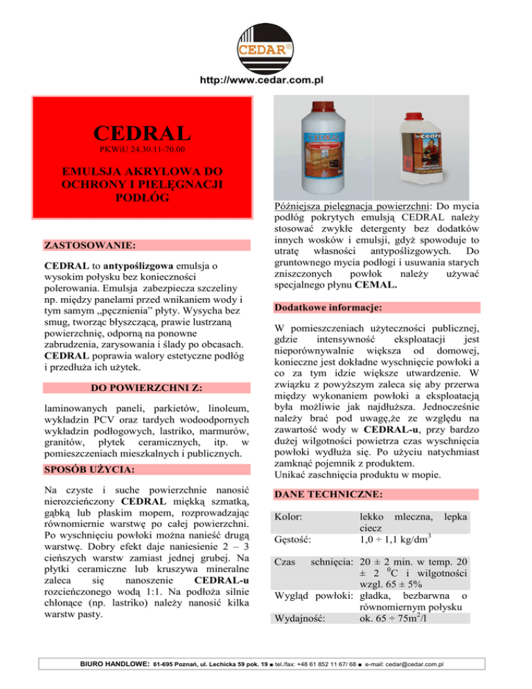 http://www.cedar.com.pl CEDRAL PKWiU 24.30.11-70.00 EMULSJA AKRYLOWA DO OCHRONY I PIELĘGNACJI PODŁÓG ZASTOSOWANIE: CEDRAL to antypoślizgowa emulsja o wysokim połysku bez konieczności polerowania. Emulsja zabezpiecza szczeliny np. między panelami przed wnikaniem wody i tym samym „pęcznienia” płyty. Wysycha bez smug, tworząc błyszczącą, prawie lustrzaną powierzchnię, odporną na ponowne zabrudzenia, zarysowania i ślady po obcasach. CEDRAL poprawia walory estetyczne podłóg i przedłuŜa ich uŜytek. DO POWIERZCHNI Z: laminowanych paneli, parkietów, linoleum, wykładzin PCV oraz tardych wodoodpornych wykładzin podłogowych, lastriko, marmurów, granitów, płytek ceramicznych, itp. w pomieszczeniach mieszkalnych i publicznych. SPOSÓB UśYCIA: Na czyste i suche powierzchnie nanosić nierozcieńczony CEDRAL miękką szmatką, gąbką lub płaskim mopem, rozprowadzając równomiernie warstwę po całej powierzchni. Po wyschnięciu powłoki moŜna nanieść drugą warstwę. Dobry efekt daje naniesienie 2 – 3 cieńszych warstw zamiast jednej grubej. Na płytki ceramiczne lub kruszywa mineralne zaleca się nanoszenie CEDRAL-u rozcieńczonego wodą 1:1. Na podłoŜa silnie chłonące (np. lastriko) naleŜy nanosić kilka warstw pasty. Późniejsza pielęgnacja powierzchni: Do mycia podłóg pokrytych emulsją CEDRAL naleŜy stosować zwykłe detergenty bez dodatków innych wosków i emulsji, gdyŜ spowoduje to utratę własności antypoślizgowych. Do gruntownego mycia podłogi i usuwania starych zniszczonych powłok naleŜy uŜywać specjalnego płynu CEMAL. Dodatkowe informacje: W pomieszczeniach uŜyteczności publicznej, gdzie intensywność eksploatacji jest nieporównywalnie większa od domowej, konieczne jest dokładne wyschnięcie powłoki a co za tym idzie większe utwardzenie. W związku z powyŜszym zaleca się aby przerwa między wykonaniem powłoki a eksploatacją była moŜliwie jak najdłuŜsza. Jednocześnie naleŜy brać pod uwagę,Ŝe ze względu na zawartość wody w CEDRAL-u, przy bardzo duŜej wilgotności powietrza czas wyschnięcia powłoki wydłuŜa się. Po uŜyciu natychmiast zamknąć pojemnik z produktem. Unikać zaschnięcia produktu w mopie. DANE TECHNICZNE: Kolor: Gęstość: lekko mleczna, ciecz 1,0 ÷ 1,1 kg/dm3 Czas lepka schnięcia: 20 ± 2 min. w temp. 20 ± 2 0C i wilgotności wzgl. 65 ± 5% Wygląd powłoki: gładka, bezbarwna o równomiernym połysku Wydajność: ok. 65 ÷ 75m2/l BIURO HANDLOWE: 61-695 Poznań, ul. Lechicka 59 pok. 19 ■ tel./fax: +48 61 852 11 67/ 68 ■ e-mail: [email protected] INFORMACJE DOTYCZĄCE BEZPIECZNEGO STOSOWANIA: Chronić przed dziećmi. W czasie stosowania wskazane jest uŜywanie ochronnych rękawiczek. W przypadku dostania się do oka płukać duŜą ilością letniej, bieŜącej wody. W razie połknięcia niezwłocznie zasięgnij porady lekarza – pokaŜ opakowanie lub etykietę. Po zastosowaniu CEDRAL-u wietrzyć pomieszczenie do zaniku zapachu SKŁAD: Emulsja akrylowa wolna od soli metalicznych, wosk, substancje pomocnicze, Methylchloroisothiazolinone, Methylisothiazolinone. MAGAZYNOWANIE: Wyrób naleŜy magazynować i składać w pomieszczeniach suchych, w temp. 5 ÷ 35ºC, w opakowaniach nienaraŜonych na bezpośrednie działanie promieni słonecznych oraz na przemroŜenie. Okres gwarancji: 24 miesiące. TRANSPORT: Wyrób bezpieczny. Przewozić zgodnie z ogólnymi warunkami transportu. Chronić przed przegrzaniem i przemroŜeniem. OPAKOWANIA: 0,5l; 1l; 5l lub wg indywidualnych uzgodnień. http://www.cedar.com.pl BIURO HANDLOWE: 61-695 Poznań, ul. Lechicka 59 pok. 19 ■ tel./fax: +48 61 852 11 67/ 68 ■ e-mail: [email protected] Dane w niniejszej ulotce zostały napisane na podstawie wyników testów i doświadczeń prowadzonych w ściśle określonych warunkach. Nie mogą jednak stanowić podstawy do jakichkolwiek roszczeń. Obowiązkiem uŜytkownika jest upewnienie się, czy określony produkt ma zastosowanie do jego celów. UŜytkownik ponosi pełną odpowiedzialność za podjęcie wszystkich koniecznych środków bezpieczeństwa niezaleŜnie od tego czy są one wskazane w tym dokumencie. Zastrzegamy sobie prawo zmiany instrukcji bez uprzedniego zawiadomienia.
