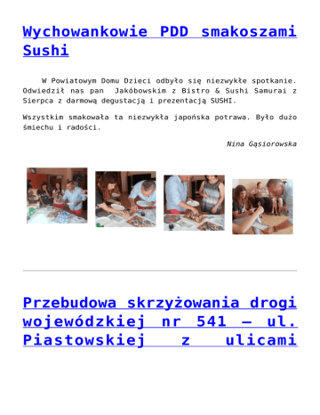 Wychowankowie PDD smakoszami Sushi W Powiatowym Domu Dzieci odbyło się niezwykłe spotkanie. Odwiedził nas pan Jakóbowskim z Bistro & Sushi Samurai z Sierpca z darmową degustacją i prezentacją SUSHI. Wszystkim smakowała ta niezwykła japońska potrawa. Było dużo śmiechu i radości. Nina Gąsiorowska Przebudowa skrzyżowania drogi wojewódzkiej nr 541 – ul. Piastowskiej z ulicami Traugutta i Świętokrzyskiej w mieście Sierpc 23 czerwca br. Komisja w składzie Michał Górecki – Kierownik Działu Technicznego RD Gostynin-Płock, Stanisław Piszczkiewicz wz. Kierownika OD-Bielsk, Michał Lazarowski Kierownik Budowy, Zbigniew Romański Kierownik Robót Drogowych, Włodzimierz Walerych Inspektor Nadzoru, Krzysztof Pawłowski Inspektor nadzoru drogowego powiatu oraz Artur Obrębski Dyrektor Zarządu Dróg Powiatowych w Sierpcu dokonali wprowadzenia Wykonawcy tj. PRD Sp. z o.o. Lipno na wykonanie następujących robót Przebudowa skrzyżowania drogi wojewódzkiej nr 541 – ul. Piastowskiej z ulicami Traugutta i Świętokrzyskiej mieście Sierpc. (rondo) w Celem przebudowy jest poprawa warunków bezpieczeństwa ruchu drogowego na istniejącym skrzyżowaniu. W ramach inwestycji zostaną wykonane następujące prace branży drogowej: 1. budowa ronda o parametrach ronda małego; 2. przebudowa ulic dochodzących do ronda (ul. Piastowska, 3. 4. 5. 6. 7. ul. Traugutta i ul. Świętokrzyska); przebudowa zjazdów; przebudowa i budowa chodników; budowa ścieżki rowerowej; wykonanie oznakowania poziomego i pionowego urządzeń bezpieczeństwa ruchu; plantowanie i obsianie nasionami traw zieleńców. oraz Przebudowa skrzyżowan ia drogi wojewódzki ej nr 541 – ul. Piastowski ej z ulicami Traugutta i Świętokrzy skiej (rondo) w mieście Sierpc Szkolenie LGD Partnerstwo" "Sierpeckie W dniu 21 czerwca 2016 roku odbyło się szkolenie wewnętrzne dla członków Rady, Zarządu i pracowników Biura Stowarzyszenia LGD „Sierpeckie Partnerstwo”. Celem szkolenia było zapoznanie się z istotnymi kwestiami oraz planowanymi działaniami LGD związanymi z nową Lokalną Strategią Rozwoju. Szkolenie miało charakter informacyjny i obejmowało następujące zagadnienia: Aktualne akty prawne odnoszące się do Rozwoju Lokalnego Kierowanego przez Społeczność – na poziomie regionalnym, krajowym i wspólnotowym; Zobowiązania wynikające z umowy ramowej podpisanej w dniu 17 maja 2016 roku; Lokalna Strategia Rozwoju na lata 2016-2022 – cele ogólne, szczegółowe, przedsięwzięcia oraz wskaźniki oddziaływania, rezultatu i produktu; Budżet LSR w powiązaniu z celami; Zapoznanie z kryteriami wyboru operacji w ramach LSR. LGD Sierpc Został już tylko tydzień na składanie wniosków o dopłaty do materiału siewnego Tylko do 27 czerwca 2016 r. producenci rolni mogą składać wnioski w Agencji Rynku Rolnego o przyznanie dopłat z tytułu zużytego do siewu lub sadzenia materiału siewnego kategorii elitarny lub kwalifikowany. Dotychczas do ARR wpłynęło ponad 40 tys. wniosków. Wsparcie jest udzielane do powierzchni gruntów ornych obsianych lub obsadzonych materiałem siewnym kategorii elitarny lub kwalifikowany gatunków roślin uprawnych, zakupionym i wysianym/wysadzonym w okresie od 15 lipca 2015 r. do 15 czerwca 2016 r. Dopłatami objęte są następujące gatunki roślin: zboża: pszenica zwyczajna, pszenica twarda, żyto (populacyjne, syntetyczne lub mieszańcowe), jęczmień, pszenżyto, owies, rośliny strączkowe: łubin (żółty, wąskolistny lub biały), groch siewny, bobik, soja, wyka siewna, rośliny okopowe: ziemniak mieszanki zbożowe i pastewne sporządzone z ww. roślin objętych systemem dopłat, z wyłączeniem ziemniaka. O wsparcie mogą ubiegać się także producenci rolni, których uprawy zostały zniszczone w wyniku działania niskich temperatur. Warunkiem otrzymania dopłaty jest zakupienie i zużycie do siewu lub sadzenia materiału siewnego, a także dołączenie dokumentów potwierdzających zakup materiału siewnego i wystąpienie szkody w uprawach. Wnioski wraz z załącznikami można składać osobiście w Oddziale Terenowym właściwym dla miejsca zamieszkania albo wysłać pocztą. O terminie złożenia wysłanego wniosku decyduje data stempla pocztowego. Wniosek można wypełnić poprzez aplikację ELF dostępną na stronie https://elf.arr.gov.pl. Wnioski na bieżąco są weryfikowane pod względem formalnoprawnym. Stawki dopłat zostaną określone po upłynięciu terminu ich składania, w drodze rozporządzenia Rady Ministrów w terminie do 30 września. Natomiast środki finansowe zostaną wypłacone w terminie 30 dni od wydania decyzji przyznających dopłaty, najpóźniej do końca 2016 r. Niezbędne dokumenty znajdują się na stronie Agencji Rynku Rolnego w zakładce materiał siewny (http://www.arr.gov.pl/wsparcie-rynkowe/material-siewny). materiał siewny ZBADAJ SIĘ I ZYSKAJ SPOKÓJ MAMMOGRAFIA ! Serdecznie zapraszamy wszystkie Panie w wieku 50 – 69 lat na bezpłatną mammografię w ramach Populacyjnego Programu Wczesnego Wykrywania Raka Piersi. Panie w wieku 40-49 oraz 70-75 lat zapraszamy na bezpłatne badania, finansowane z Funduszy Norweskich! Konieczna wcześniejsza rejestracja i skierowanie lekarskie. Mochowo – 6 lipca przy Gimnazjum. Szczutowo – 6 lipca przy Urzędzie Gminy, Lipowa 5A. KONKURS „PRZYRODA PRZYJACIEL” – TWÓJ 16 czerwca 2016 r. w Liceum Ogólnokształcącym im. mjra Henryka Sucharskiego w Sierpcu odbyło się podsumowanie konkursu prac plastycznych, opisowych i fotograficznych dla dzieci i młodzieży pod hasłem „PRZYRODA – TWÓJ PRZYJACIEL”, z tematem wiodącym XXXIX Edycji 2016 „Mój ulubiony owad”. Organizatorem przedsięwzięcia jest Zarząd Okręgu Ligi Ochrony Przyrody w Płocku przy współpracy Zarządu Okręgu Mazowieckiego Polskiego Związku Wędkarskiego w Warszawie oraz Miejskiego Ogrodu Zoologicznego w Płocku. Celem tego działania edukacyjnego jest pogłębienie przez uczniów wiedzy 