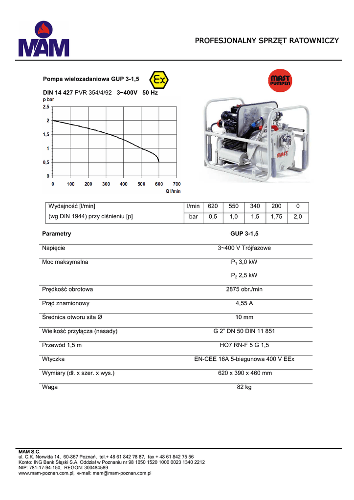 PROFESJONALNY SPRZĘT RATOWNICZY Pompa wielozadaniowa GUP 3-1,5 DIN 14 427 PVR 354/4/92 3~400V 50 Hz Wydajność [l/min] (wg DIN 1944) przy ciśnieniu [p] l/min 620 550 340 200 0 bar 0,5 1,0 1,5 1,75 2,0 Parametry GUP 3-1,5 Napięcie 3~400 V Trójfazowe Moc maksymalna P1 3,0 kW P2 2,5 kW Prędkość obrotowa 2875 obr./min Prąd znamionowy 4,55 A Średnica otworu sita Ø 10 mm Wielkość przyłącza (nasady) G 2” DN 50 DIN 11 851 Przewód 1,5 m Wtyczka HO7 RN-F 5 G 1,5 EN-CEE 16A 5-biegunowa 400 V EEx Wymiary (dł. x szer. x wys.) Waga MAM S.C. ul. C.K. Norwida 14, 60-867 Poznań, tel.+ 48 61 842 78 87, fax + 48 61 842 75 56 Konto: ING Bank Śląski S.A. Oddział w Poznaniu nr 98 1050 1520 1000 0023 1340 2212 NIP: 781-17-94-150, REGON: 300484589 www.mam-poznan.com.pl, e-mail: [email protected] 620 x 390 x 460 mm 82 kg PROFESJONALNY SPRZĘT RATOWNICZY Pompa wirnikowa EEx MAST GUP 3-1,5 - DN50 ze stali szlachetnej, do przepompowywania agresywnych cieczy, olejów mineralnych i palnych cieczy grupy wybuchowej IIA i IIB i grupy temp. T1 do T3; kwasoodporne i ługoodporne wykonanie; jednostopniowa pompa wirowa, silnik trójfazowy 400 V; 50 Hz; EExeIIT3 o mocy P1 = 3,0 kW, z Ex wyłącznikiem zabezpieczającym; wtyczka EEx do II C T6 400 V, kabel o dł. 1,5 m. Z wbudowaną dodatkową ręczną pompą odpowietrzającą, wysokość ssania do 8,4 m; przyłącza DN 50; wymiary 620 x 390 x 460 mm; waga 82 kg; średnica przepompowywanych ziaren do 10 mm; gniazdo do lampy 220 V Ex Wydajności maksymalna 620 l/min; ciśnienie maksymalne 2 bar. MAM S.C. ul. C.K. Norwida 14, 60-867 Poznań, tel.+ 48 61 842 78 87, fax + 48 61 842 75 56 Konto: ING Bank Śląski S.A. Oddział w Poznaniu nr 98 1050 1520 1000 0023 1340 2212 NIP: 781-17-94-150, REGON: 300484589 www.mam-poznan.com.pl, e-mail: [email protected]
